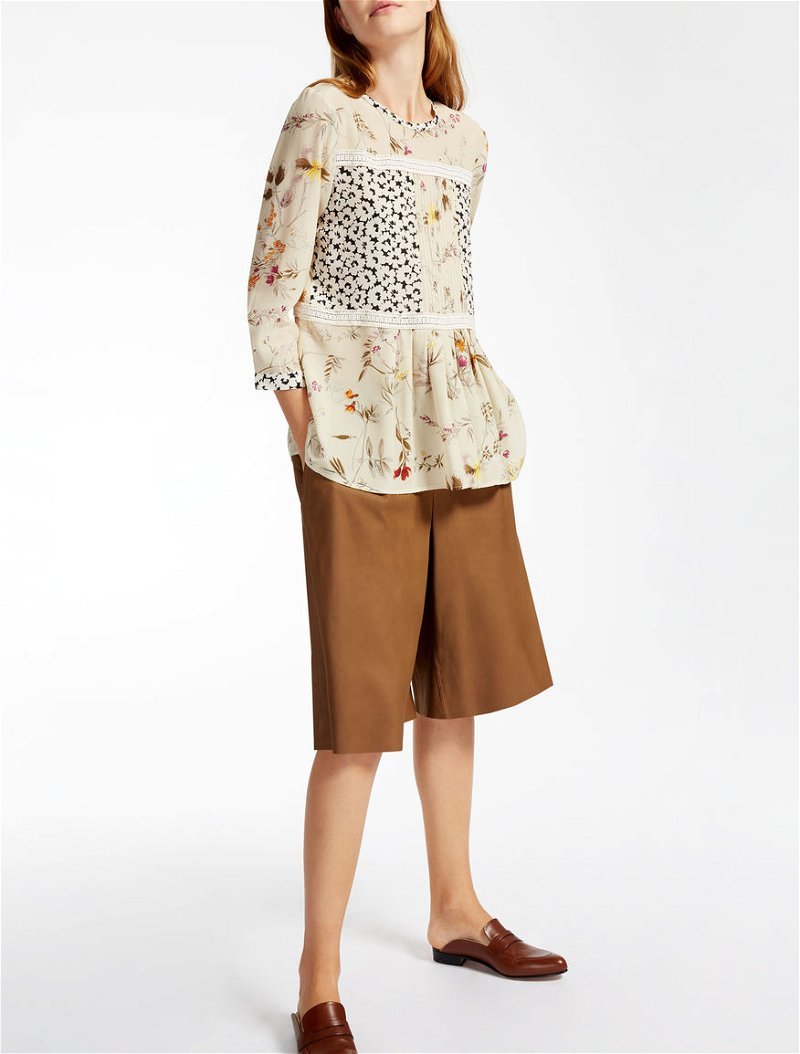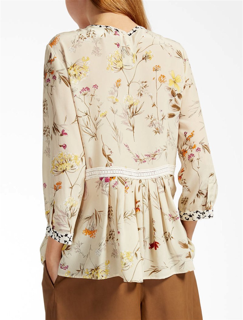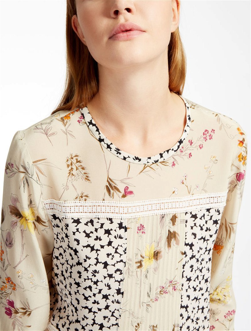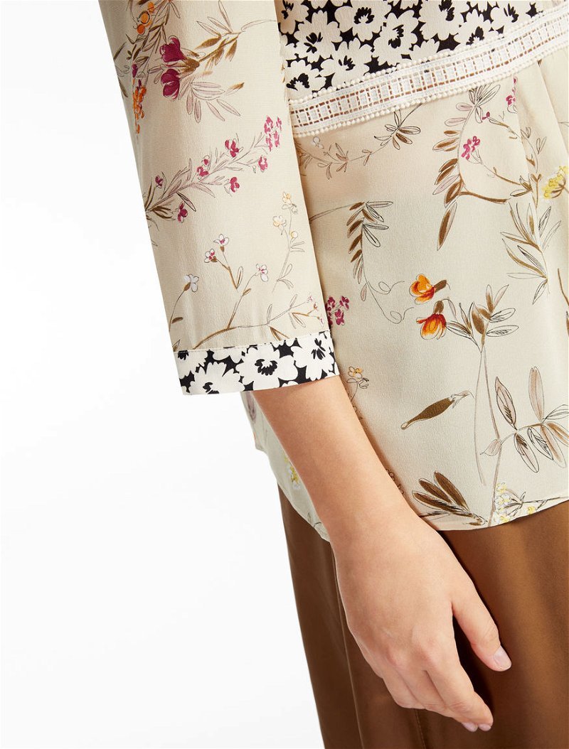 Блуза, виготовлена з високоякісного шовкового крепу, з комбінацією різних принтів: квіткового візерунка та графічного.