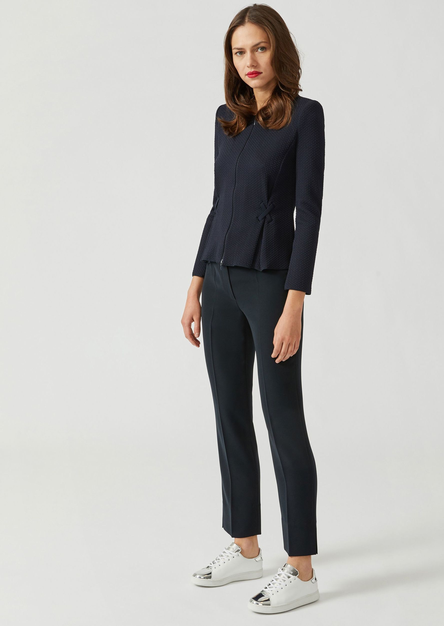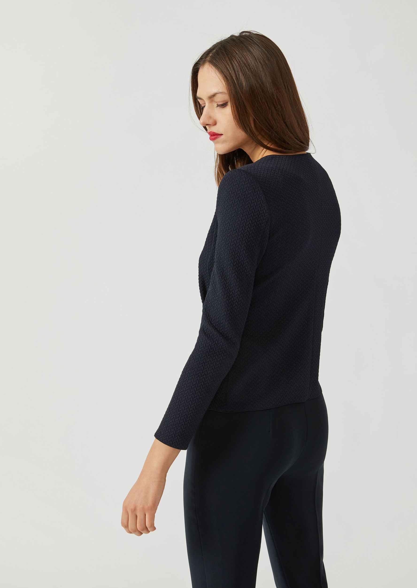 Жакет приталеного крою, виготовлений з поліаміду. Модель має двосторонню застібку на блискавку та круглий виріз.