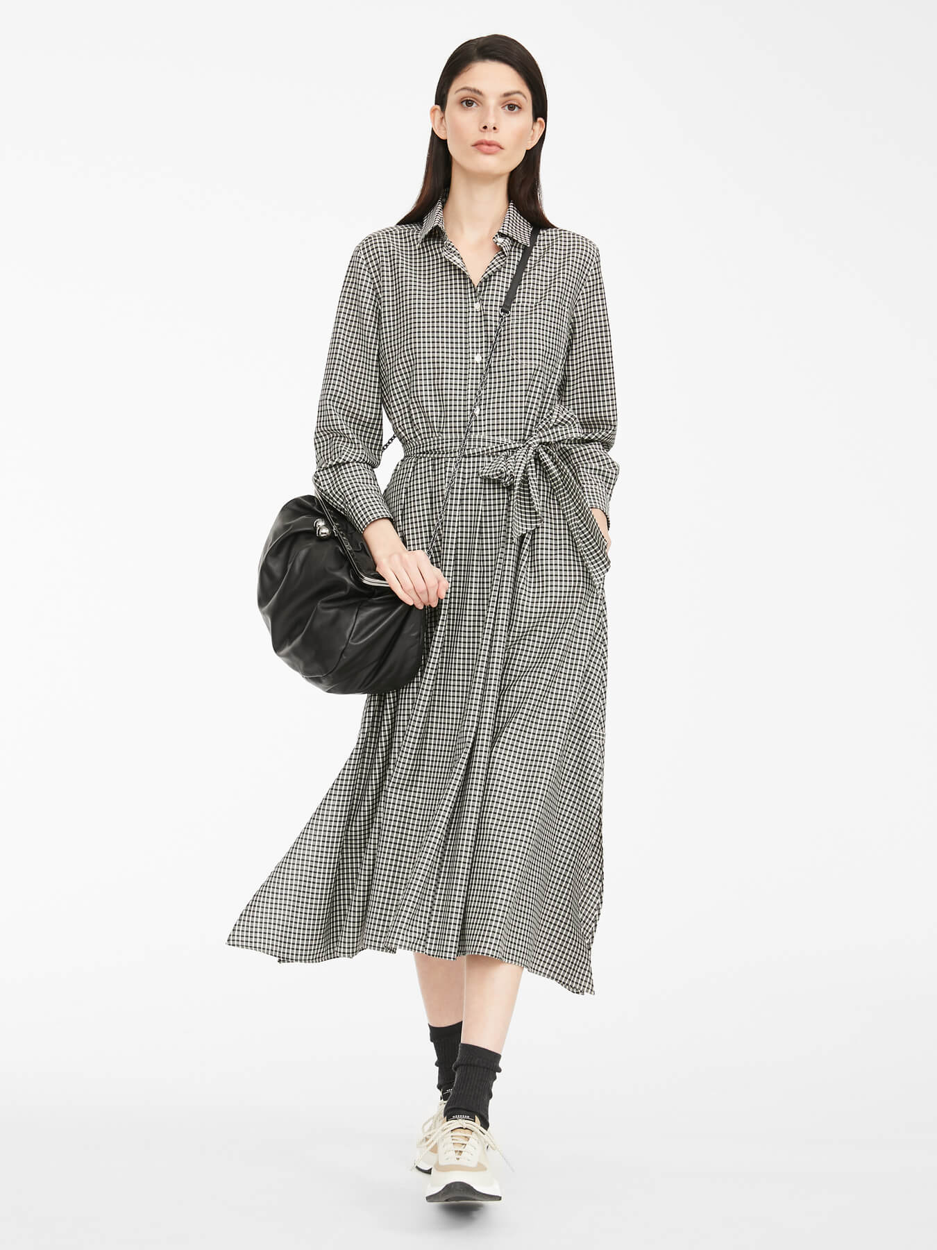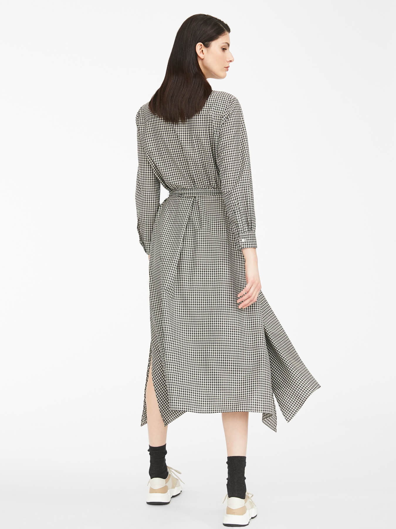 Сукня-сорочка, виконана з чистої вовни, з накладною кишенею на грудях, рукавами втачними з манжетами і накладними бічними кишенями. Модель без підкладки, застібка на гудзики.
