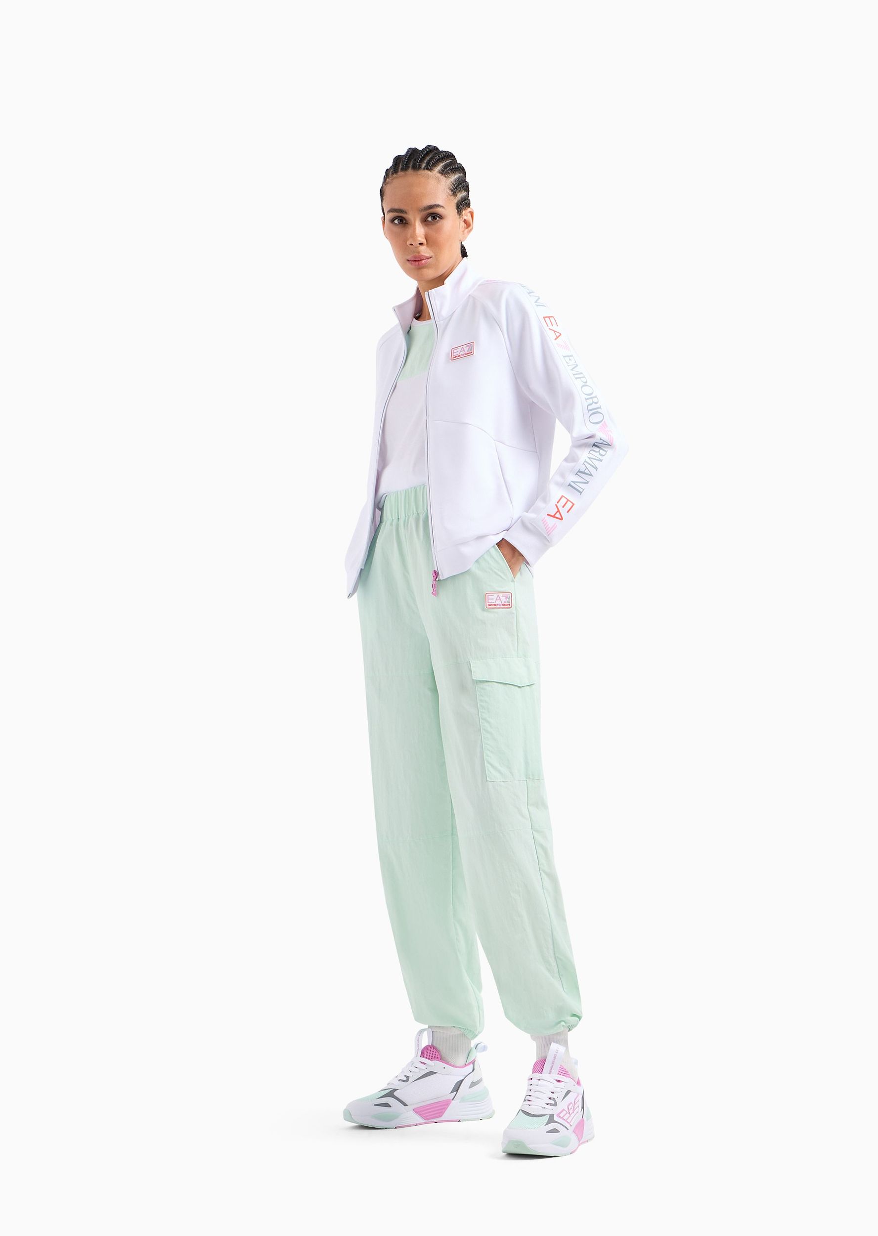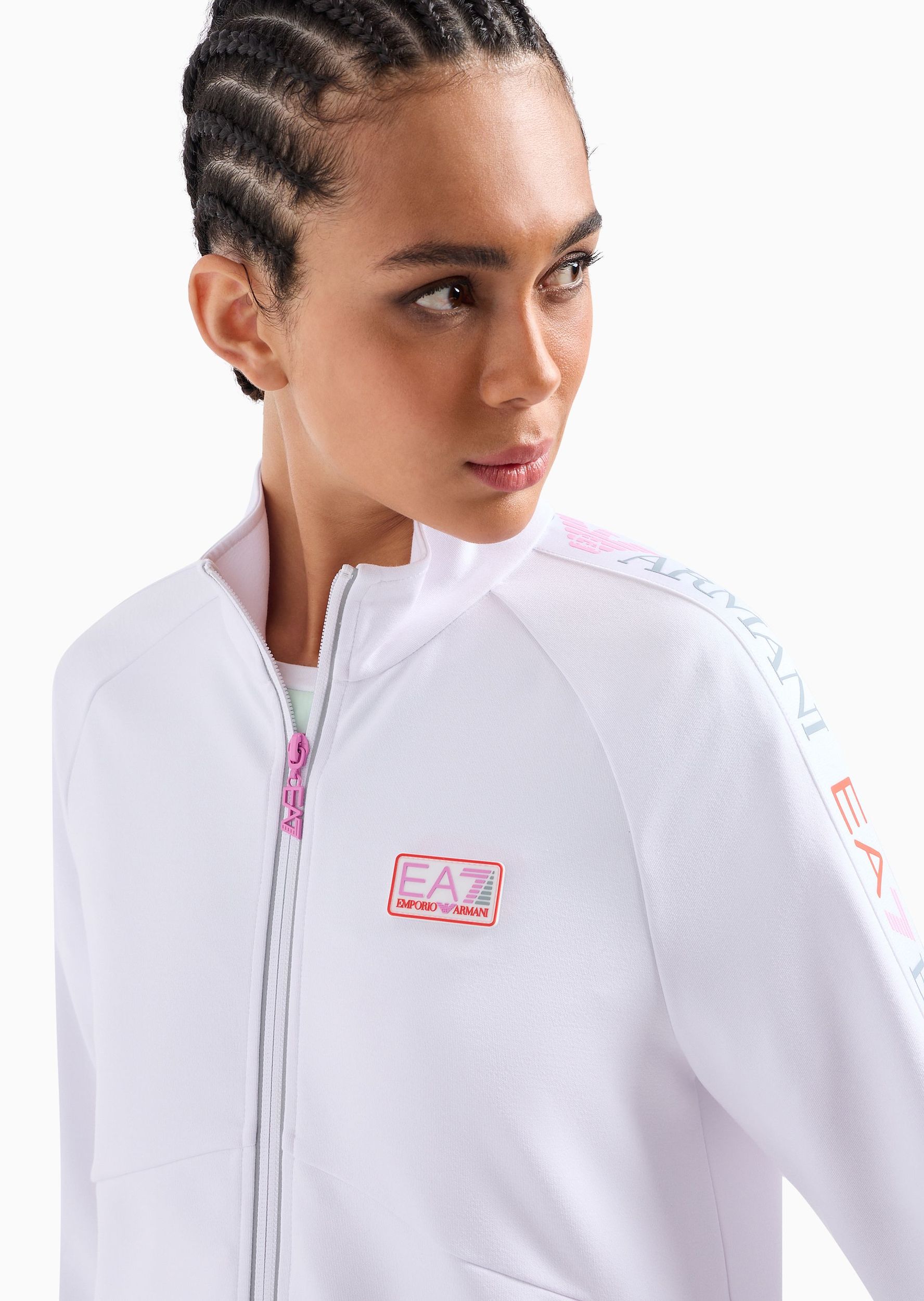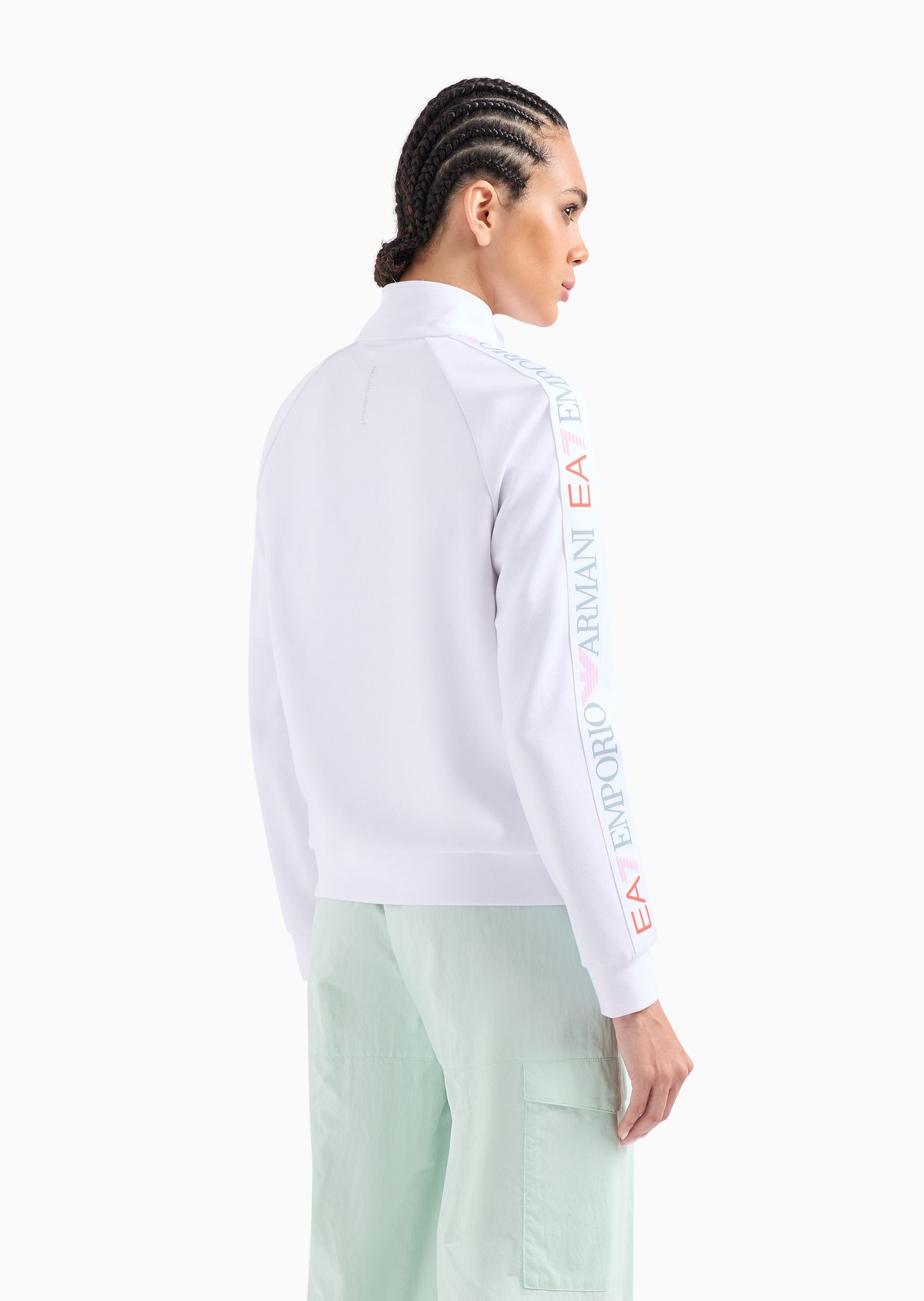 Спортивна кофта з натуральної тканини, із застібкою-блискавкою та двома бічними кишенями, має стрічку з логотипом, яка прикрашає рукава.
