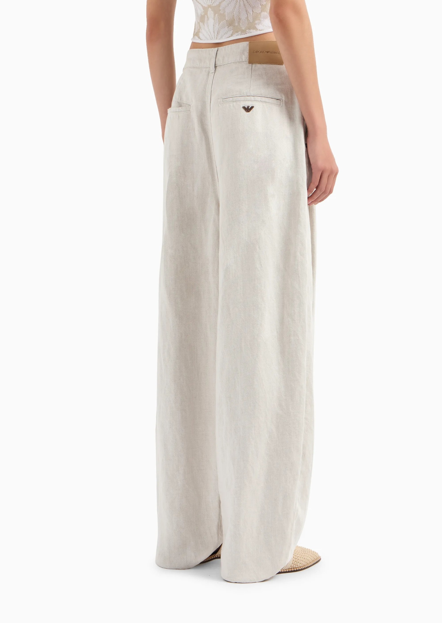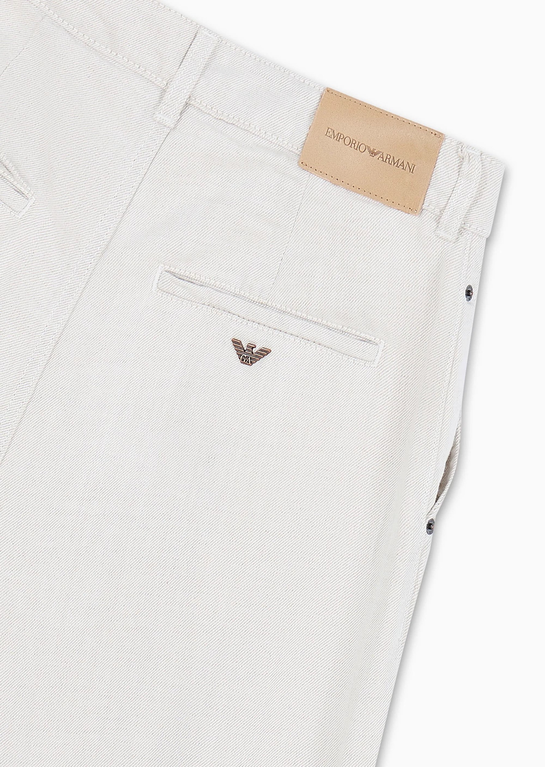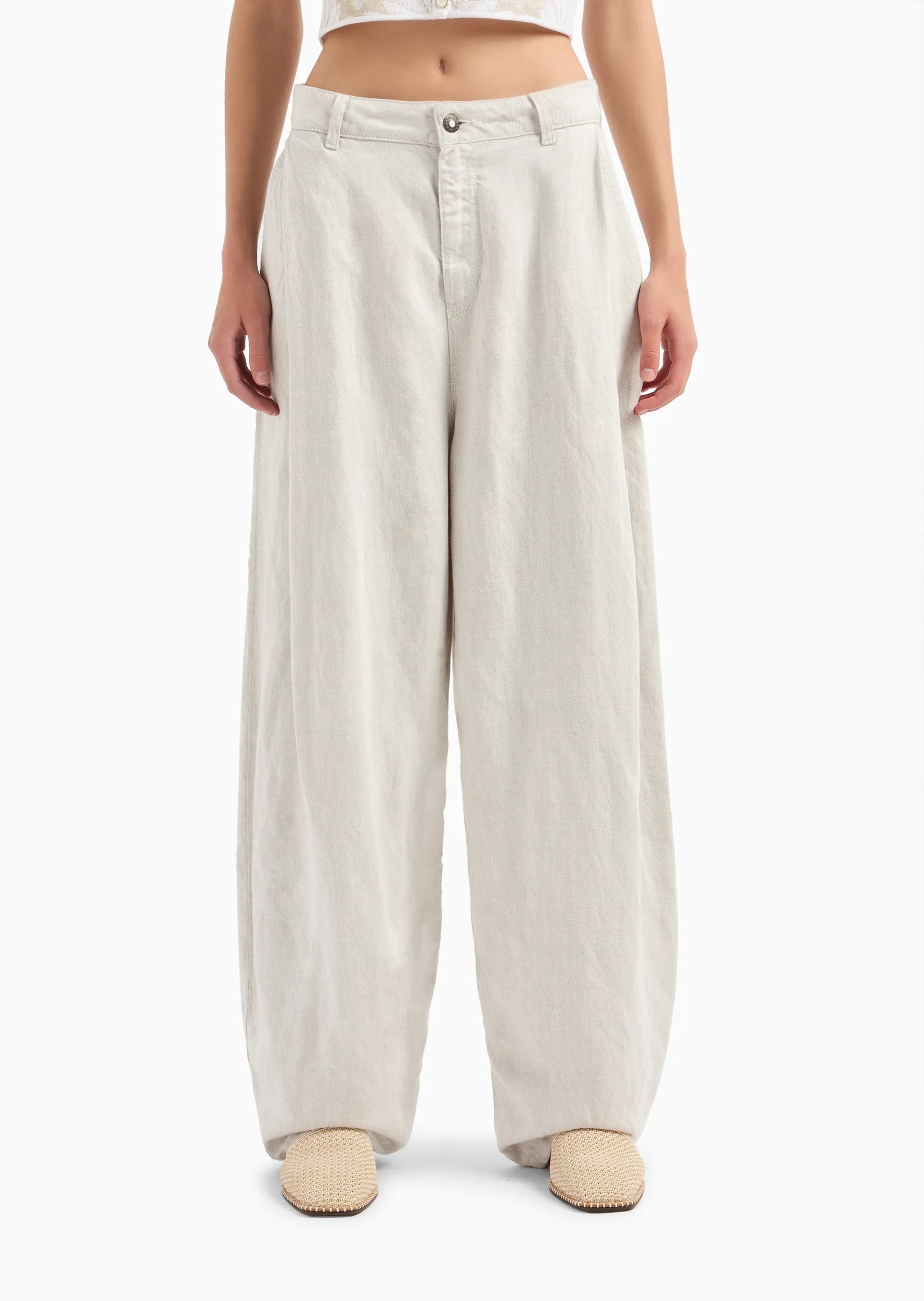 Брюки з пятьма кишенями та великими стрілками спереду. Текстура з переплетенням імітує діагональні ребра деніму, залишаючись м’якою на дотик завдяки суміші льону та ліоцелю, яке робить тканину особливо легкою, м’якою, дихаючою і міцною.