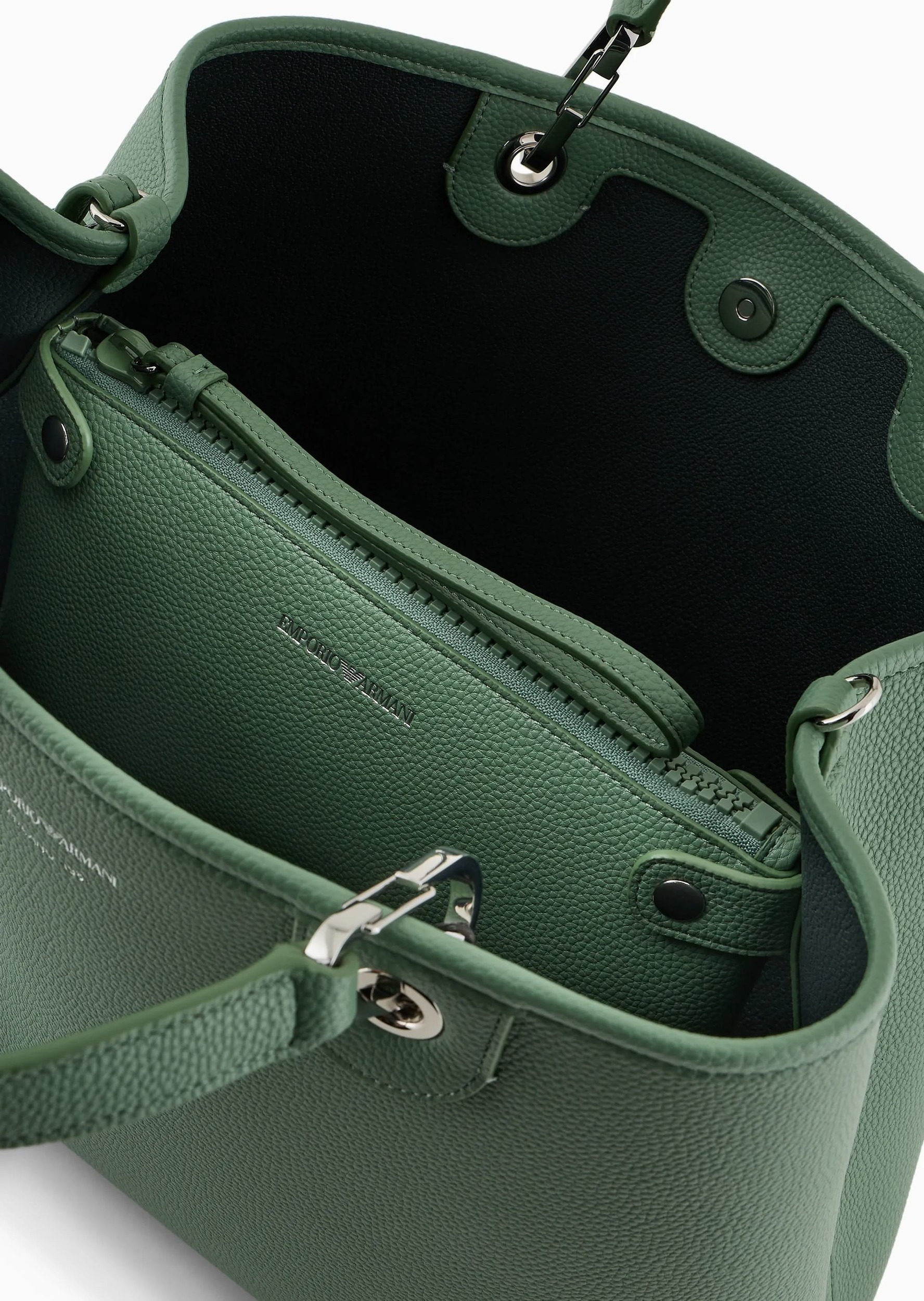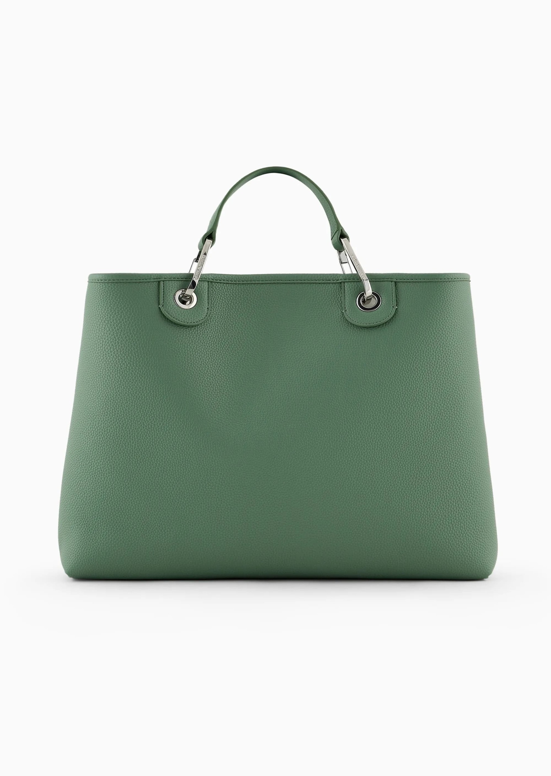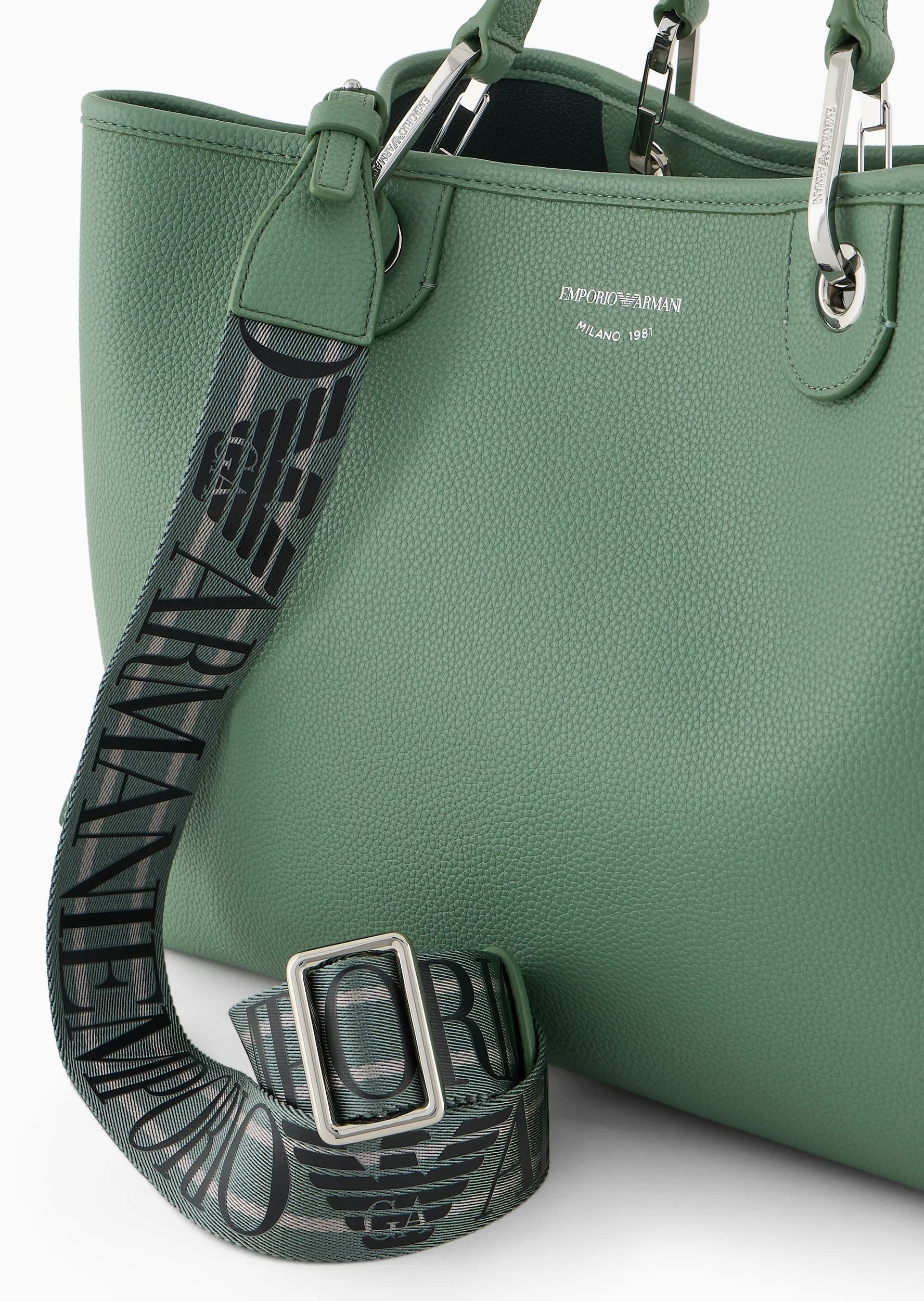 Середня сумка для покупок. Магнітна застібка та логотип із шовкографією. Прикрашена знімними золотистими затискачами-карабінами та бірками з тисненим логотипом. Має внутрішню сумку на блискавці та знімний плечовий ремінь з логотипом.