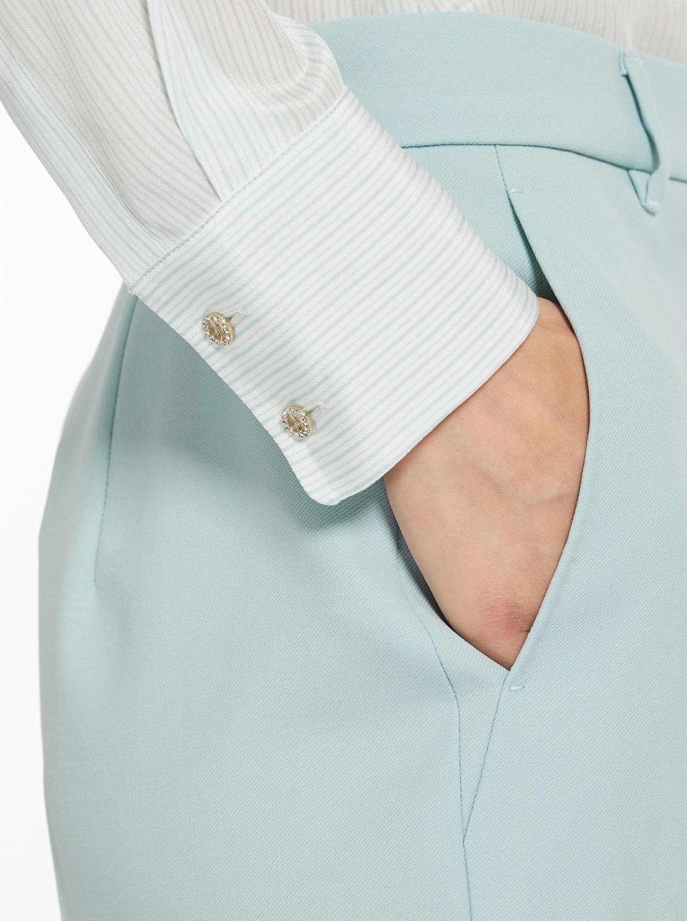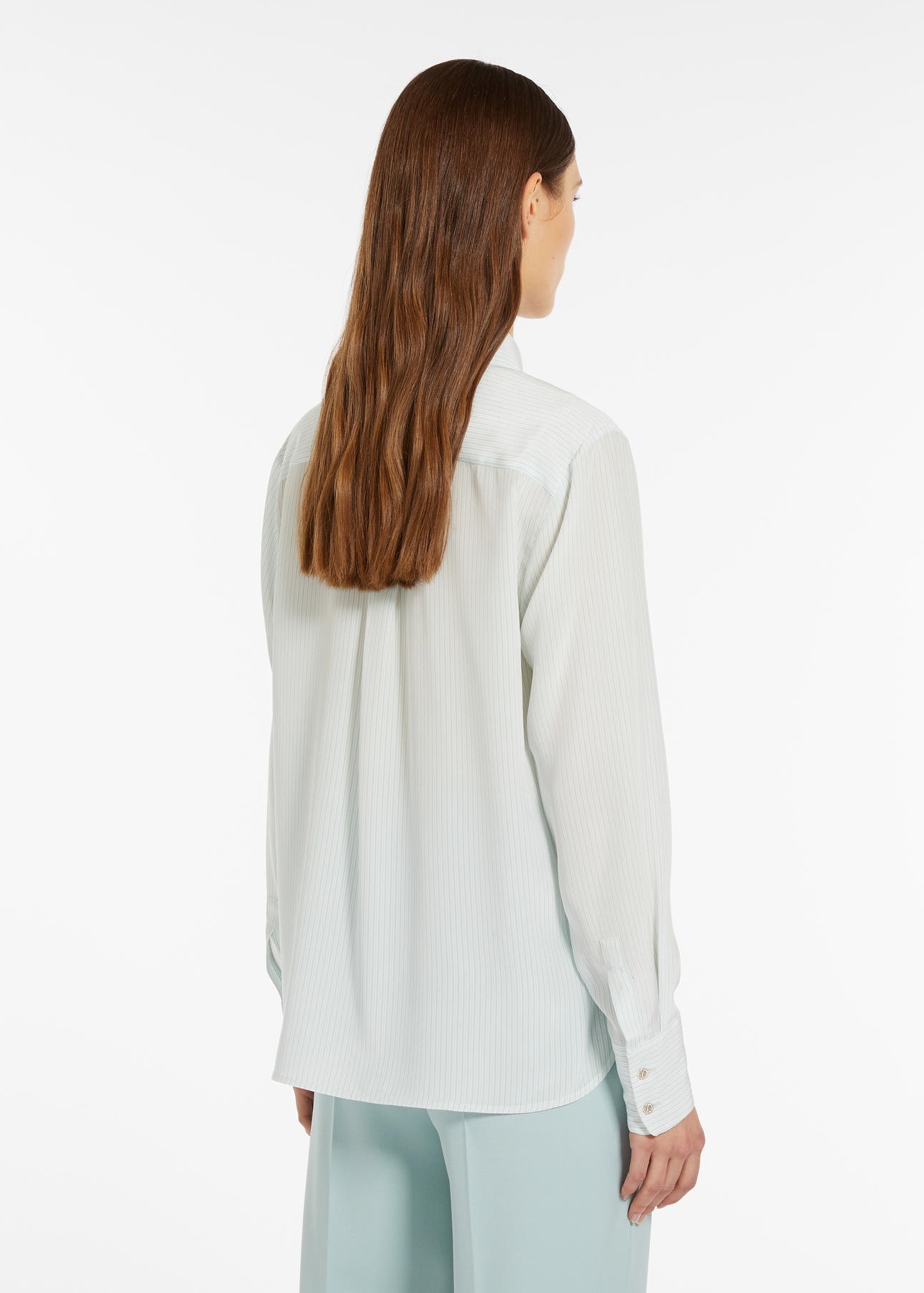 Сорочка в чоловічому стилі з розкішного крепу з мотивом у смужку та маленькими ґудзиками на комірі та манжетах. Одяг має класичний комір, довгі втачені рукави та закруглений низ із розрізами з боків. Прихована застібка на гудзики.