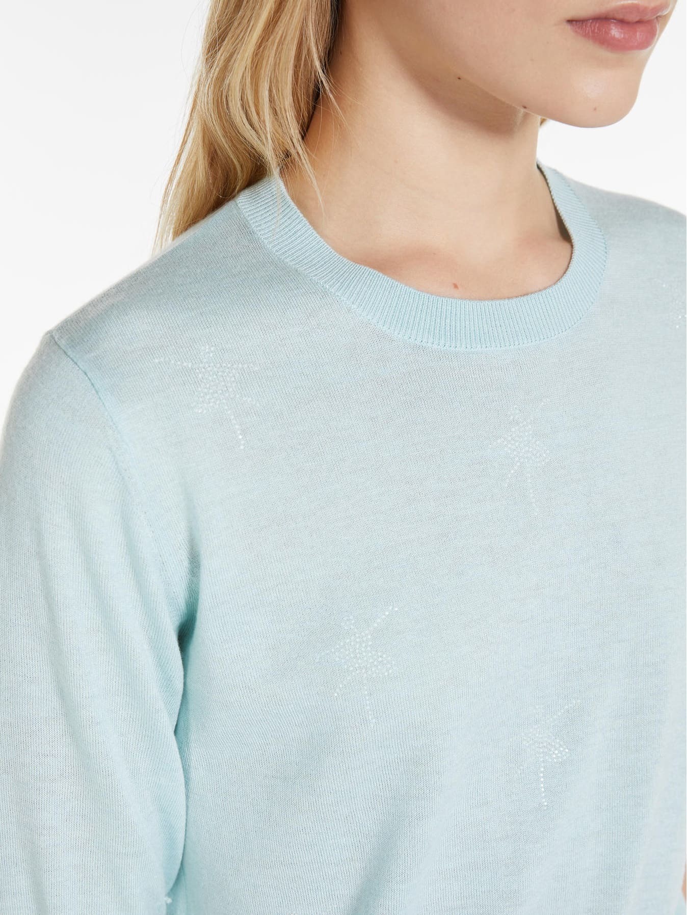 Светр з коротким рукавом із вовняної та шовкової пряжі, прикрашений візерунком маленьких балерин спереду. Трикотажні планки в рубчик.