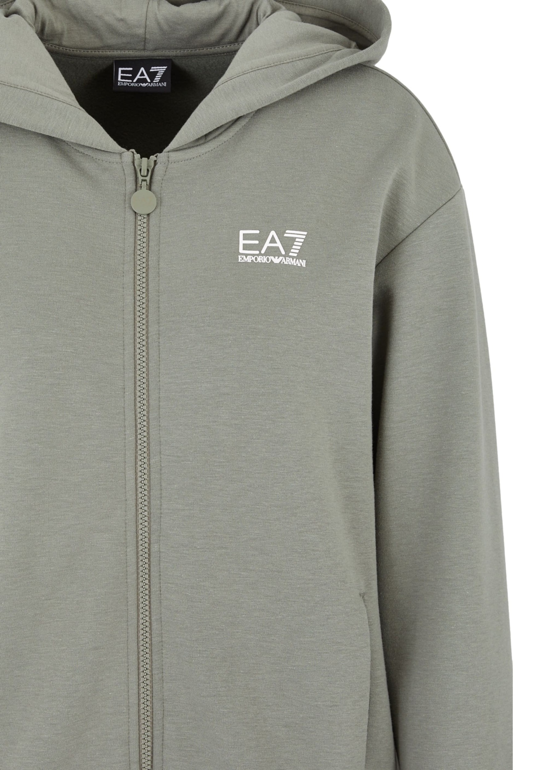 Мінімалістичний спортивний костюм із затишної бавовни на флісі. У комплекті толстовка з капюшоном та на блискавці, з двома бічними кишенями та штани-джогери з контрастним логотипом ЕА7.