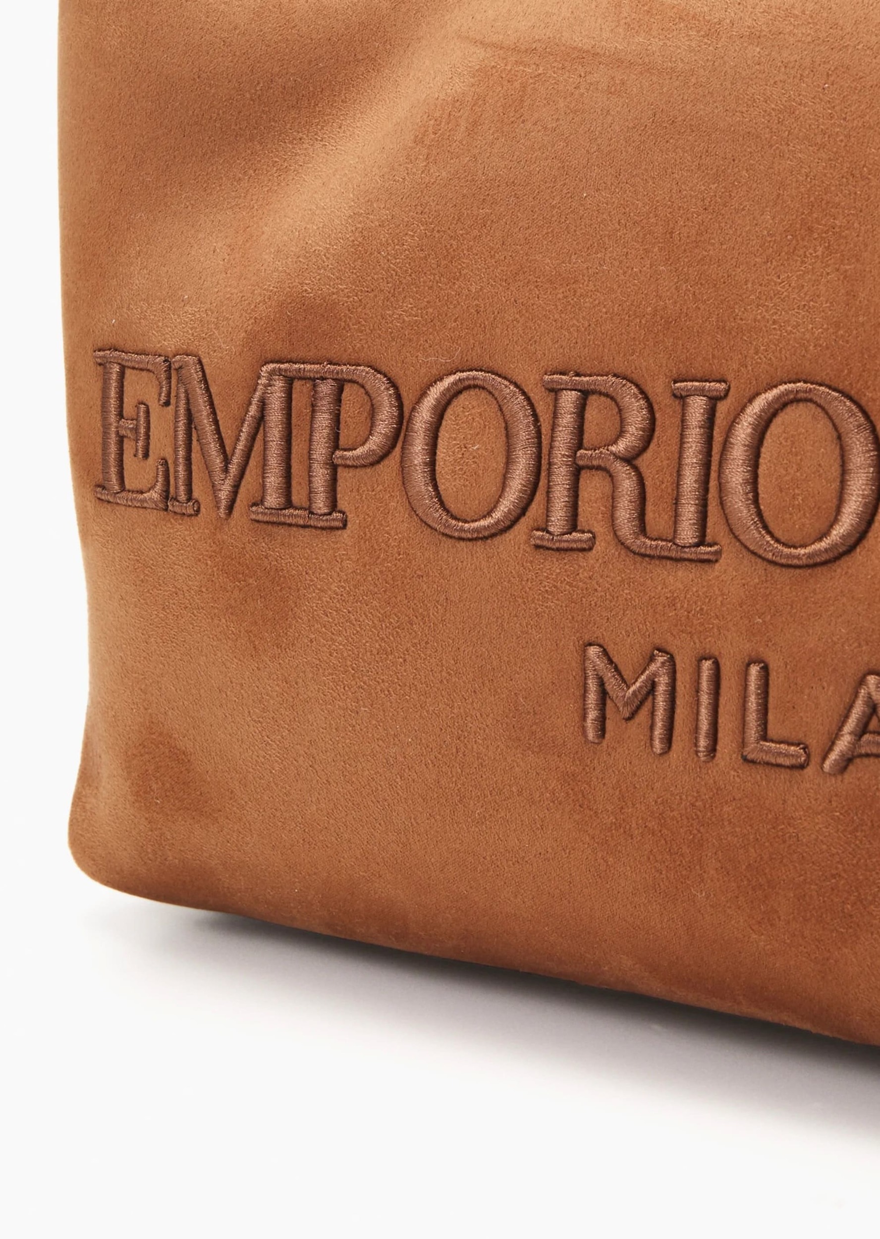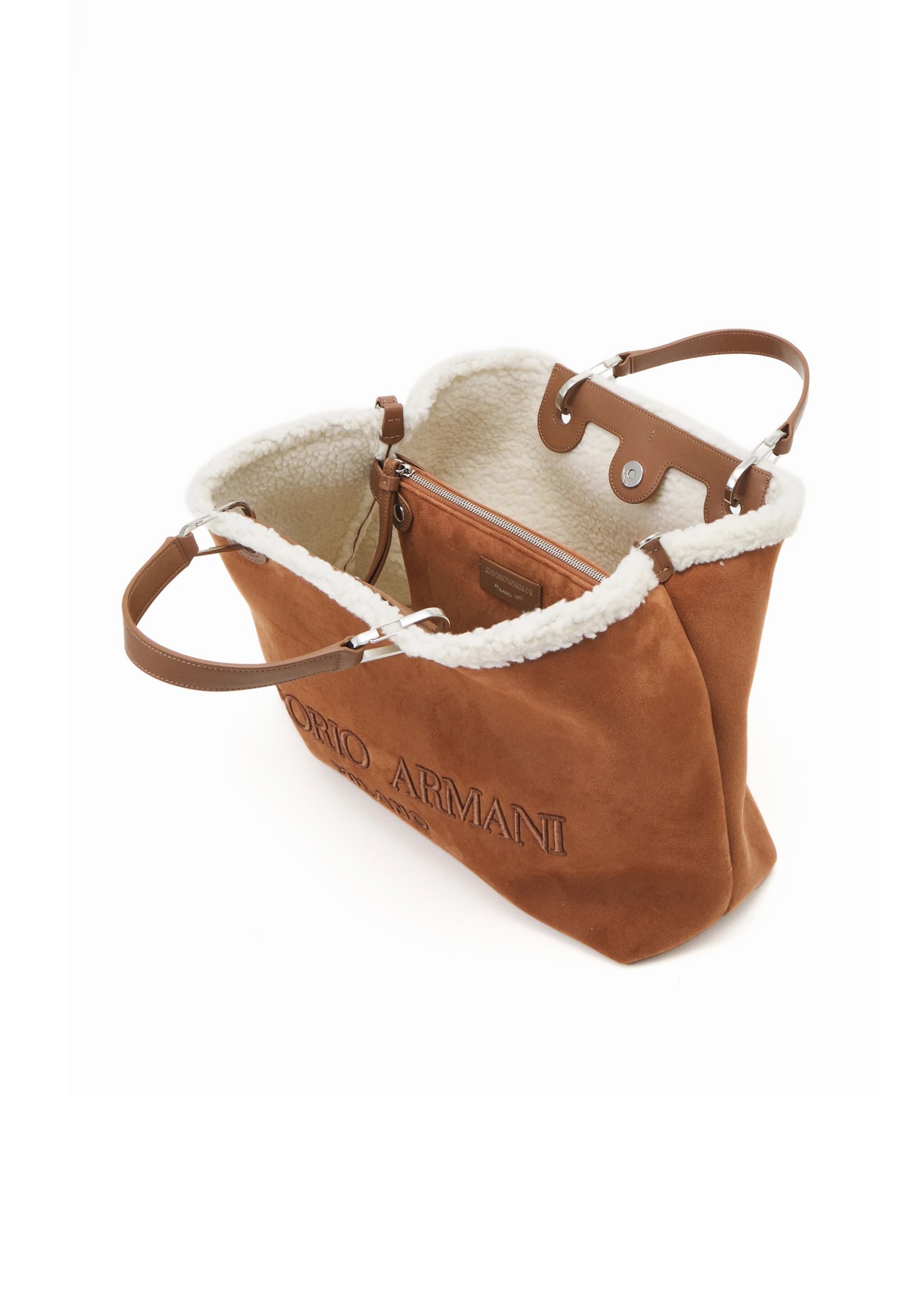 Велика сумка-шоппер, виготовлена з еко-хутра, в коричневому кольорі. Модель зі зйомним ременем та косметичкою. Застібається кнопкою.