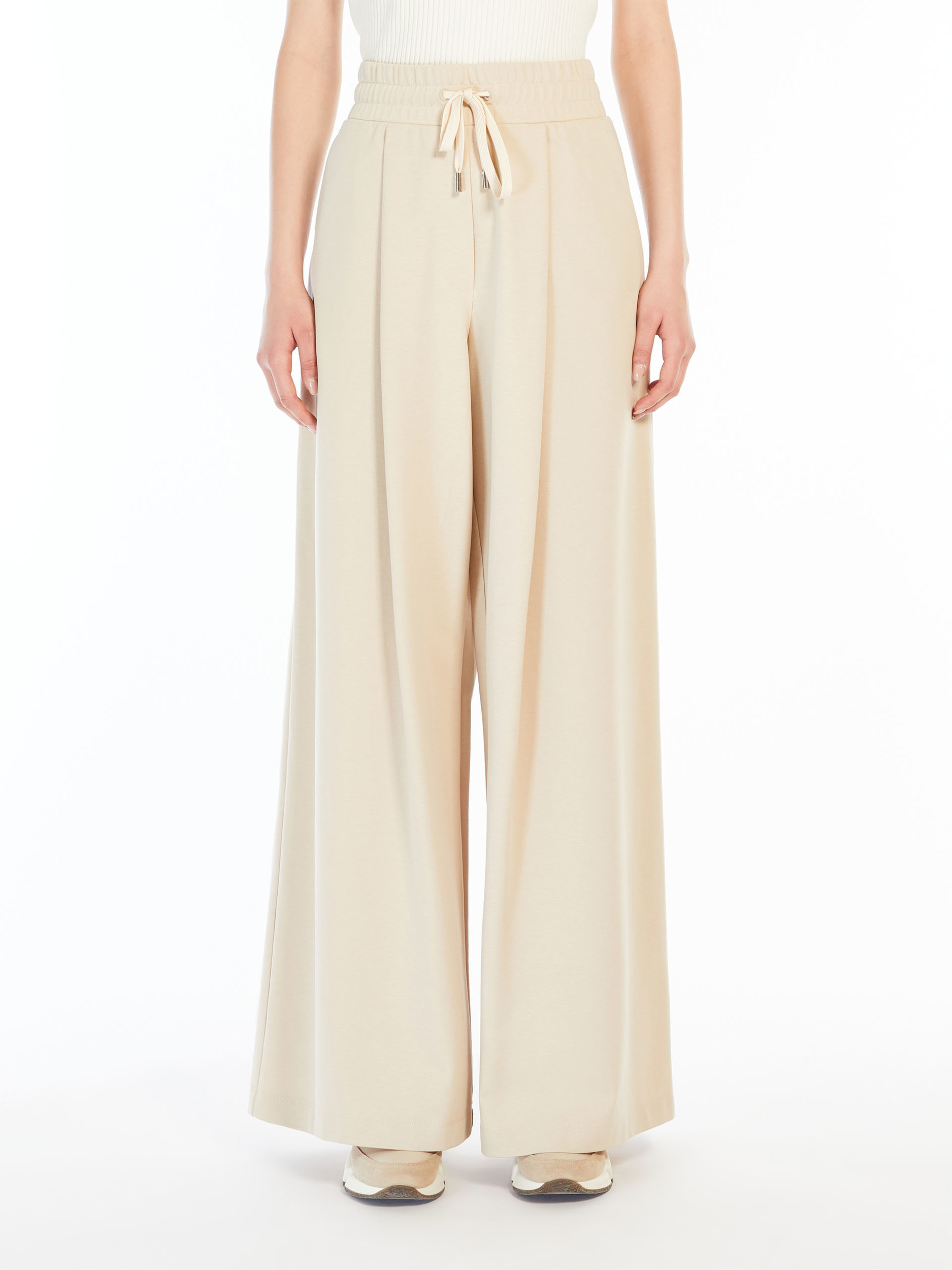 Штани, виповнені з мякого бавовняного джерсі-ліоцелу, з широкими штанинами та глибокими складками спереду. Еластичний пояс, регульований шнурком, та бічні кишені у швах.