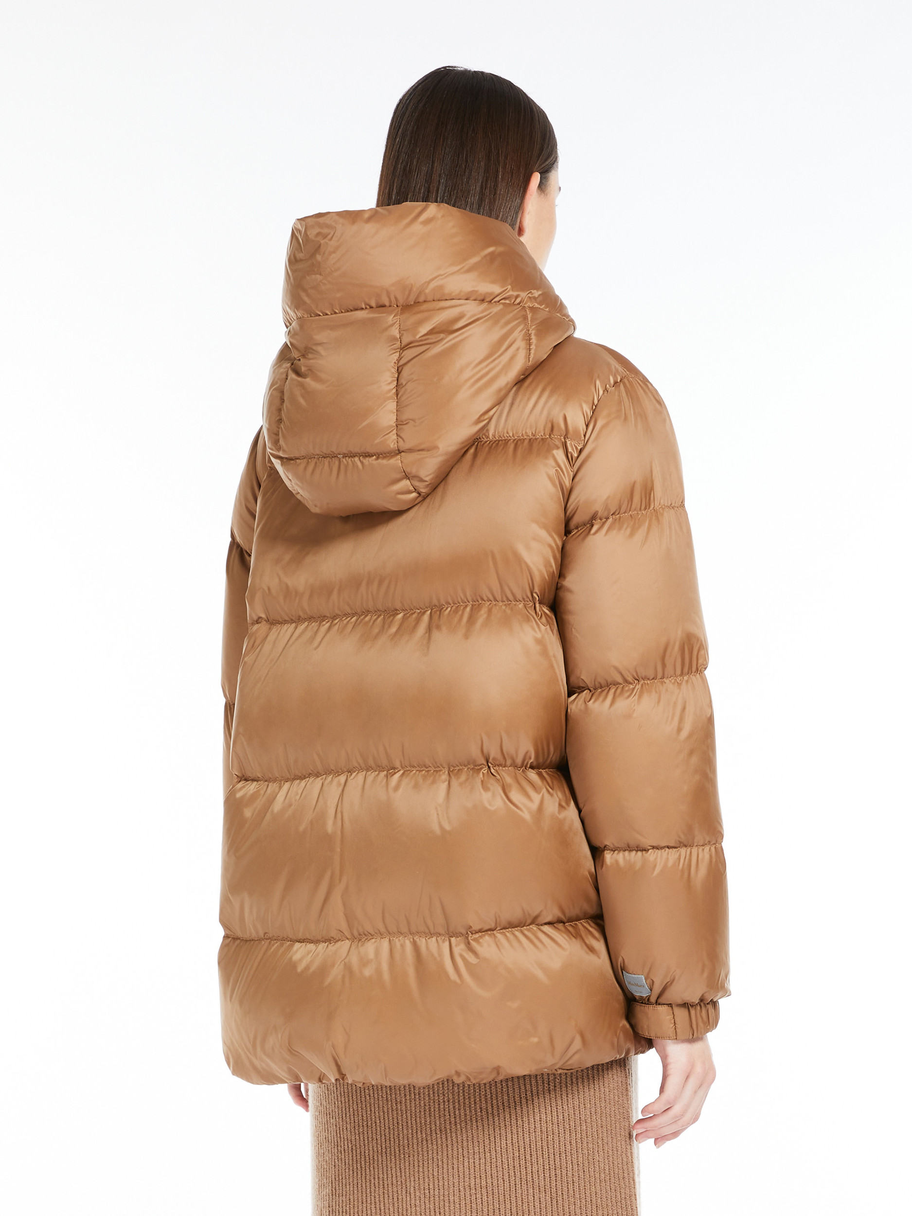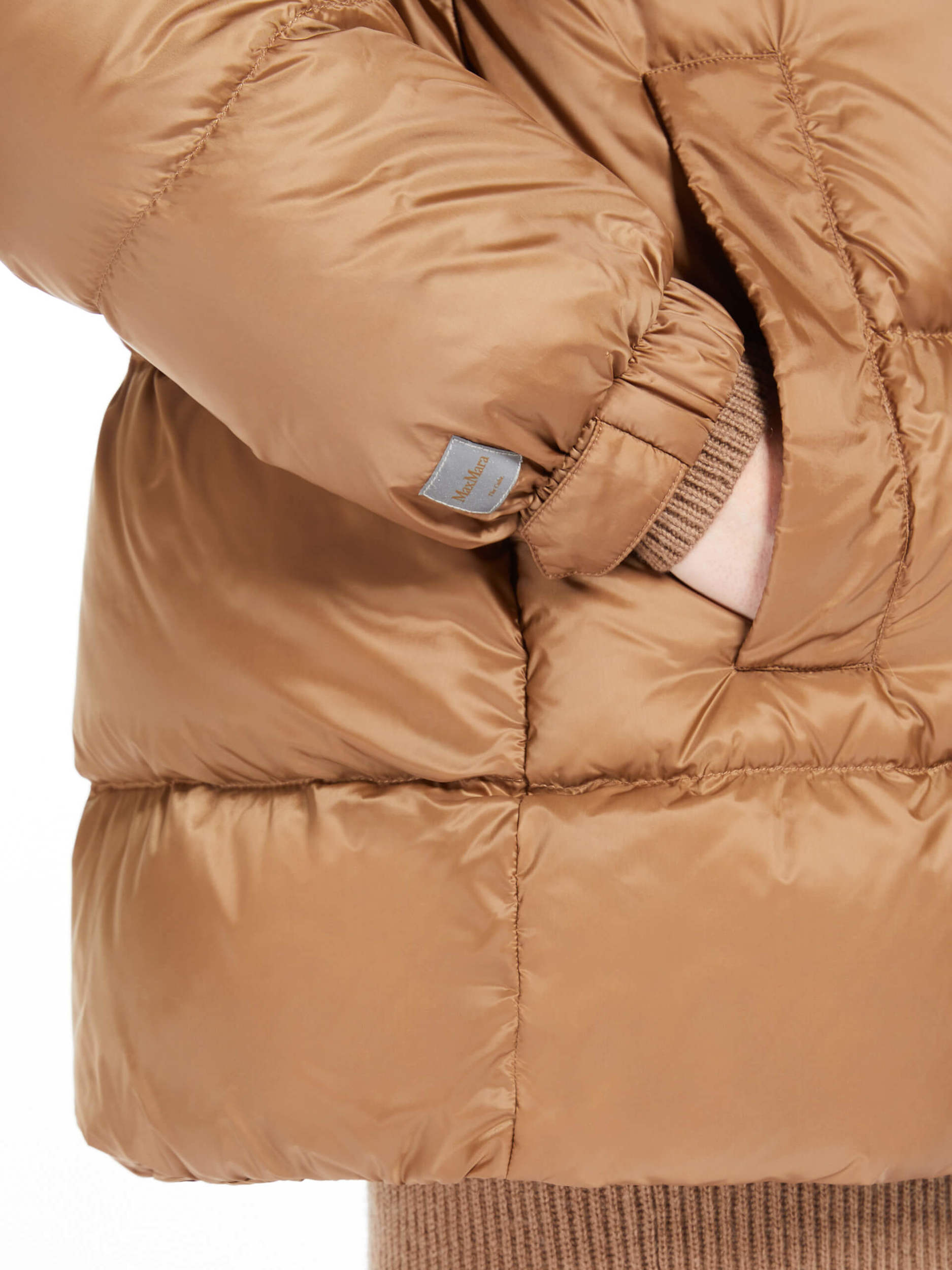 Куртка, виконана з водовідштовхувальної тканини на гусячому пуху, з горизонтальним стьобаним візерунком по всій поверхні та капюшоном на лаштунці з металевими кінчиками. Ця модель також має прорізні бічні кишені та еластичні манжети. Застібається на блискавку зі шкіряним бігунком.