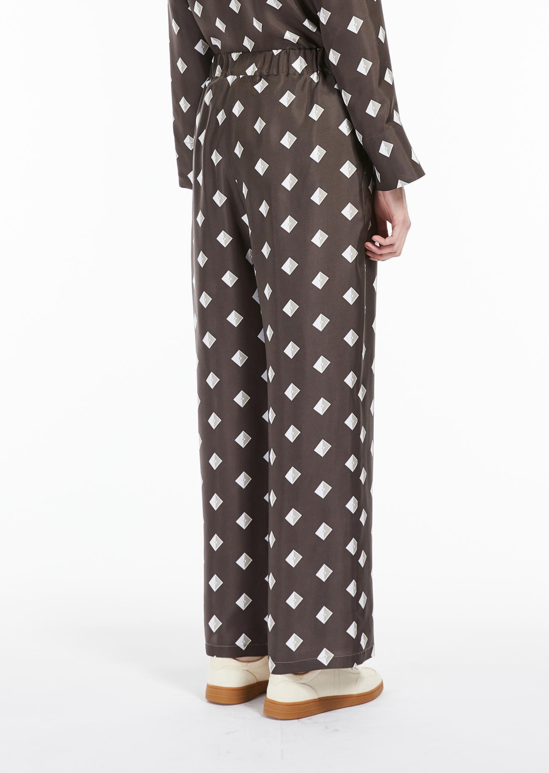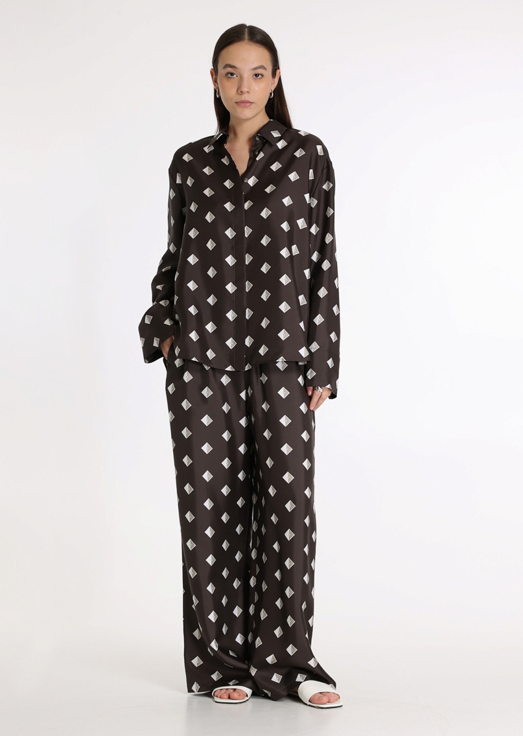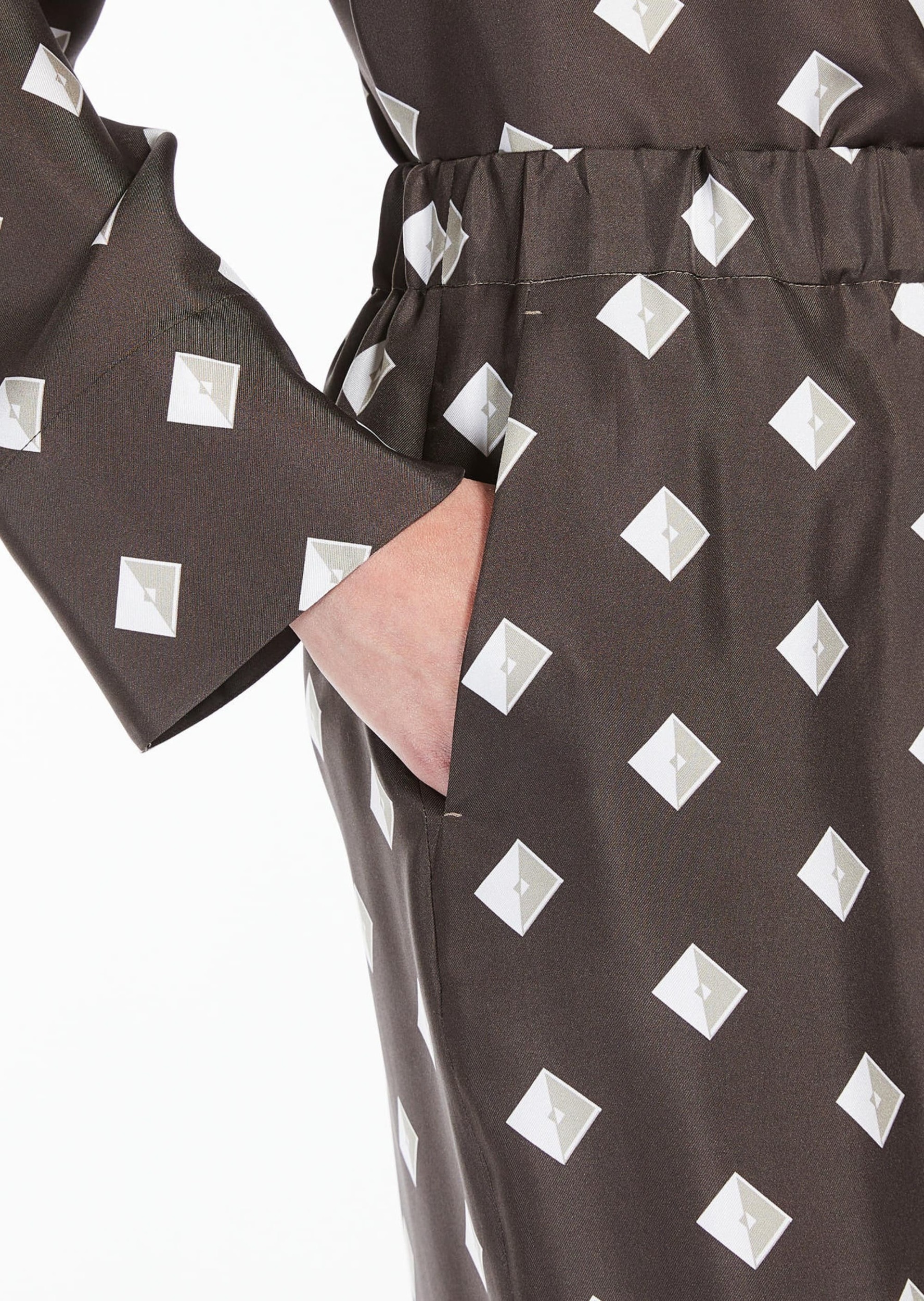 Жіночі брюки шоколадного кольору із геометричним принтом по всій поверхні виробу - стильний вибір. Штани з шовкового твілу мають еластичний пояс та кишені з прямими швами, що додає практичності. Вишукана модель для створення сучасного, витонченого образу.