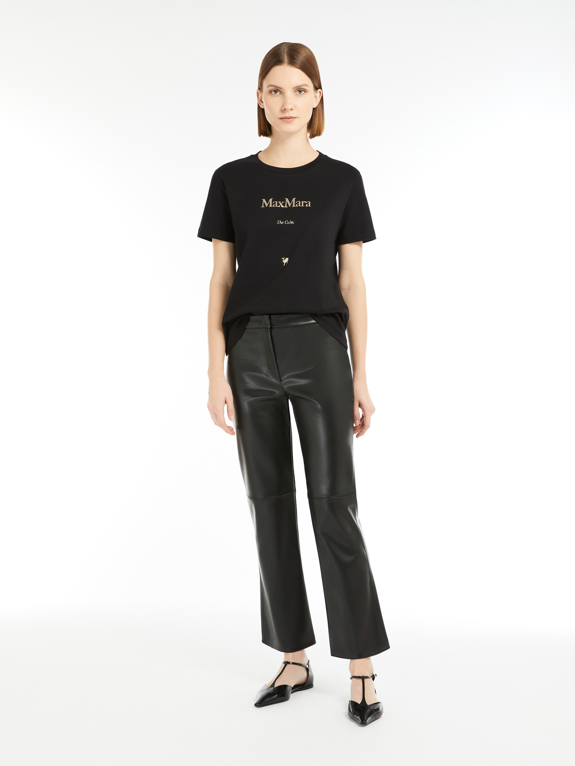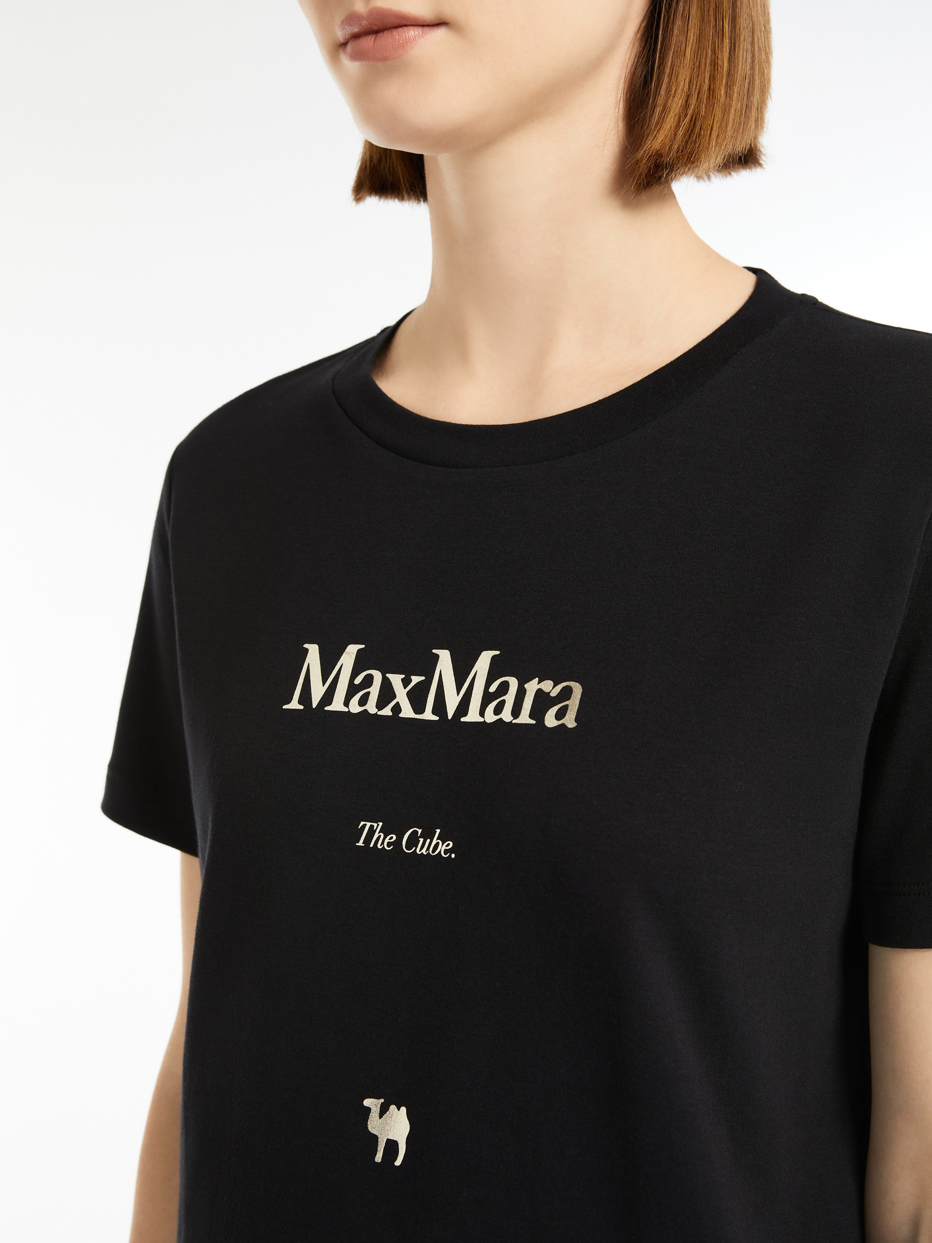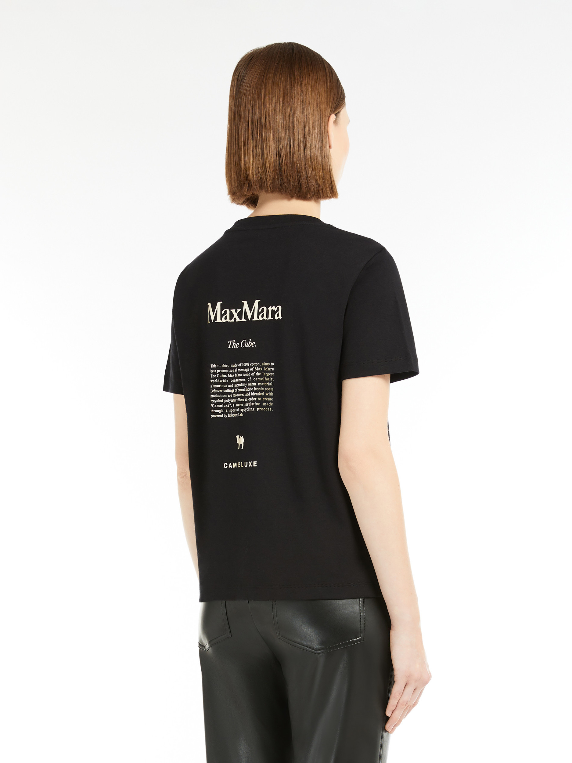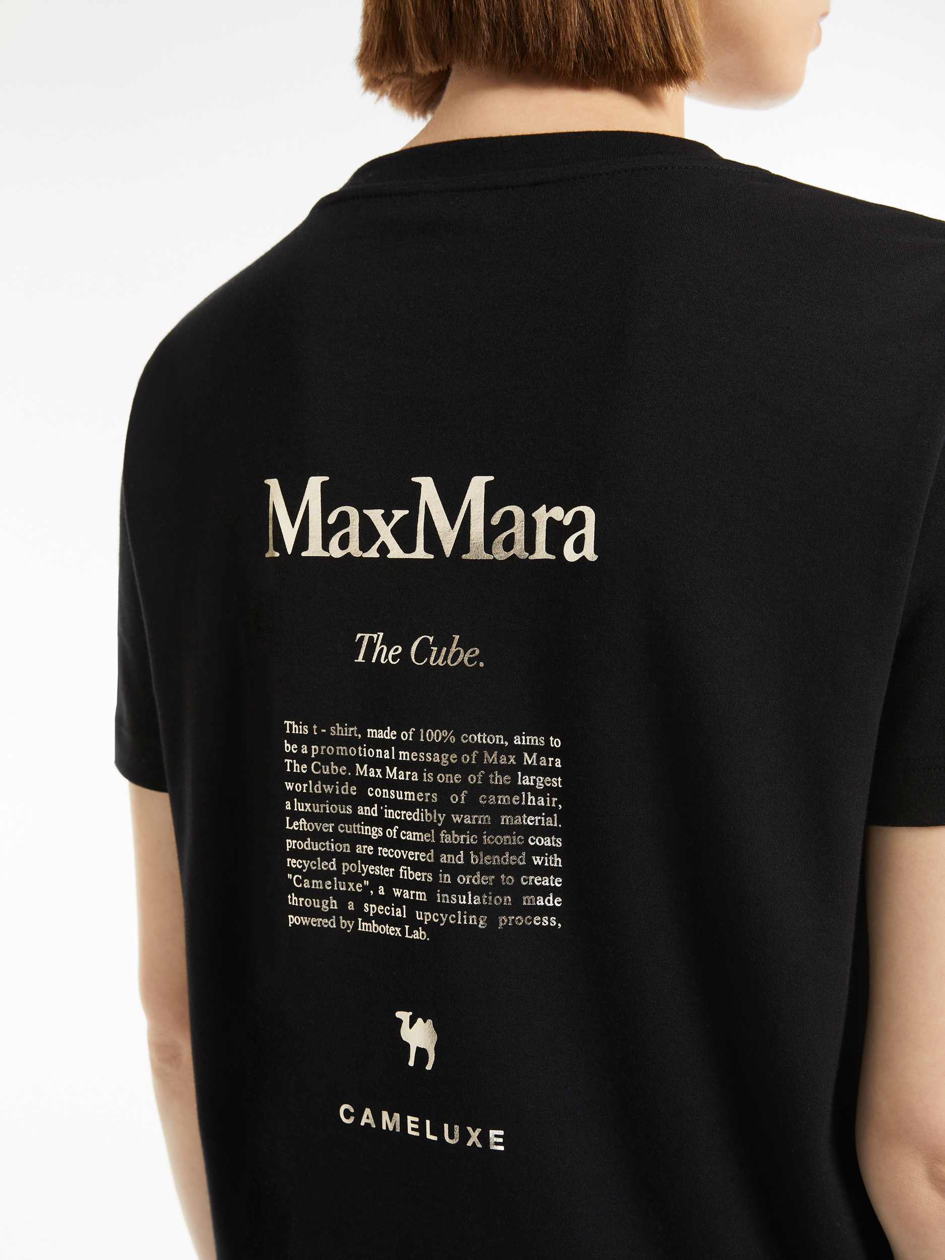 Чорна футболка з круглим вирізом, виготовлена з мякого бавовняного трикотажу. Модель класичного крою з короткими рукавами, прикрашена фірмовими принтами спереду та ззаду.