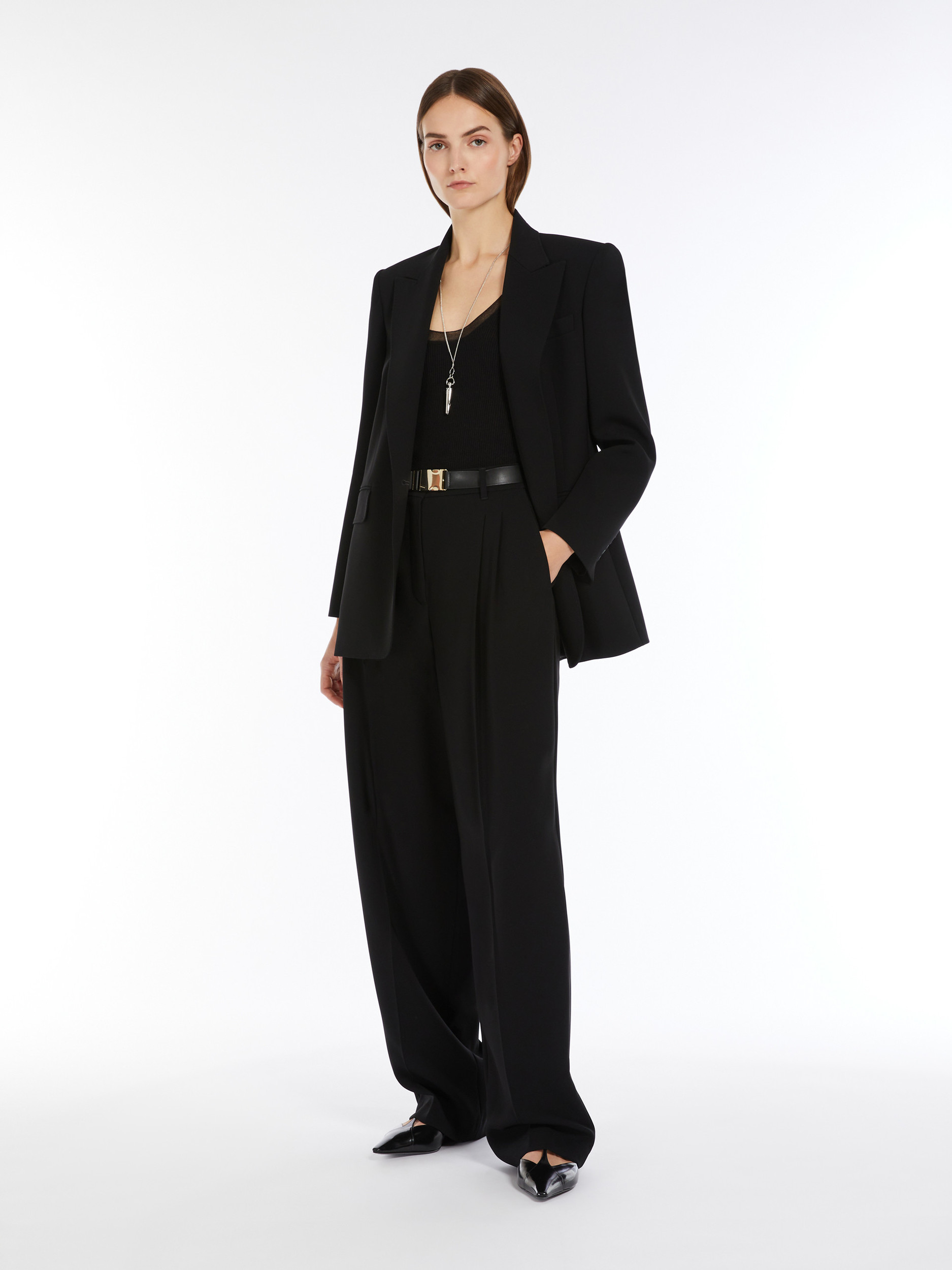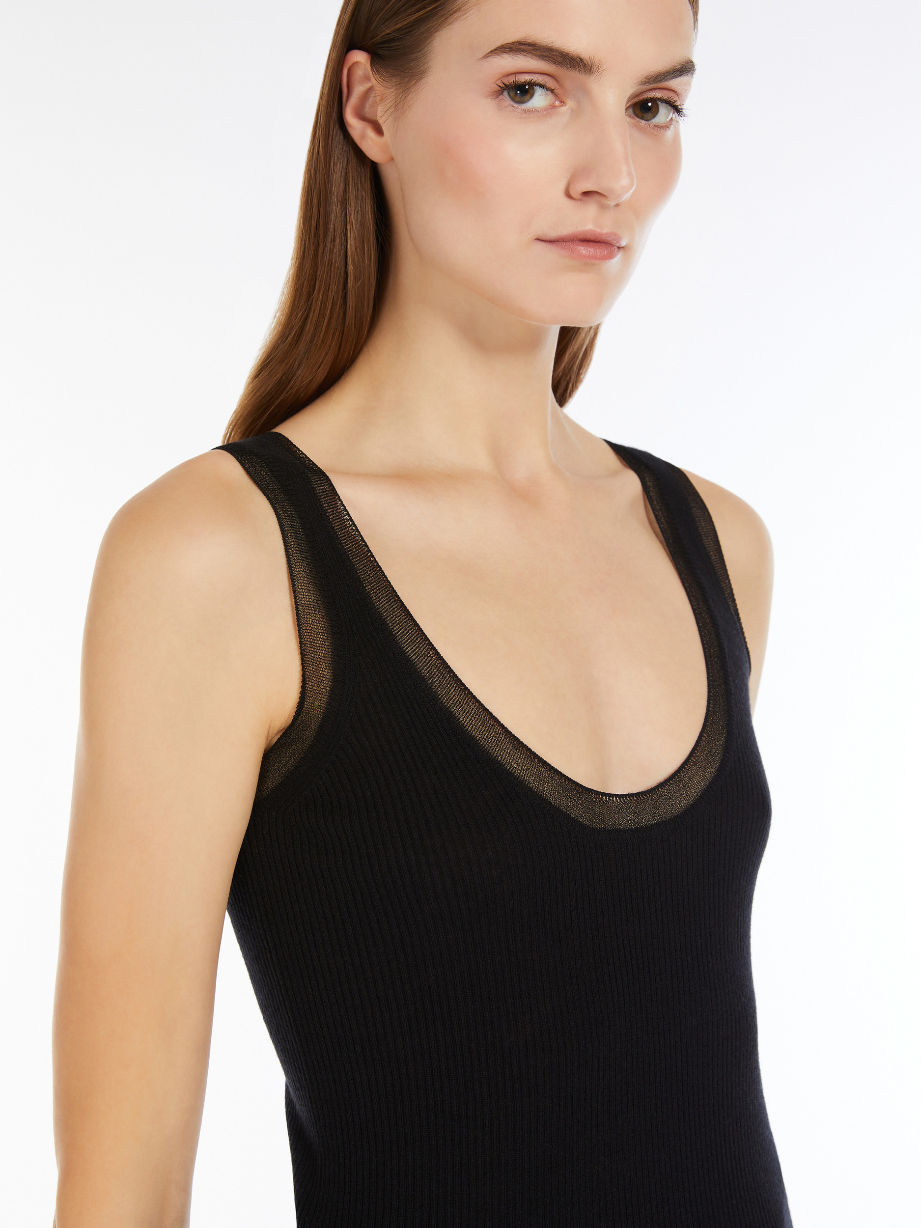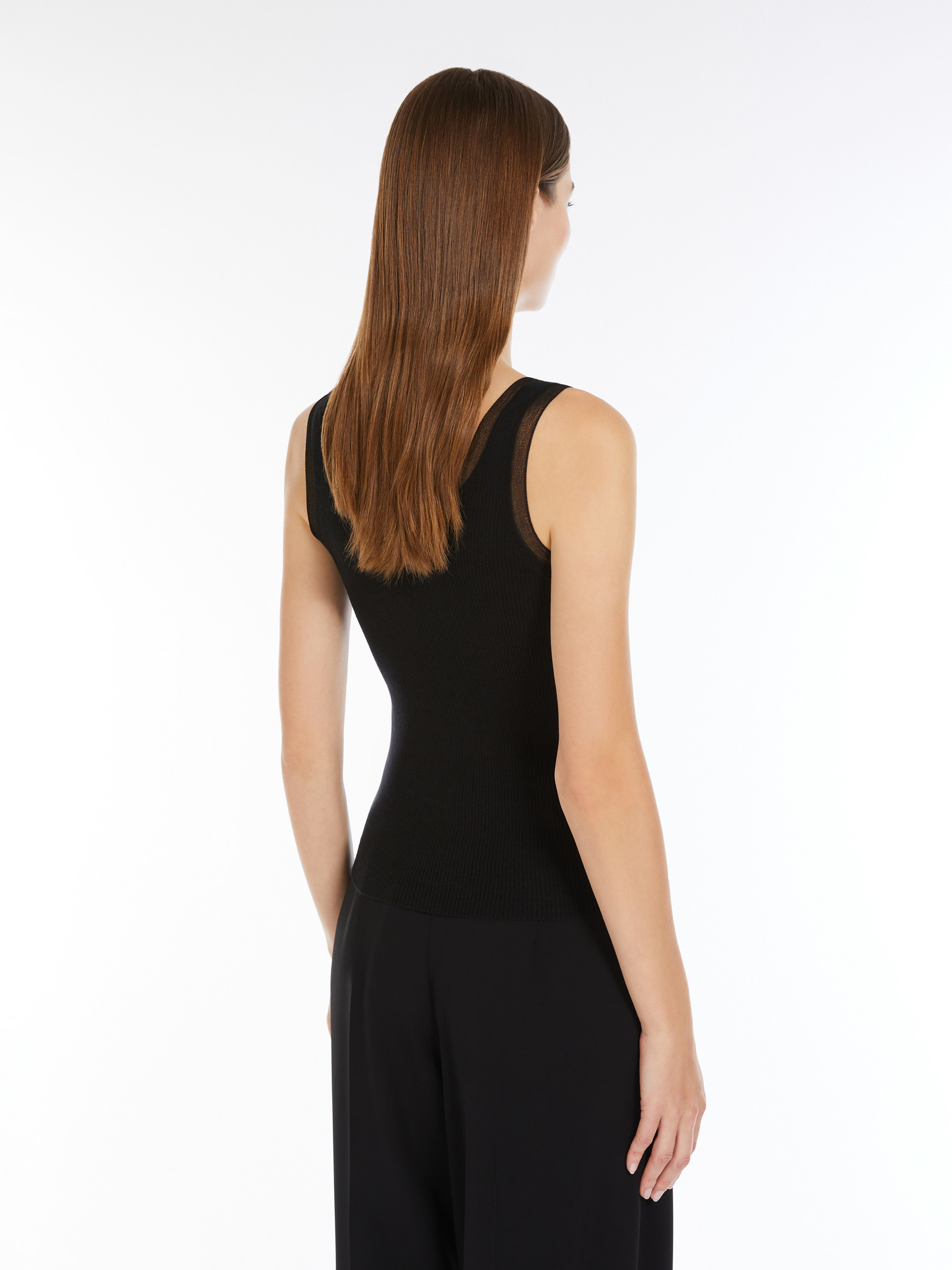 Майка, виконана з тонкої вовни та шовку, з вільним круглим вирізом та широкими бретелями. Ребристий візерунок підкреслює жіночний, стрункий силует. Оздоблення з прозорої віскози ребристої вязки.