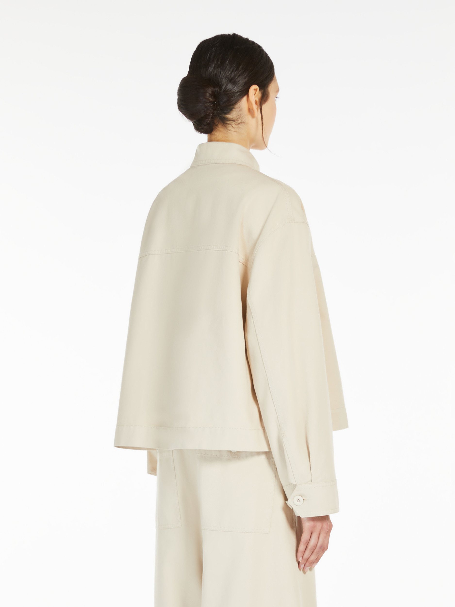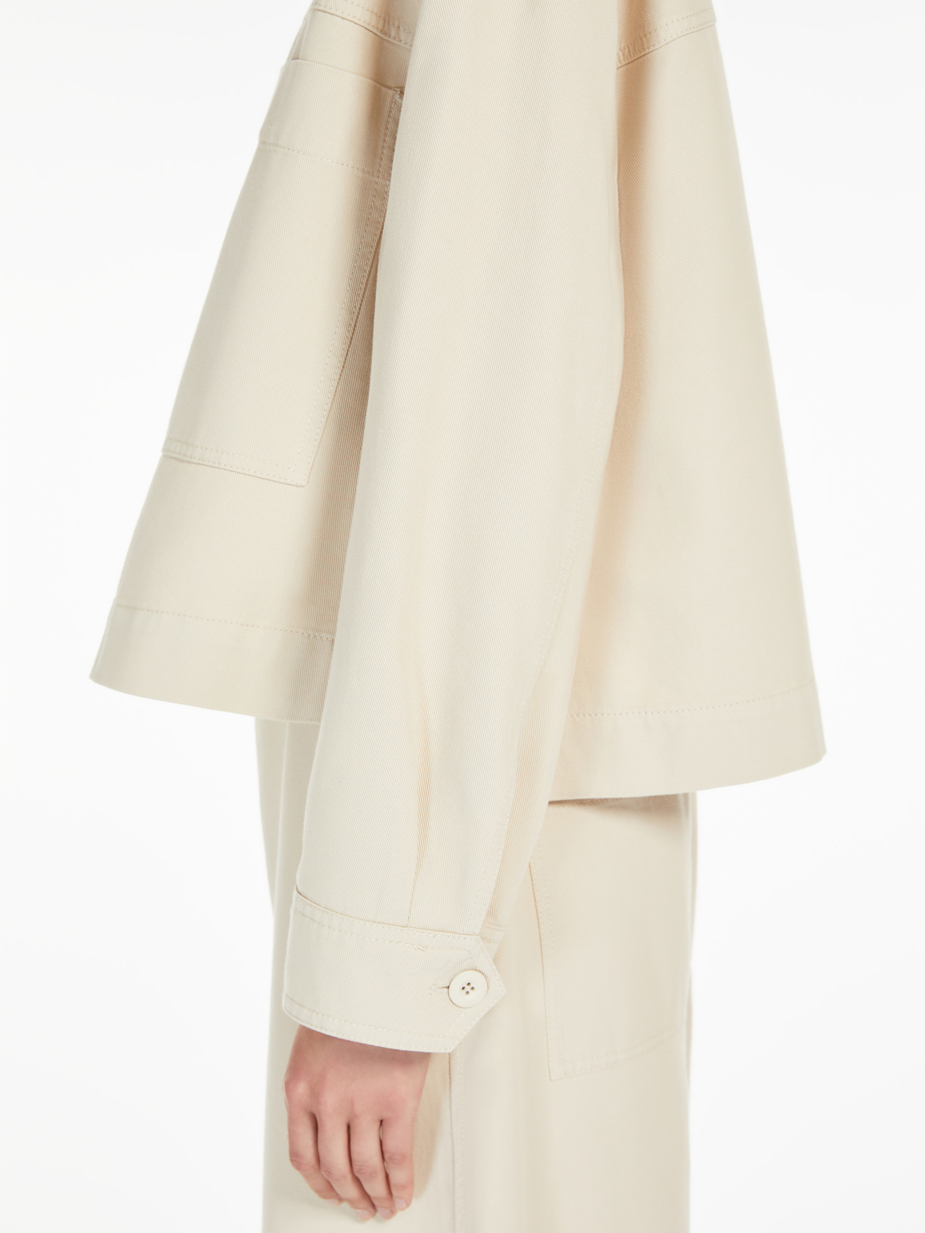 Куртка виготовлена із бавовни. Модель комфортного крою зі спущеними плечима, коміром-стійкою, накладною нагрудною кишенею, довгими рукавами з краями, що застібаються на ґудзики, і відстроченою виточкою спереду і ззаду.