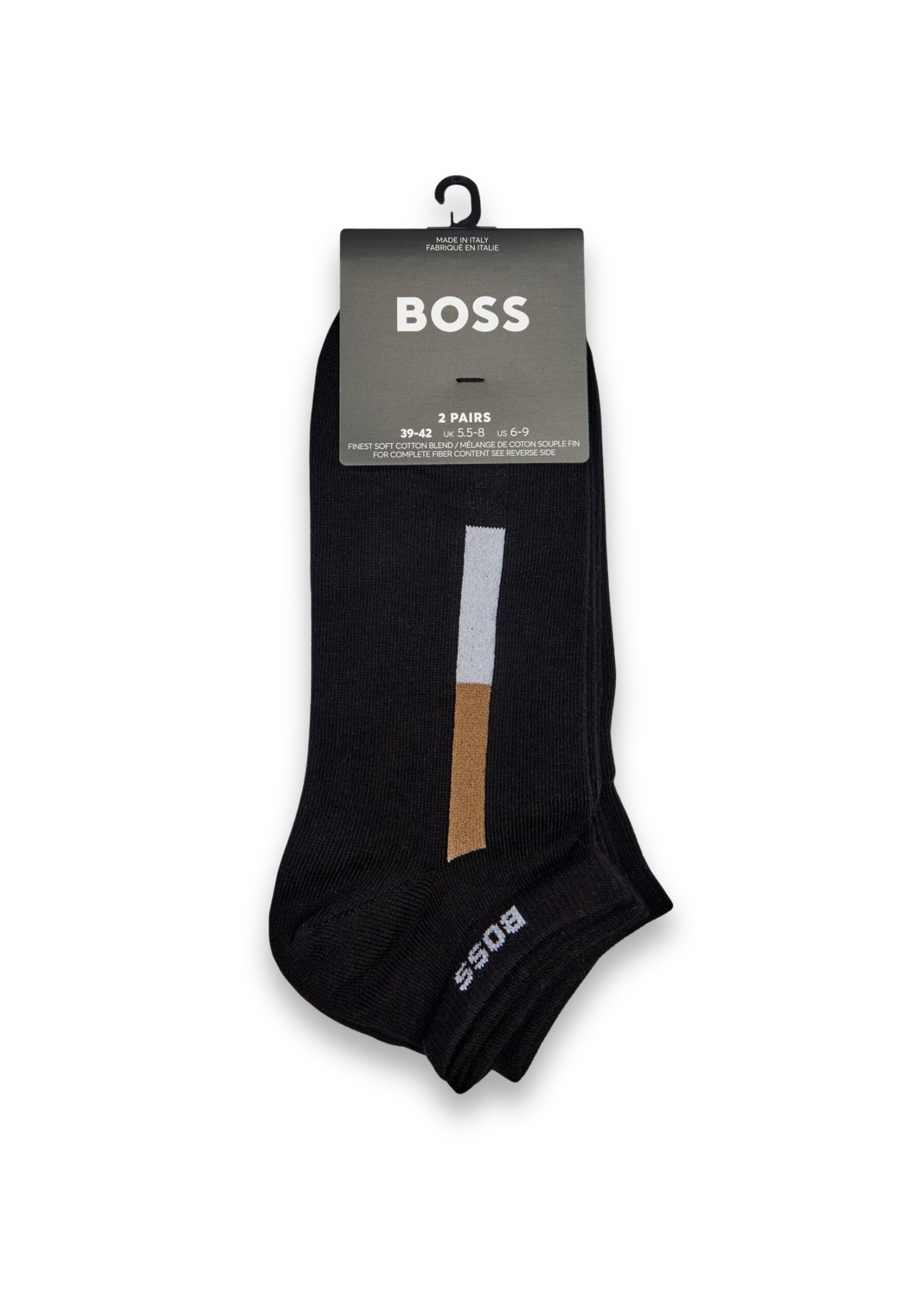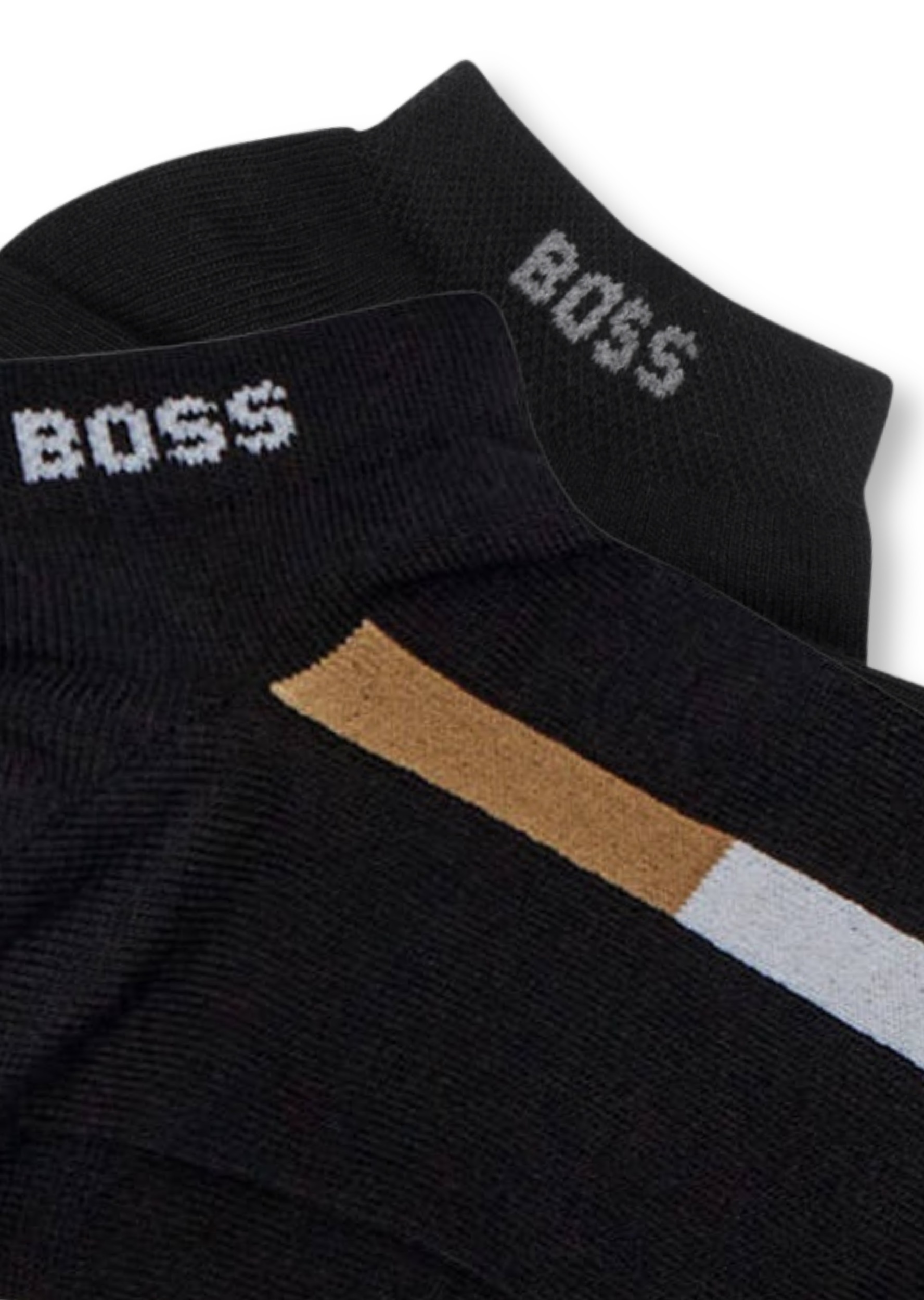 Набір із двох пар шкарпеток BOSS виготовлений із м’якої та еластичної тканини з високим вмістом бавовни, що забезпечує комфорт і щільну посадку. Еластична резинка на щиколотці підтримує форму та не тисне на шкіру. Чорний колір робить шкарпетки універсальними та непомітними у взутті. Акуратний контрастний логотип BOSS додає стриманого акценту. Ідеально поєднуються з повсякденним і діловим взуттям: кросівками, дербі, лоферами. Практичний аксесуар щоденного гардероба, що поєднує комфорт, довговічність і фірмовий стиль.