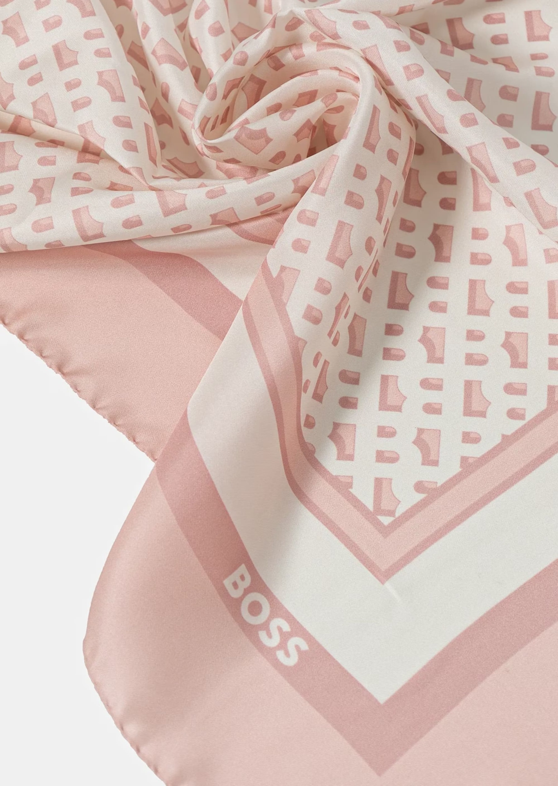Елегантний шарф від Boss Womenswear. Модель виконана з шовкового атласу, цей італійський аксесуар прикрашений сучасним малюнком та фірмовим стилем BOSS.