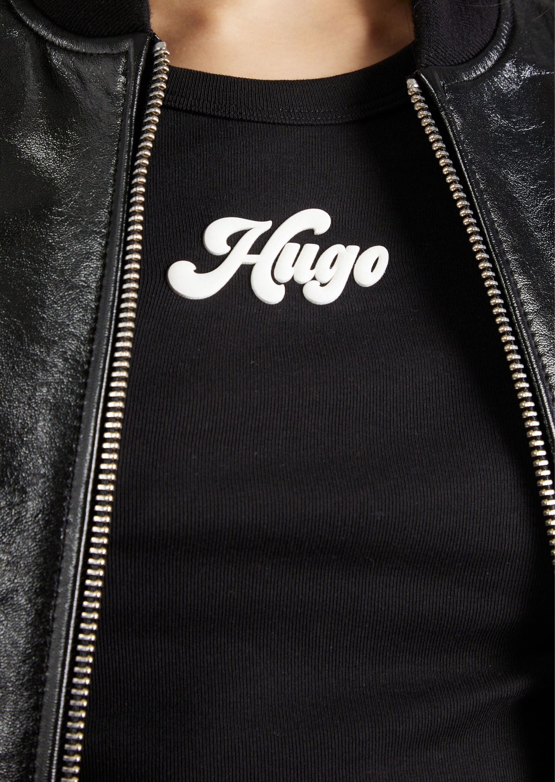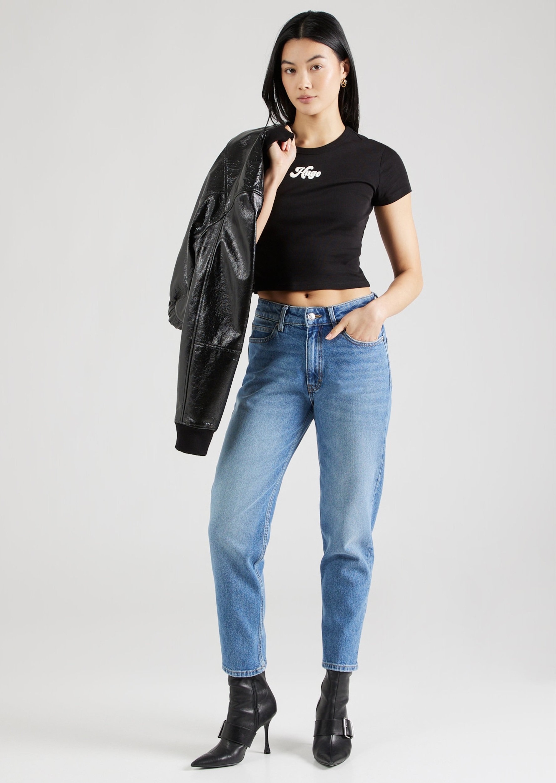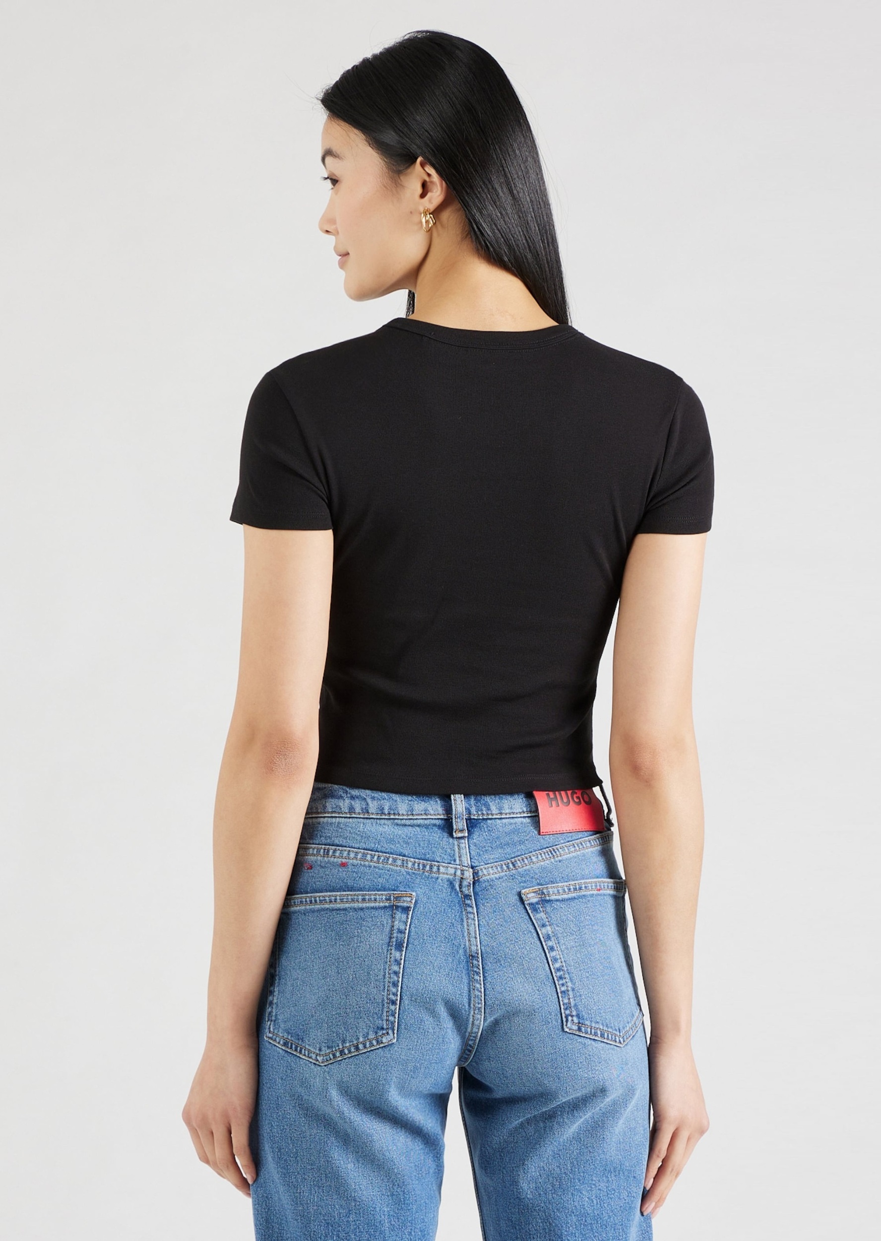 Жіноча футболка HUGO — стильний та комфортний елемент повсякденного гардероба. Виготовлена з мякого та дихаючого бавовняного трикотажу, вона забезпечує приємні відчуття протягом дня. Футболка має укорочений крій (Cropped Fit), що додає сучасності та підкреслює лінію талії. Круглий виріз горловини та короткі рукава роблять її універсальною для різних образів. Особливістю моделі є мінімалістичний дизайн з акцентом на якісному матеріалі та крої. Футболка ідеально поєднується з джинсами із завищеною талією, спідницями або шортами, створюючи модні та невимушені образи. Підходить для повсякденного носіння, прогулянок або зустрічей з друзями.