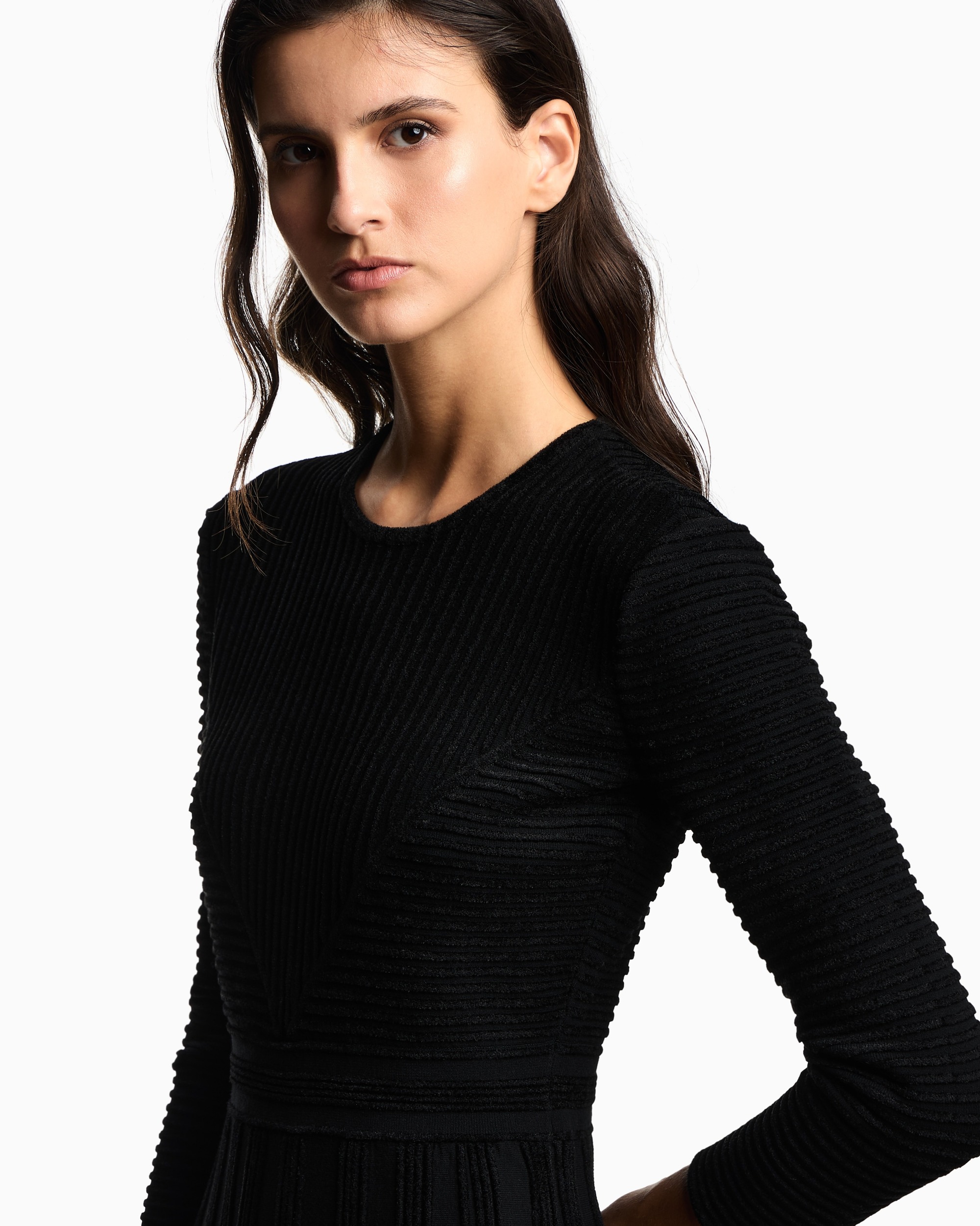 Довга сукня Emporio Armani з шеніл з круглим вирізом і рукавами три чверті. Тканина з ефектом отоманки утворює вишуканий рельєфний рубчик по всій поверхні, що робить його унікальним.
