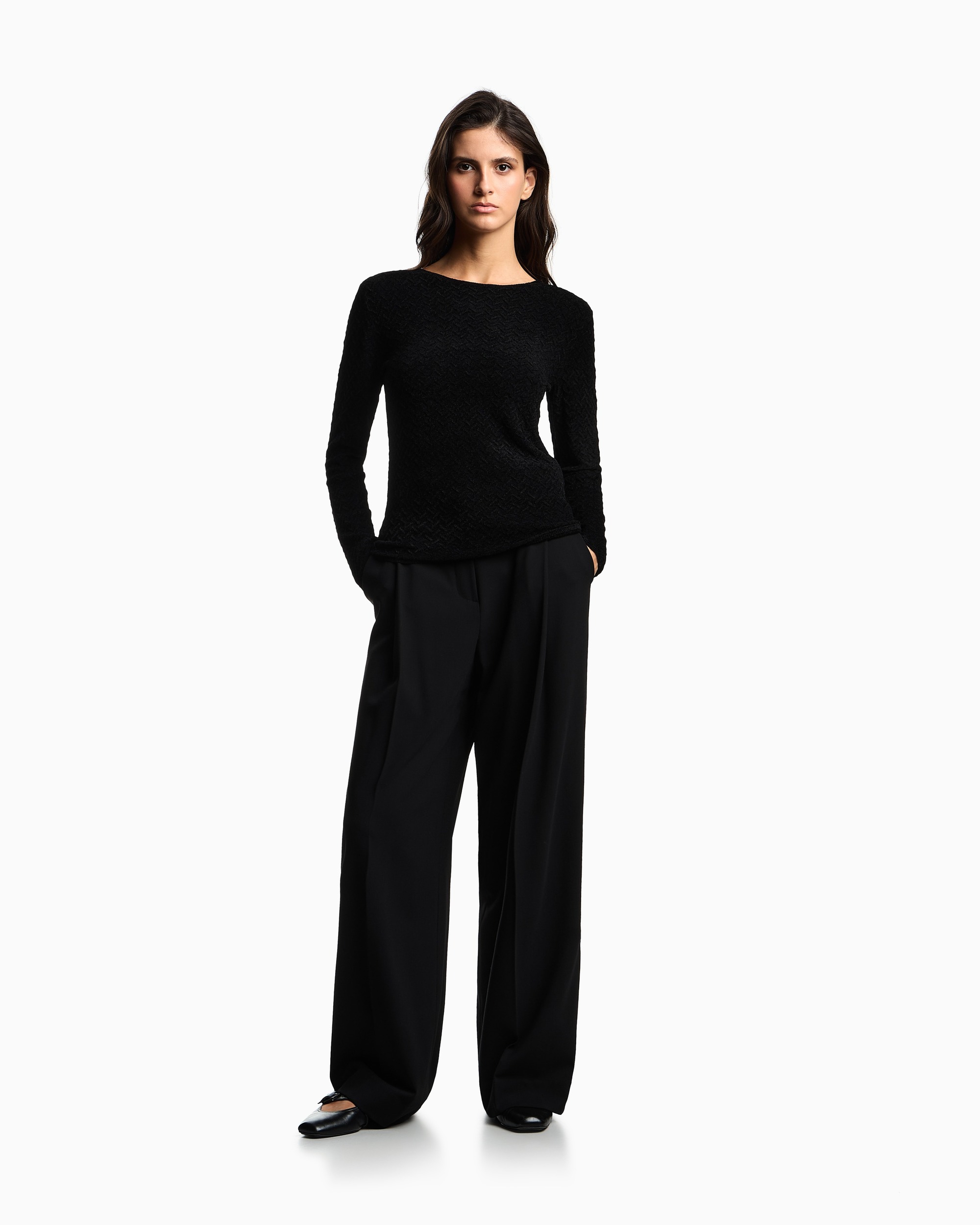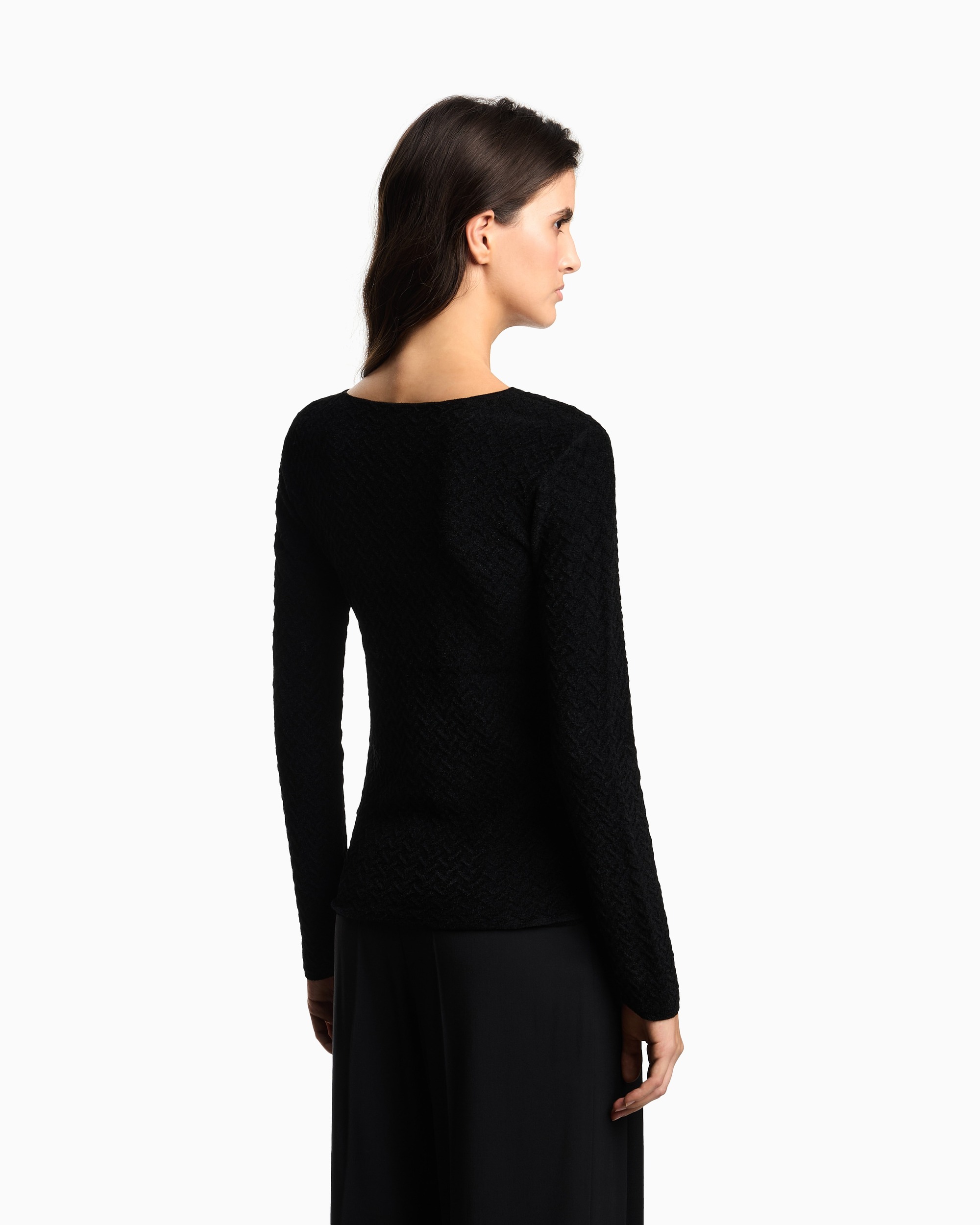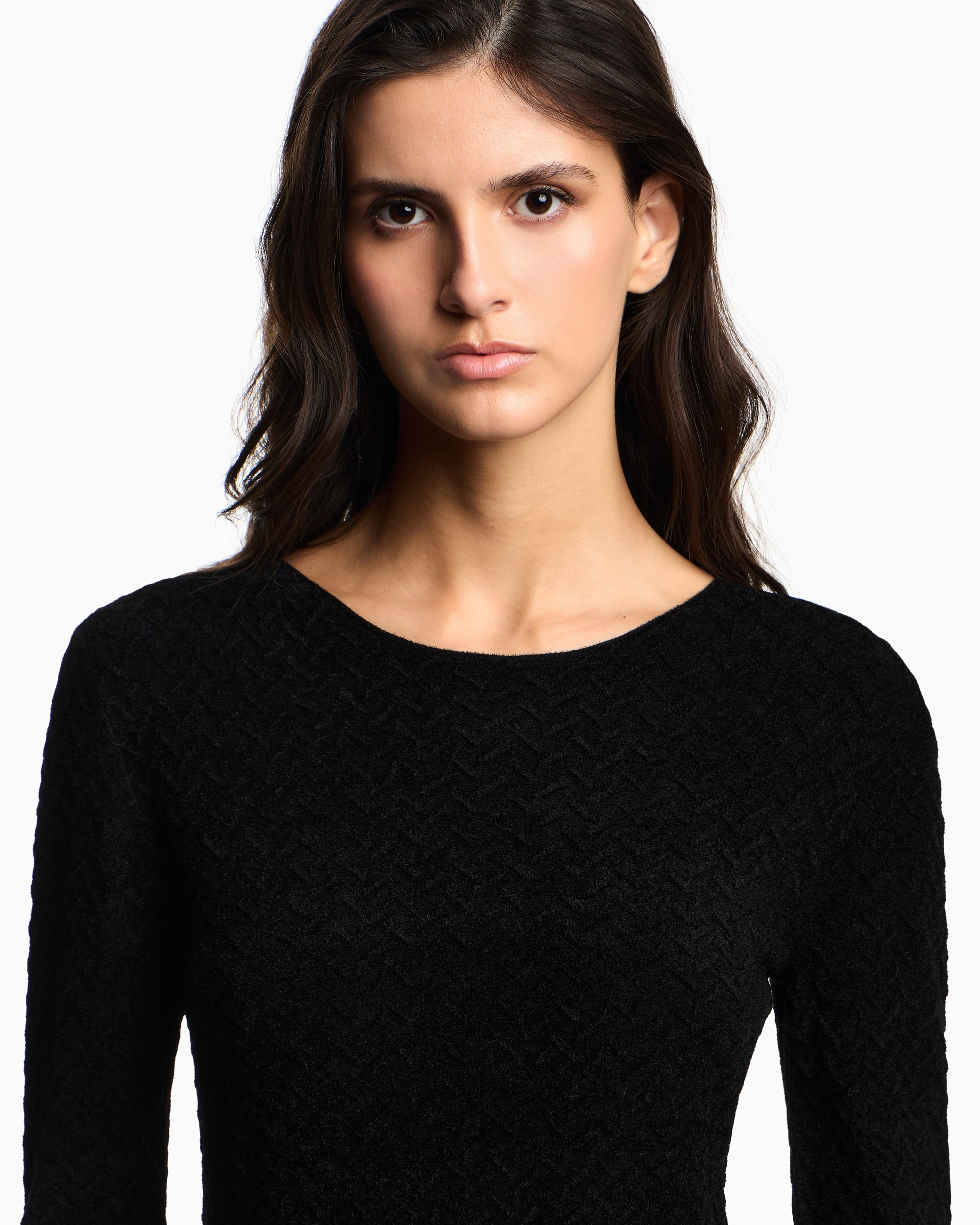 Чорний джемпер Emporio Armani з довгим рукавом і круглим вирізом виконаний з еластичної м’якої шенілі, оздобленої виразним рельєфним зигзагоподібним візерунком, що створює об’єм та динаміку. Завдяки поєднанню поліаміду та віскози тканина приємна на дотик, зберігає форму та комфортно сідає по фігурі. Лаконічний крій і незвична текстура роблять виріб універсальним — воно легко поєднується з класичними брюками для елегантного образу або з джинсами та шкіряними черевиками для більш розслабленого, але стильного ансамблю. Цей джемпер стане чудовим доповненням до гардеробу, пропонуючи поєднання комфорту та фірмового стилю Emporio Armani.