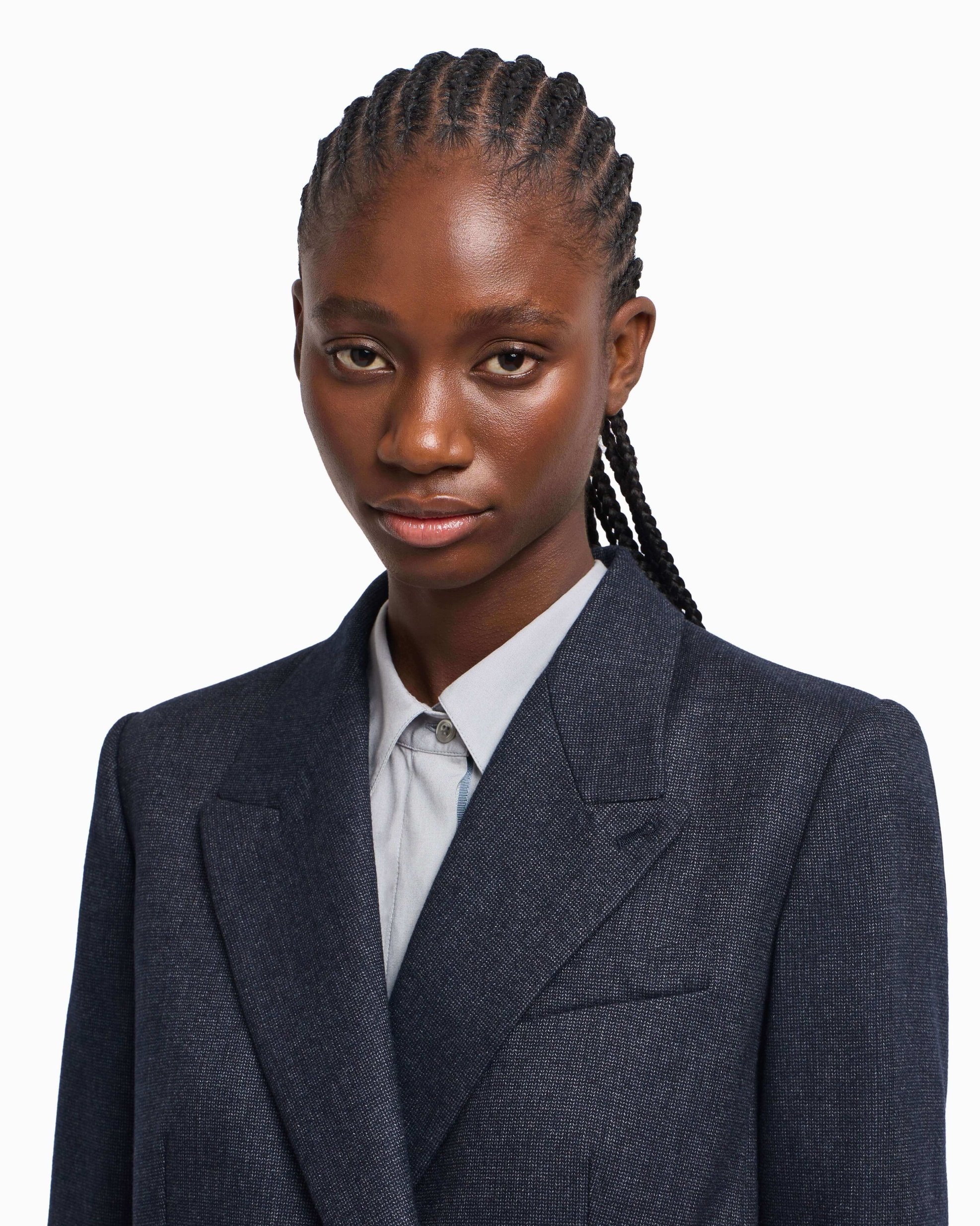 Жакет Emporio Armani темно-синього кольору виконаний із суміші віскози, вовни та поліестеру, що надає тканині м’якість, структуру та зносостійкість. Приталений крій підкреслює елегантний силует, а акуратні лінії створюють чистий профіль. Класичні лацкани, застібка на ґудзики та бічні кишені доповнюють функціональність моделі. Жакет легко поєднується зі штанами та сорочкою для ділового стилю або з джинсами й футболкою для smart-casual образу. Жакет Emporio Armani стає універсальним елементом гардеробу, що поєднує преміальну естетику та практичність