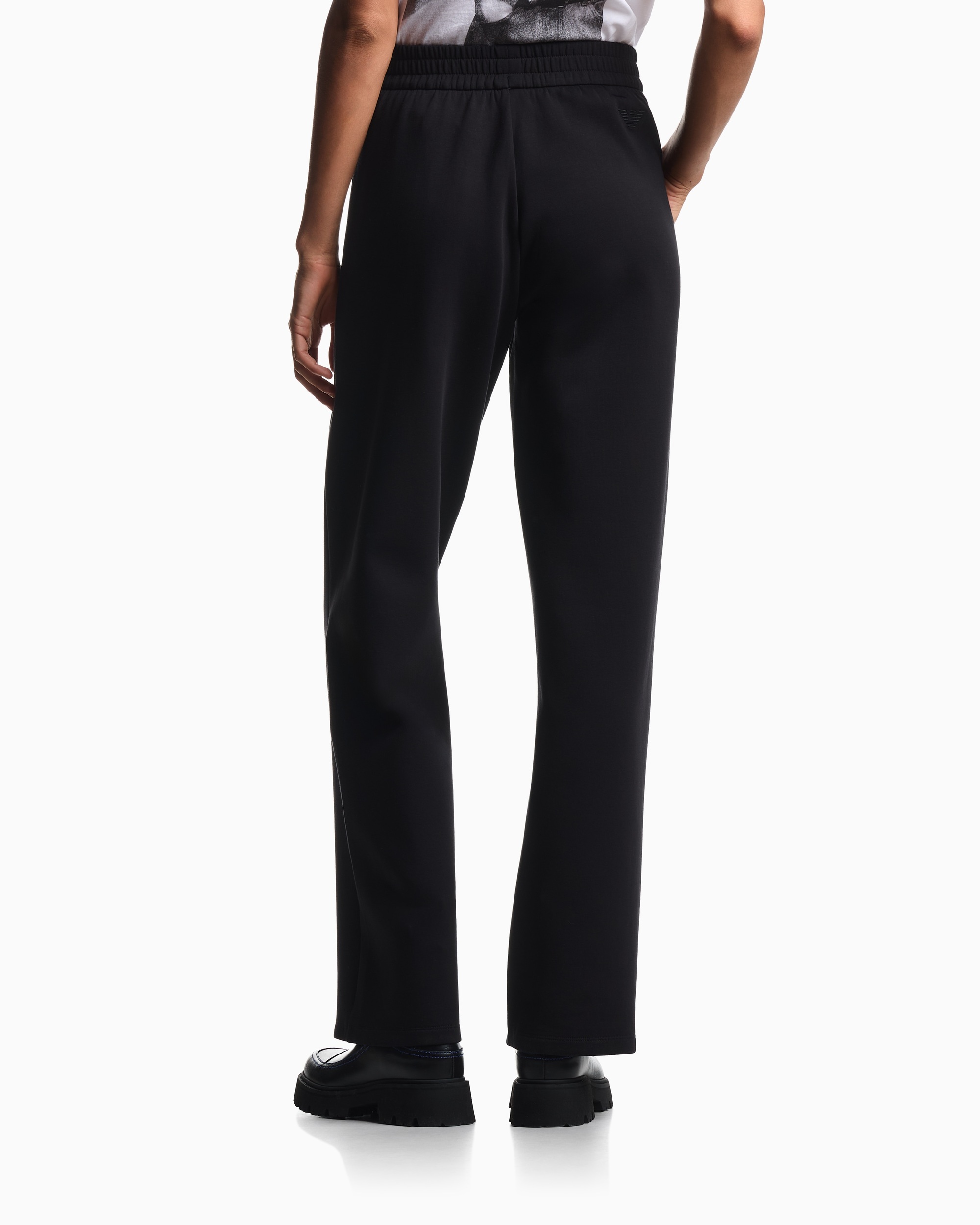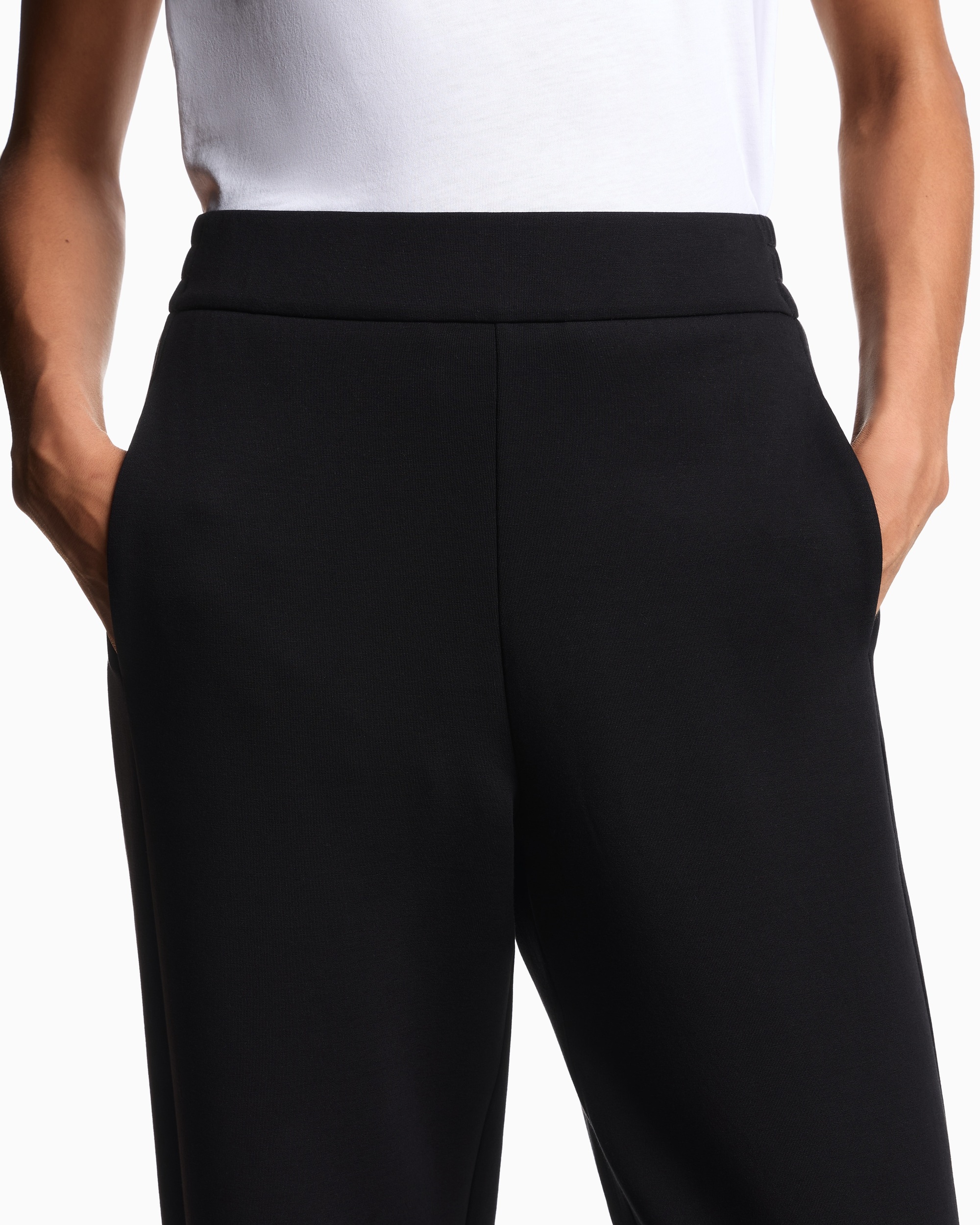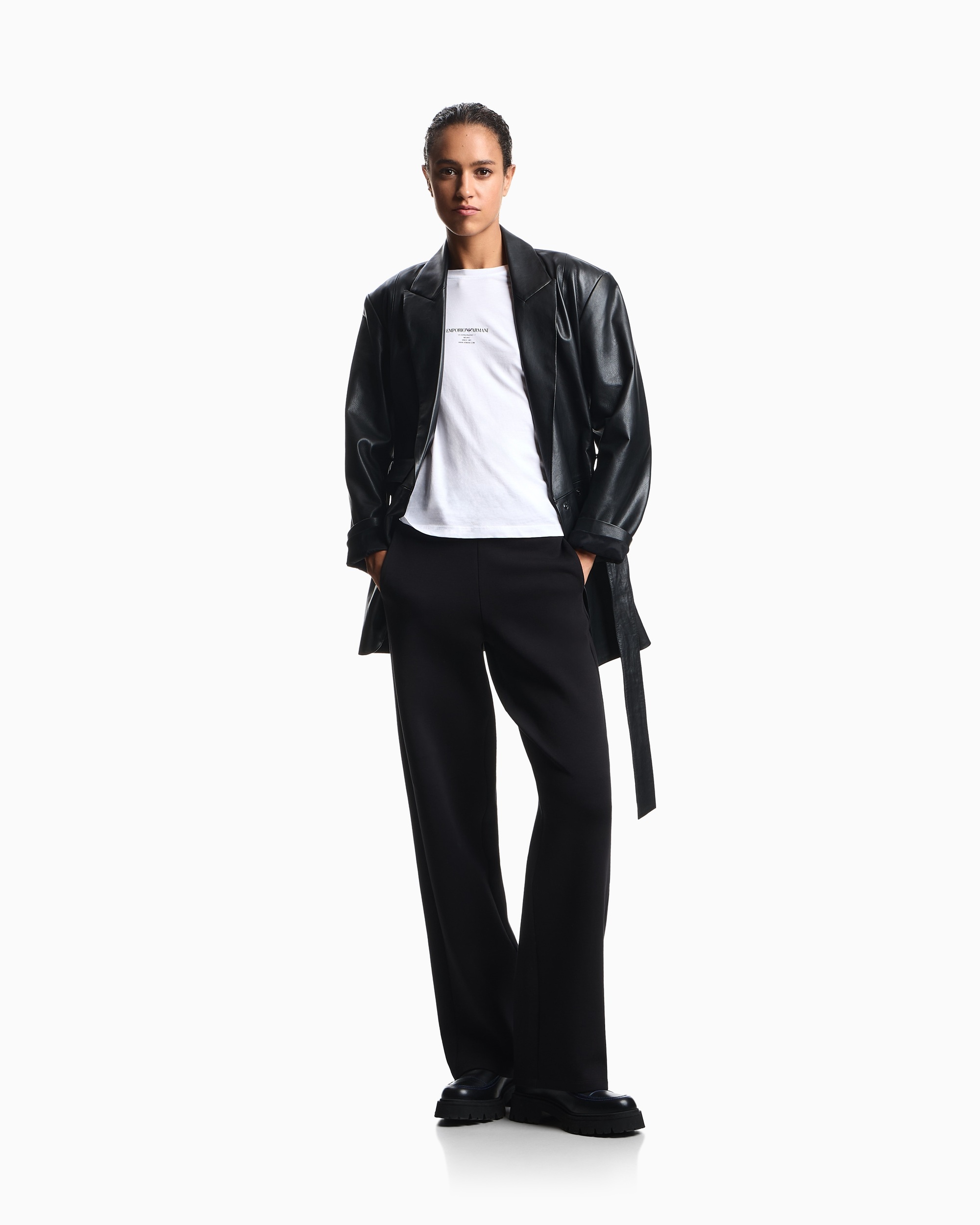 Чорні брюки Emporio Armani з м’якого подвійного джерсі поєднують комфорт і функціональність. Тканина забезпечує приємну м’якість і хорошу розтяжність. Практичний еластичний пояс та бічні кишені додають зручності. На спинці вишитий фірмовий орел — лаконічний і впізнаваний акцент. Ідеально підходять для поєднання з футболками, світшотами і легкими куртками. Ці брюки створюють сучасний образ, поєднуючи затишок і стиль.