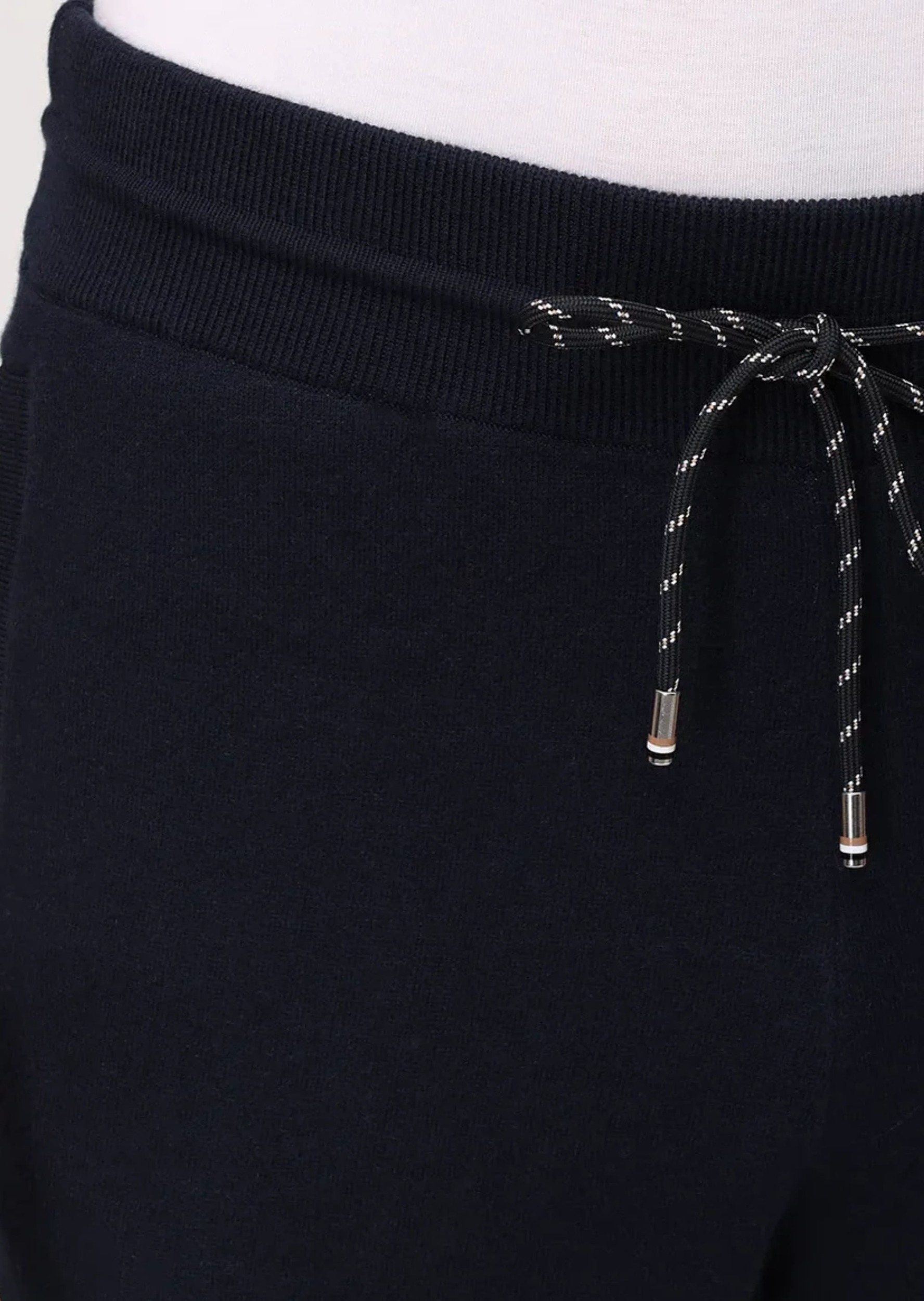 Штани BOSS темно-синього кольору із бавовни та вовни вирізняються м’якістю й щільною структурою. Еластичний пояс і прямий крій створюють відчуття комфорту та свободи рухів. Матеріал стійкий до деформації й добре тримає форму. Добре поєднуються з поло або кашеміровим светром для продуманого образу.