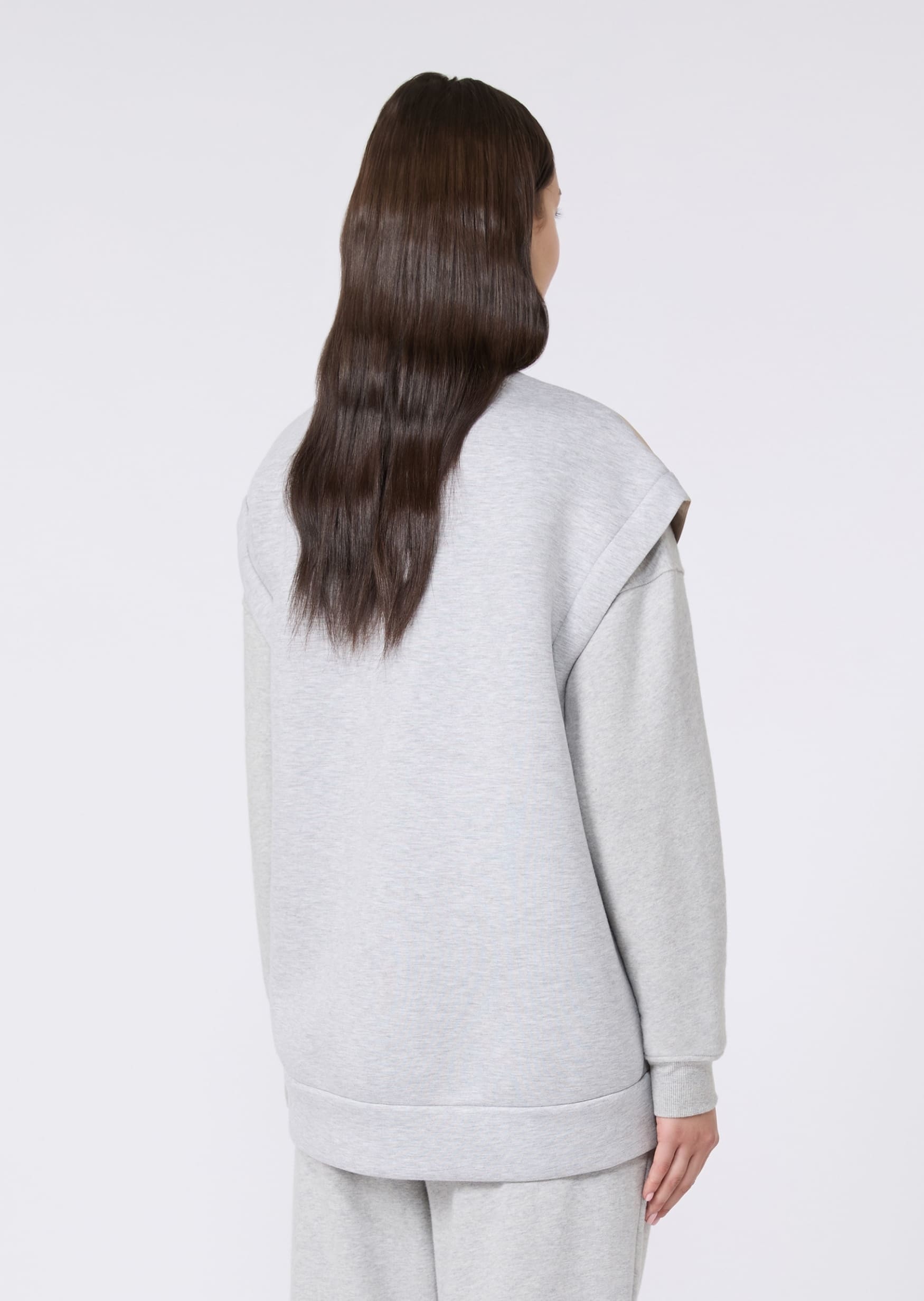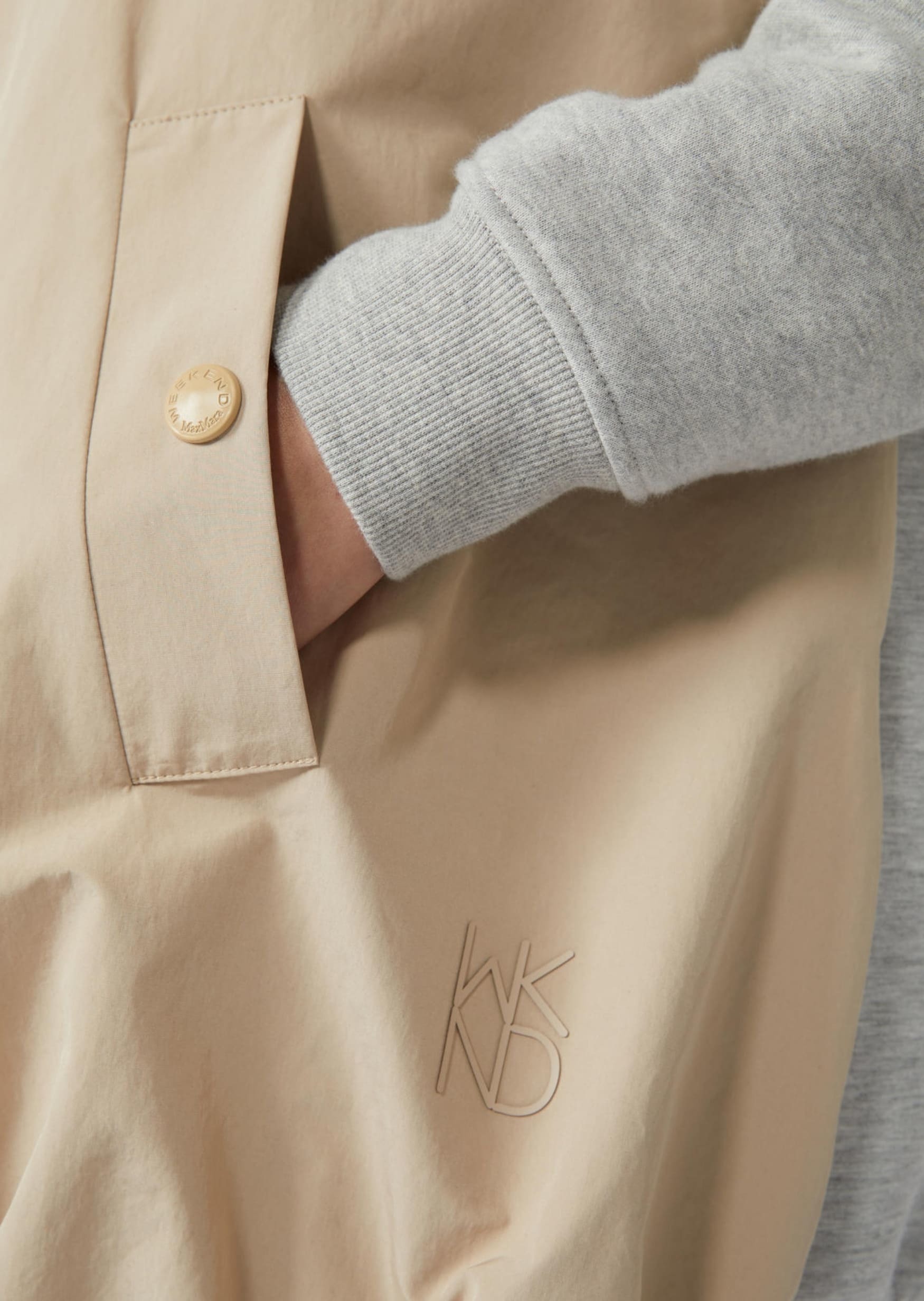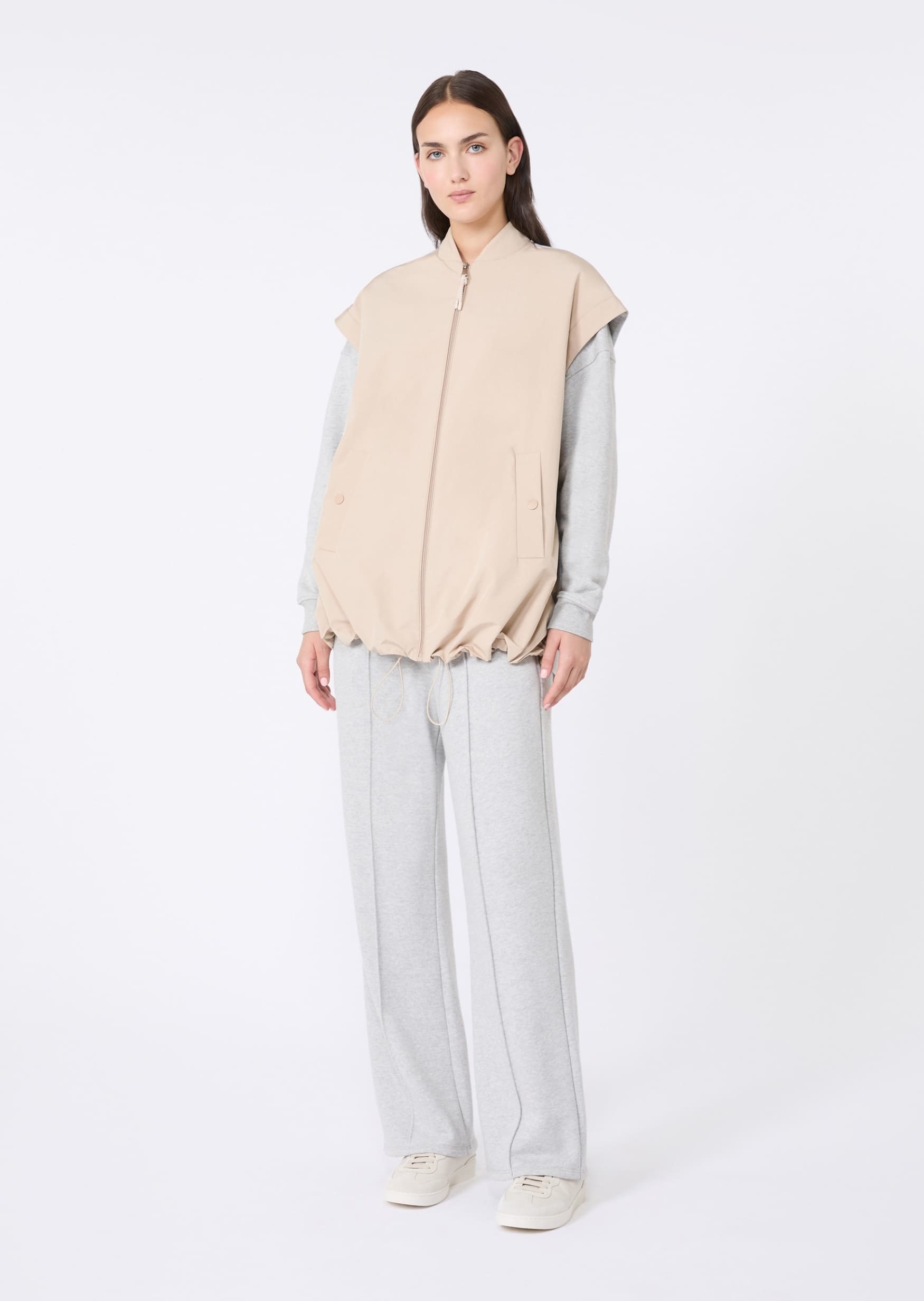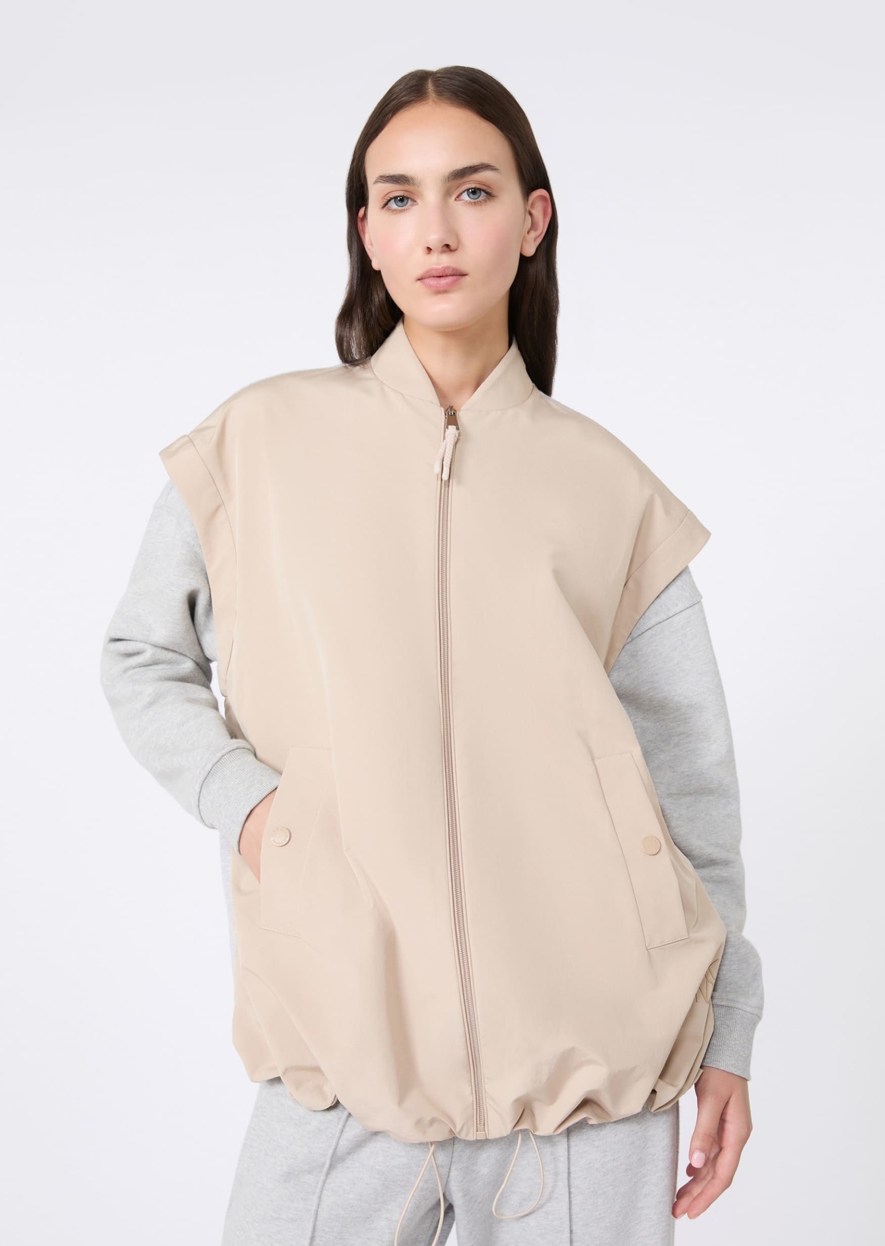 Бежевий двосторонній жилет Max Mara Weekend із водовідштовхувального технічного канвасу та еластичного scuba-джерсі. Вільний крій із заниженою лінією плечей і трикотажним коміром у стилі бомбера. Застібка спереду на блискавку, бокові кишені на кнопках і внутрішній шнурок для регулювання посадки по низу. Поєднується з базовими футболками чи светрами, вузькими джинсами та спортивним взуттям — для повсякденного міського стилю. Зі зворотного боку жилет чудово пасує до худі, легінсів або брюк карго — для більш активного спортивного образу. Практичний двосторонній жилет, який дозволяє змінювати стиль і захищає від вологи в умовах міста.
