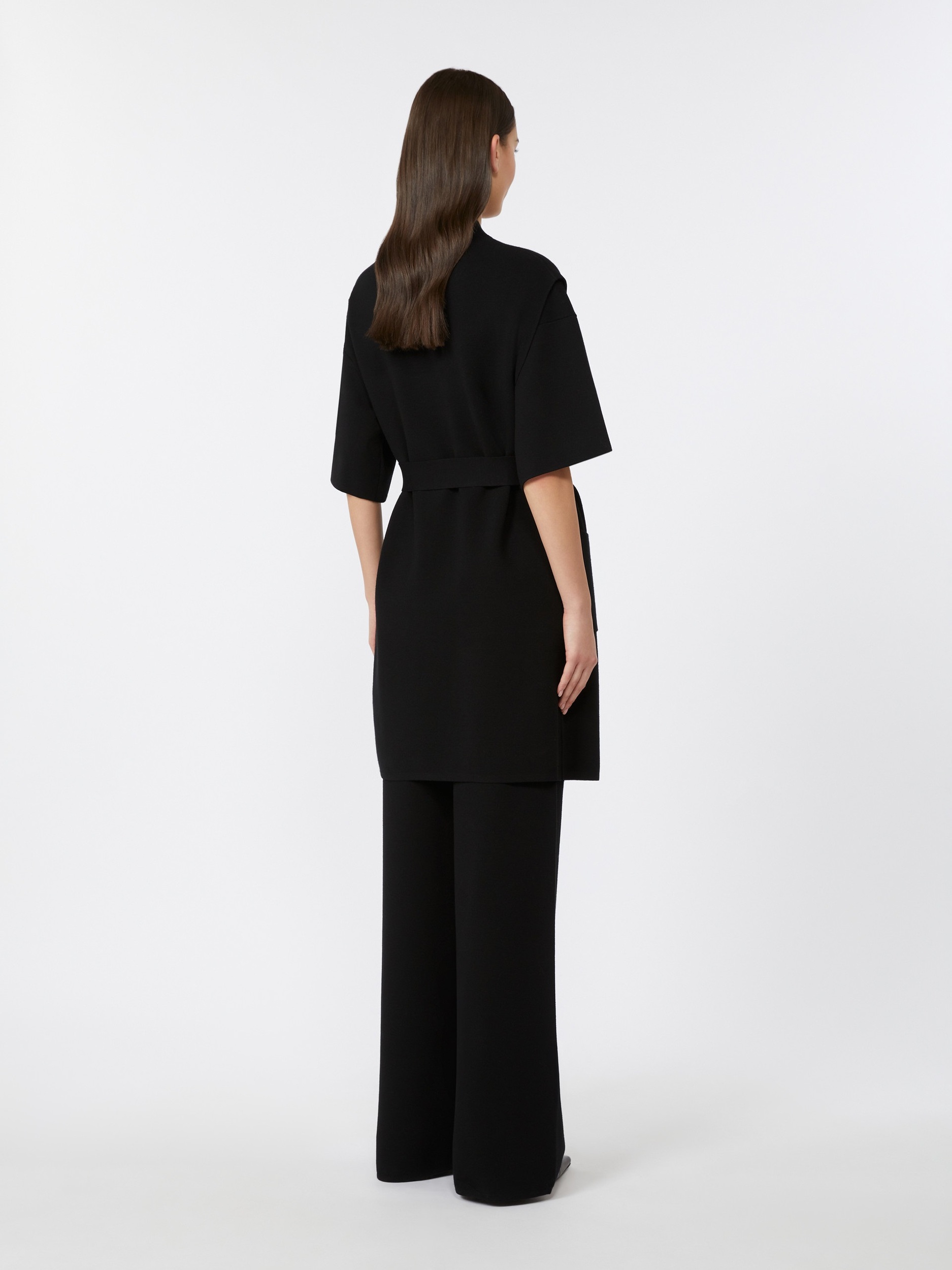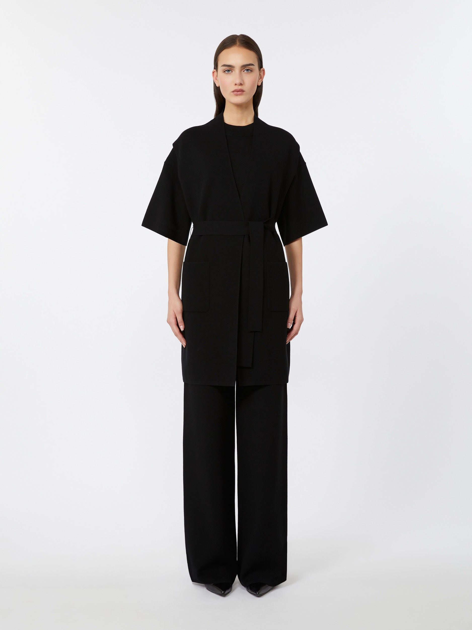 Подовжений жилет Max Mara Studio чорного кольору з еластичної віскозної пряжі з лляним ефектом. Прямий крій, занижена лінія плечей та накладні кишені. Акцент на талії — пояс в тон. Поєднується з топами, тонкими светрами, сорочками та прямими штанами. Легкий і універсальний шар для багатошарових образів — підкреслює лінію силуету та додає текстурності.