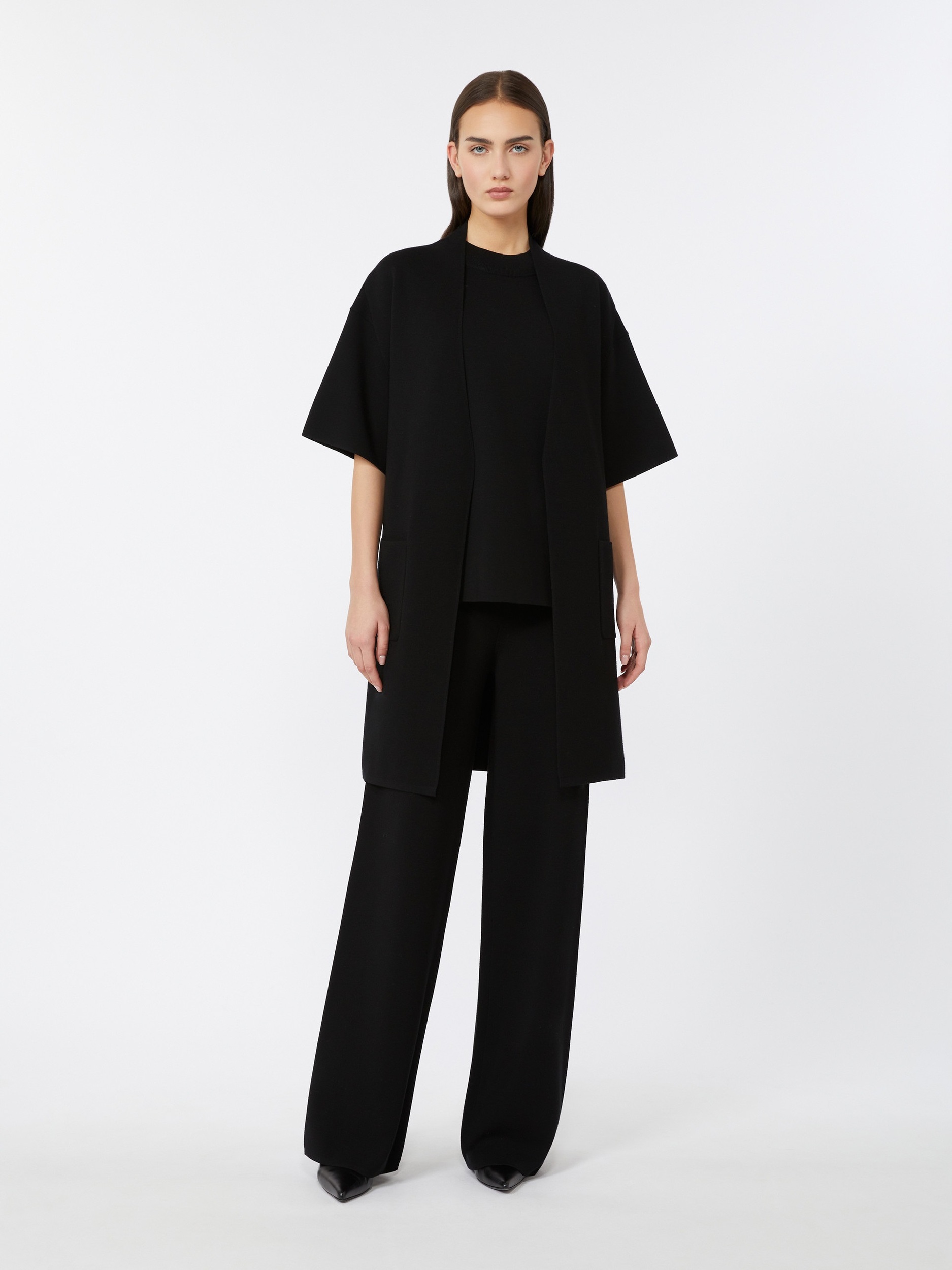 Штани Max Mara Studio чорного кольору з еластичної віскозної пряжі з легким лляним ефектом. Прямий розслаблений крій із м’яким розкльошенням донизу та комфортним поясом на резинці. Поєднуються з топами, жилетами, об’ємними джемперами та сорочками навипуск. Зручна альтернатива класичним штанам — підходить для щоденних луків і невимушеного офісного стилю.