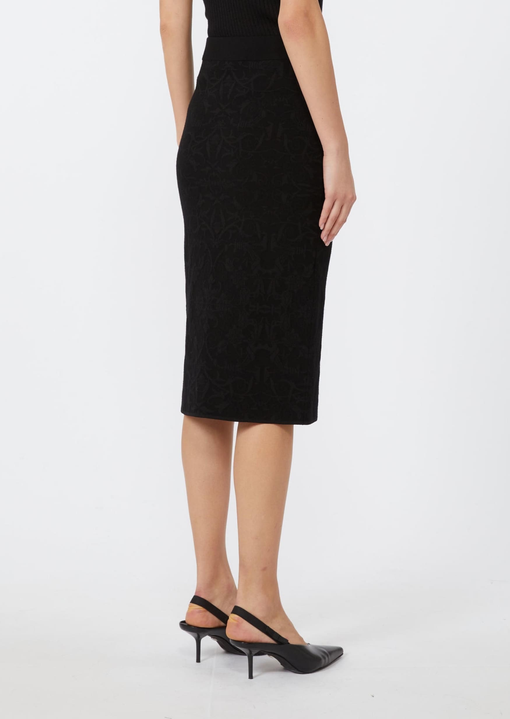 Спідниця-олівець Max Mara Studio чорного кольору з еластичної тканини з візерунком джерсі. Приталений силует з акцентом на талії й акуратною довжиною нижче коліна. Матеріал середньої щільності забезпечує комфорт та утримання форми — не вибагливий у догляді, підкреслює класичний стиль. Поєднується з білими сорочками, тонкими джемперами, жакетами прямого крою й лаконічним взуттям — босоніжками або лоферами. Універсальна базова річ для офісу та вечірніх подій — стримана, жіночна і практична.