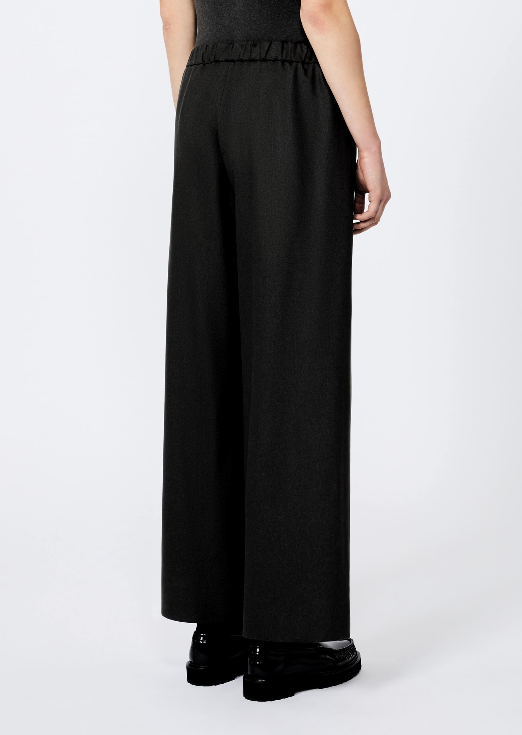 Штани Max Mara S у чорному кольорі виготовлені з еластичної вовняної тканини з гладкою текстурою. Поєднуються з сорочками, топами, блейзерами та пальтами. Сучасна база для офісних і щоденних образів.