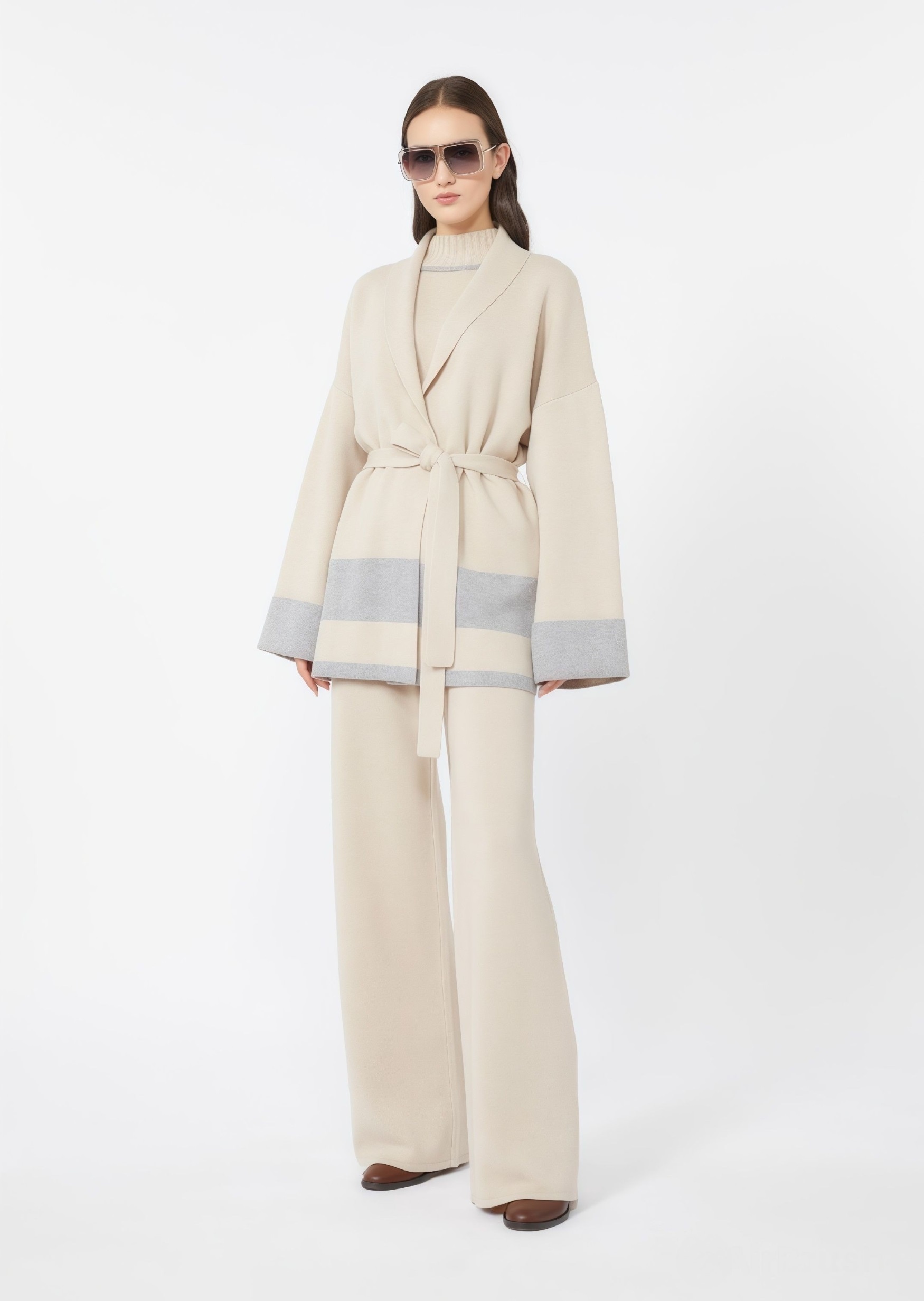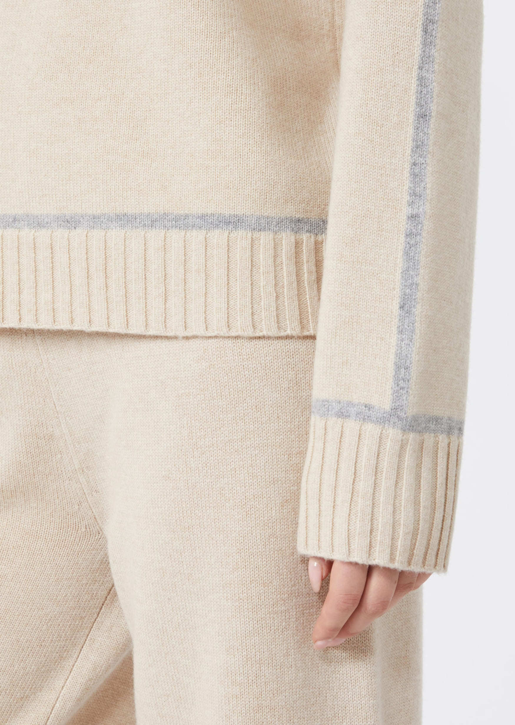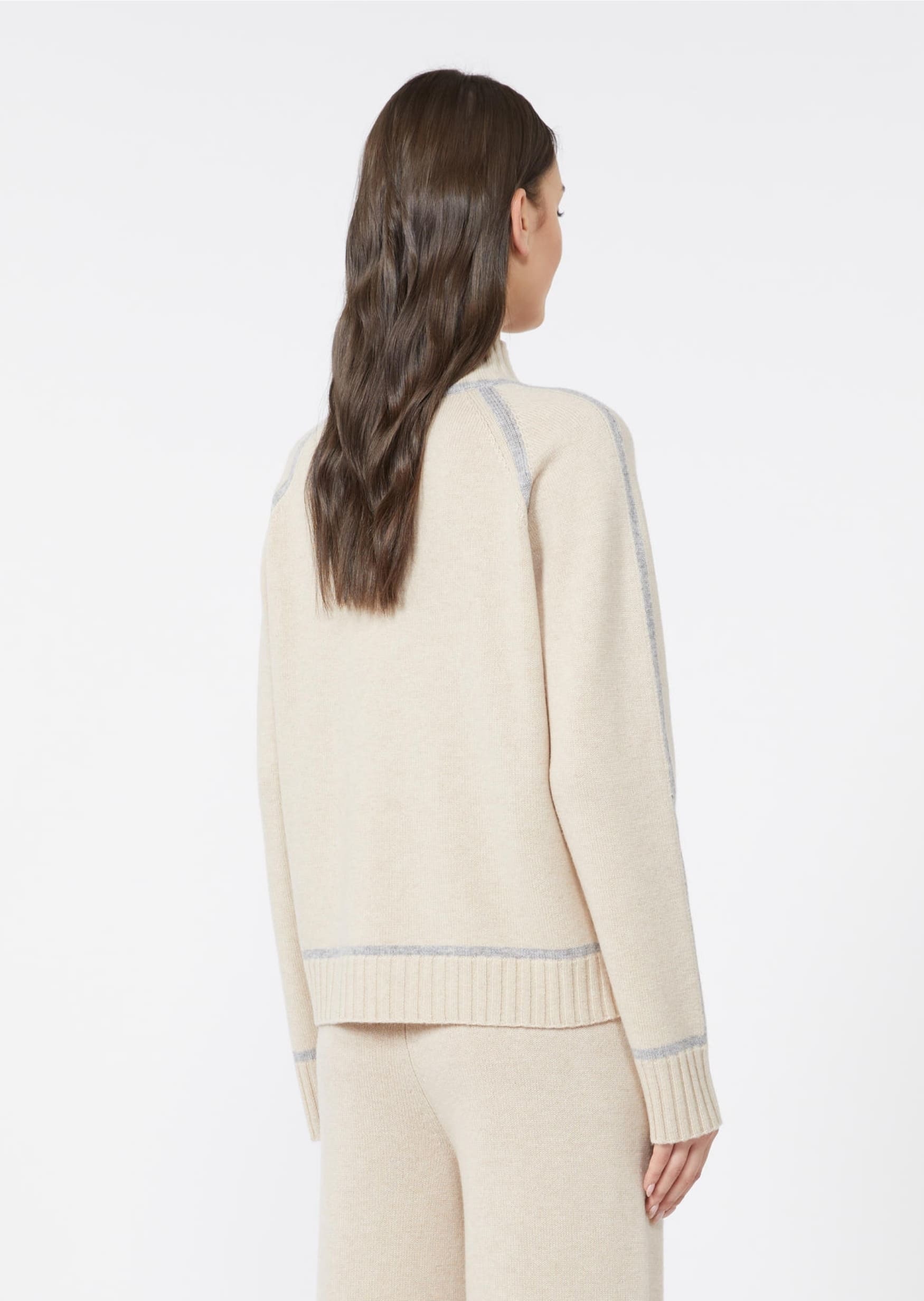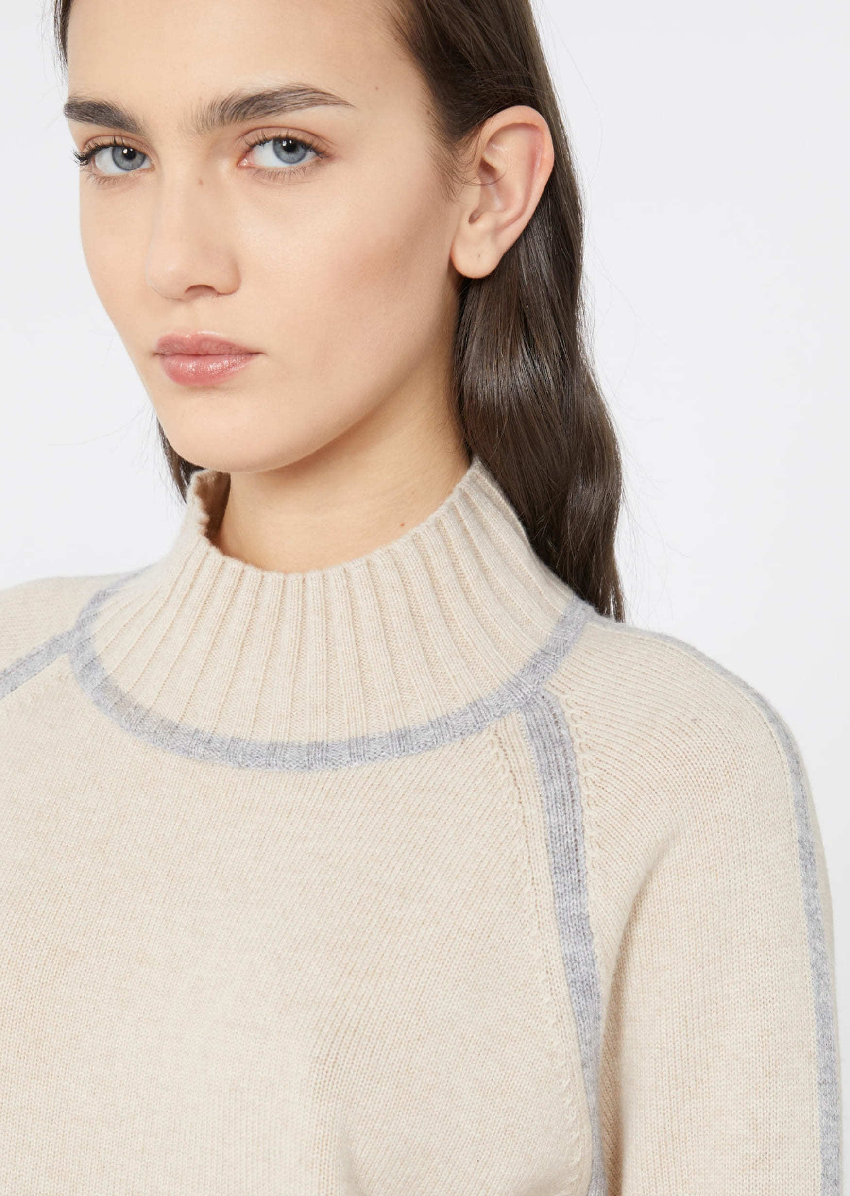 Джемпер зі м’якої вовни з додаванням кашеміру у базовому бежевому відтінку. Прямий крій з еластичними деталями по горловині, манжетах і низу. Щільна текстура дарує комфорт на щодень. Пасує до класичних штанів, максі-спідниць та пальт у тон. Затишна основа для осінньо-зимових багатошарових луків.
