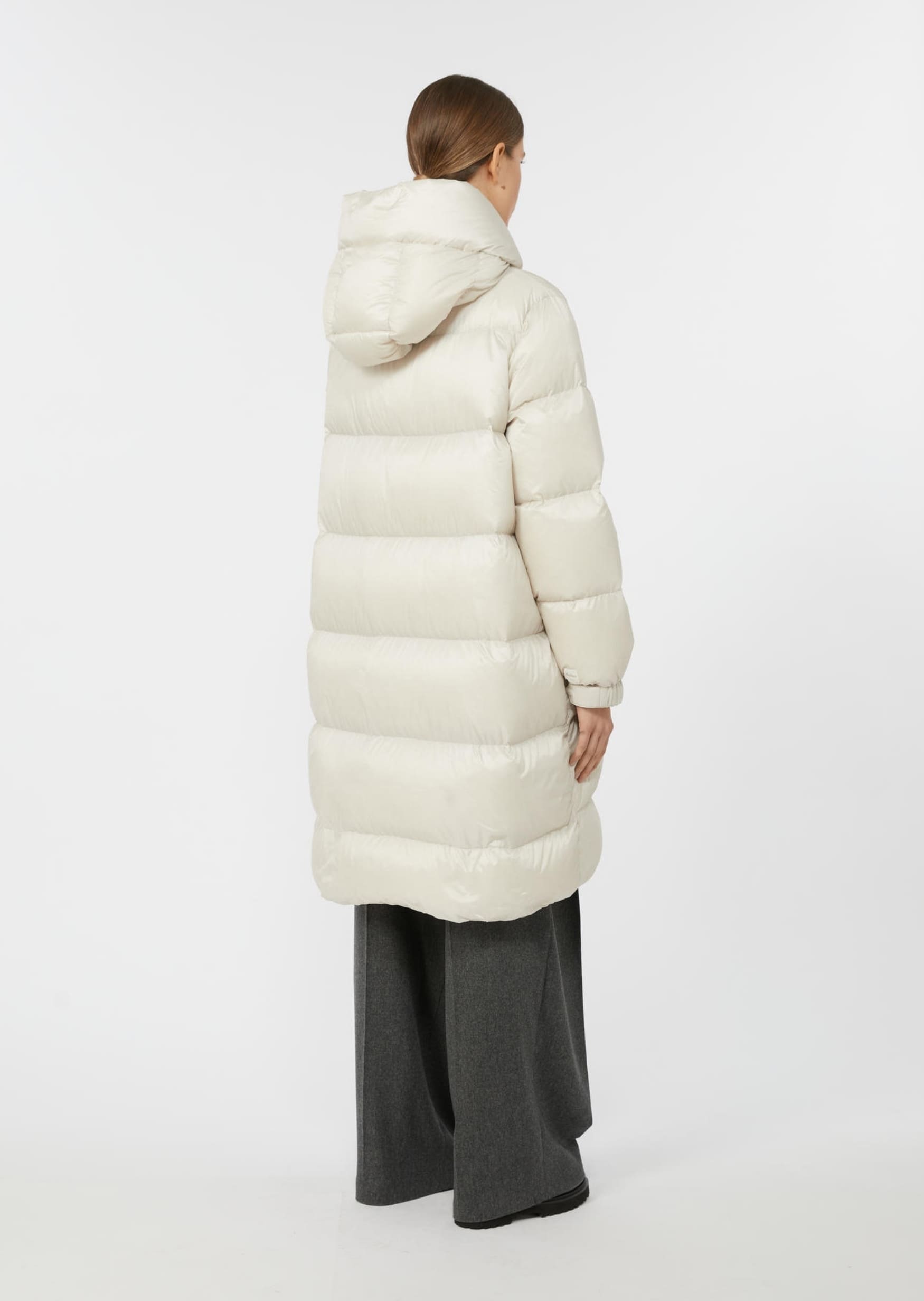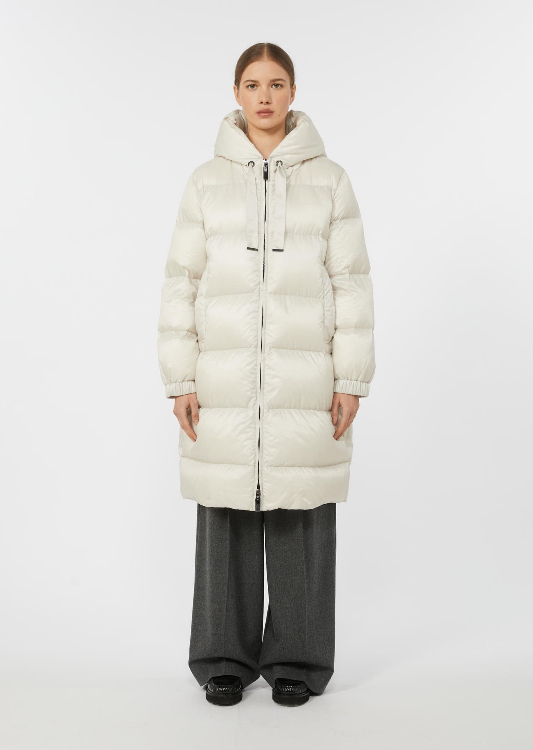 Подовжений білий пуховик Max Mara Cube із гладкого поліестеру й утеплений синтетичним наповнювачем — теплий, легкий і невибагливий у догляді. Застібка на блискавку, об’ємний капюшон і вшиті бокові кишені створюють лаконічний та зручний силует. Функціональний вибір на щодень — надійний захист від холоду та універсальний стиль.