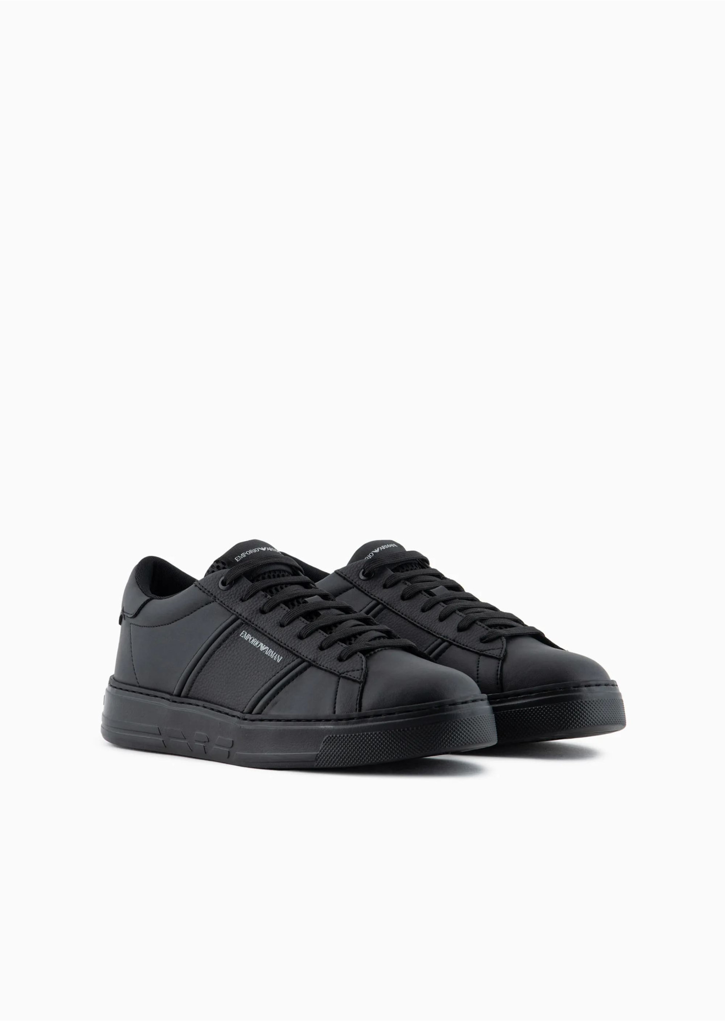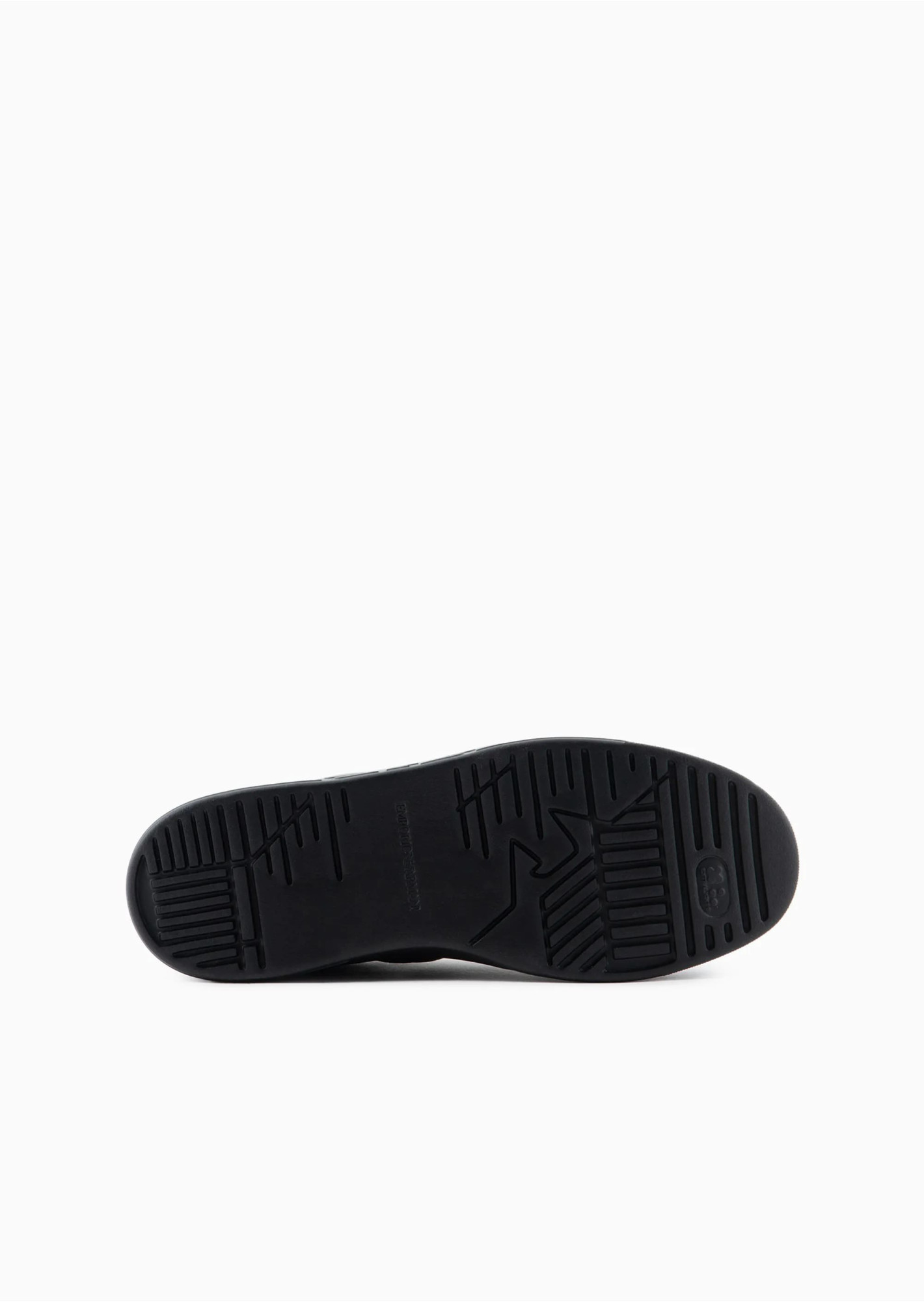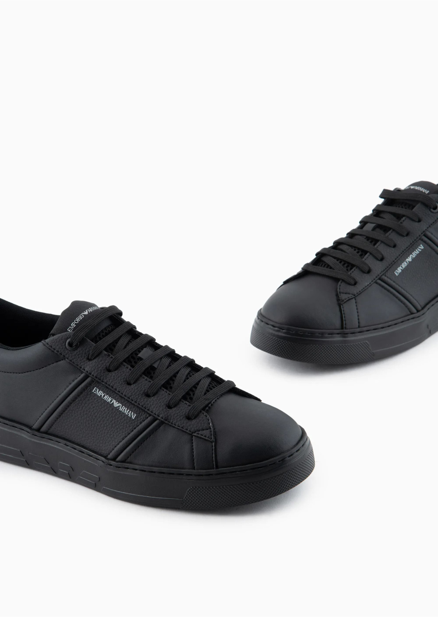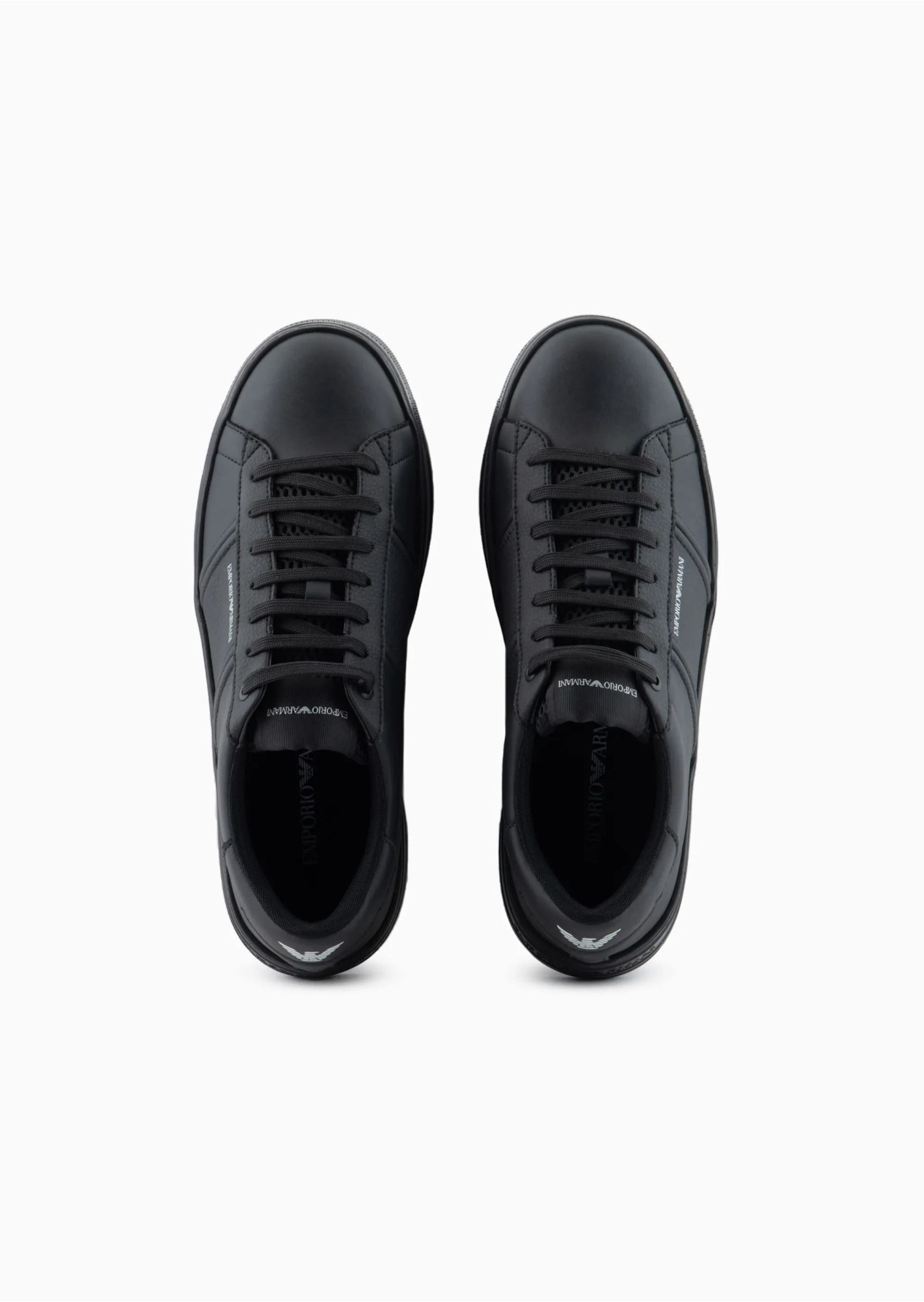 Кросівки з телячої шкіри з логотипом збоку. На передній частині язичка та на задній вкладці нанесено трафаретний друк логотипу Emporio Armani та мотив орла.
