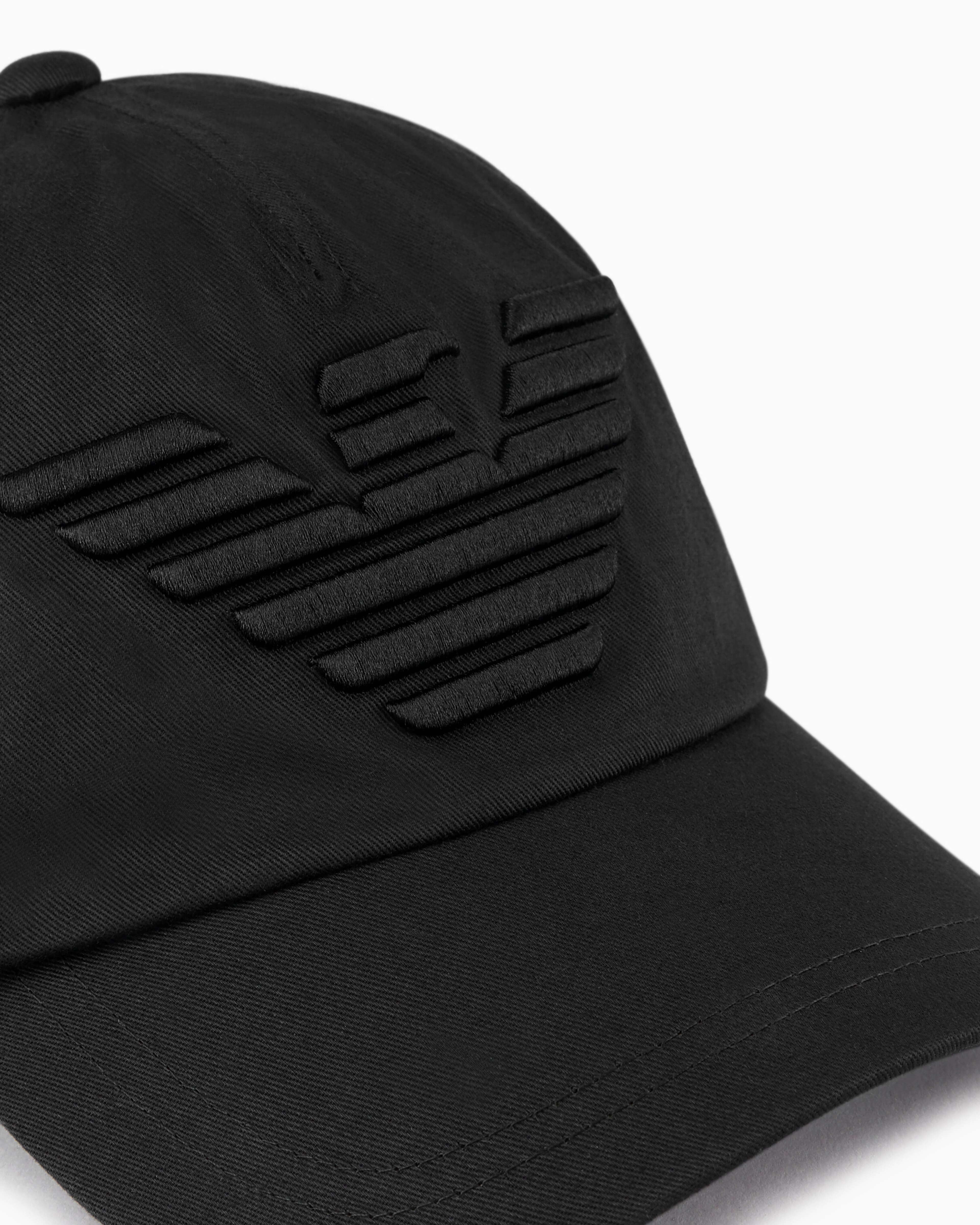 Чорна кепка з бавовняної тканини з рельєфною вишивкою у вигляді збільшеного фірмового орла. Жорсткий козирок тримає форму, бавовняна підкладка забезпечує комфорт, а регульована застібка ззаду дозволяє точно налаштувати посадку. Яскравий акцент у лаконічному виконанні — для тих, хто цінує стиль без компромісів. Ідеально поєднується з вітрівками, худі та повсякденними джогерами. Функціональний аксесуар, що додає образу характеру.