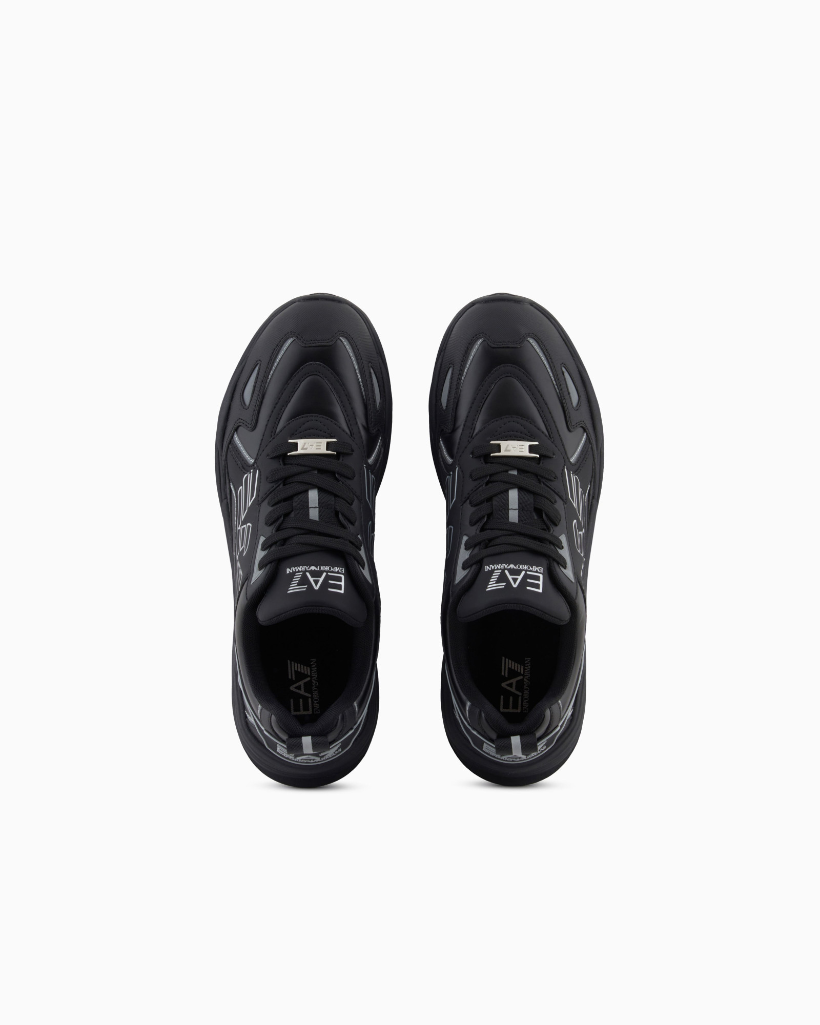 Кросівки EA7 Emporio Armani у стилі бігових моделей поєднують монохромний верх і підошву, створюючи цілісний графічний силует. Легкий текстиль з еластаном забезпечує комфортну посадку, а світловідбивні вставки додають виразного акценту. Об’ємний логотип Eagle на боковій частині та фірмовий знак на п’яті підкреслюють спортивний характер. Проміжна підошва з EVA пом’якшує крок, а гумова підошва гарантує надійне зчеплення. Поєднуються з джогерами, спортивними шортами або денімом, формуючи сучасний та енергійний образ.