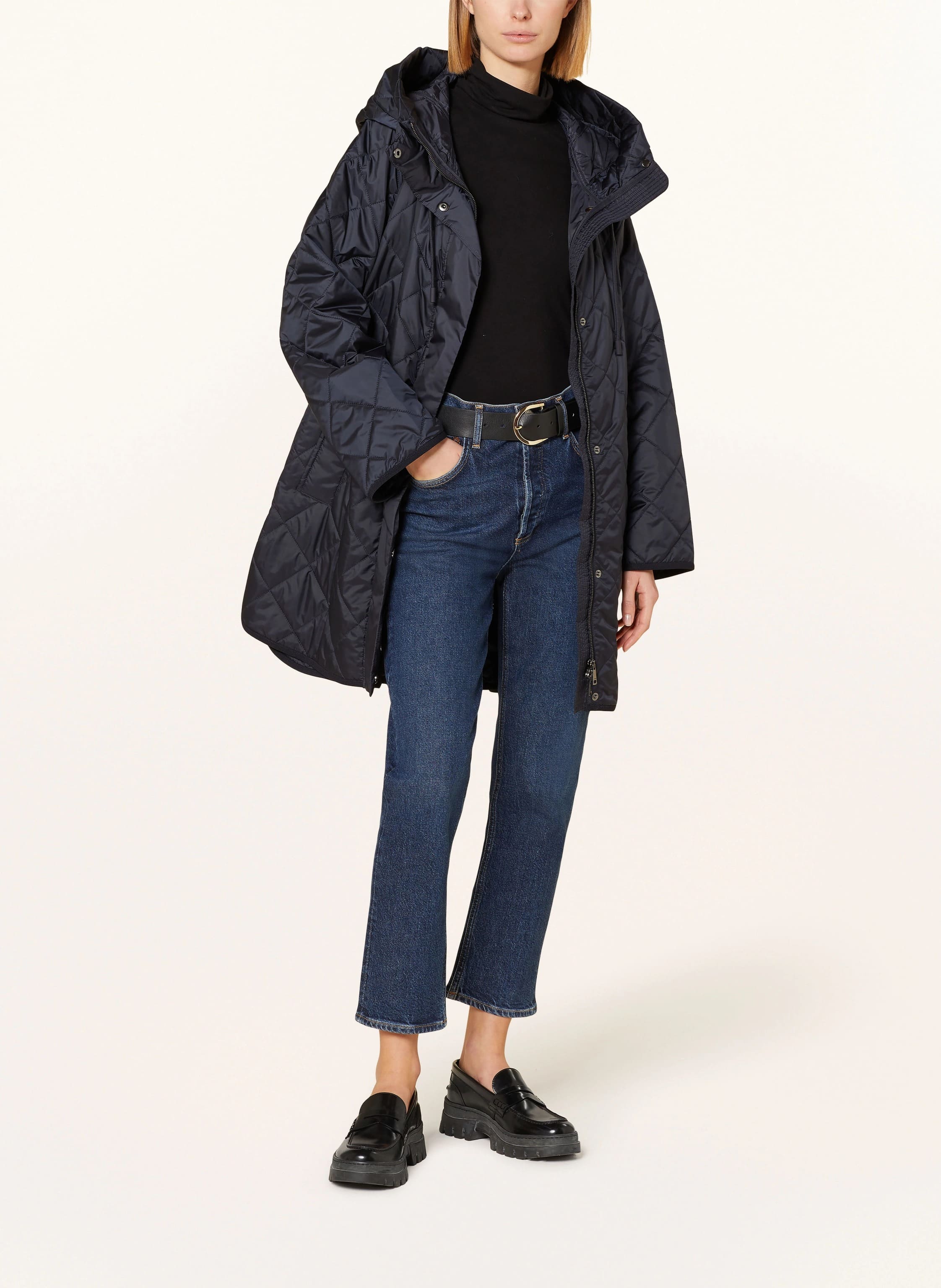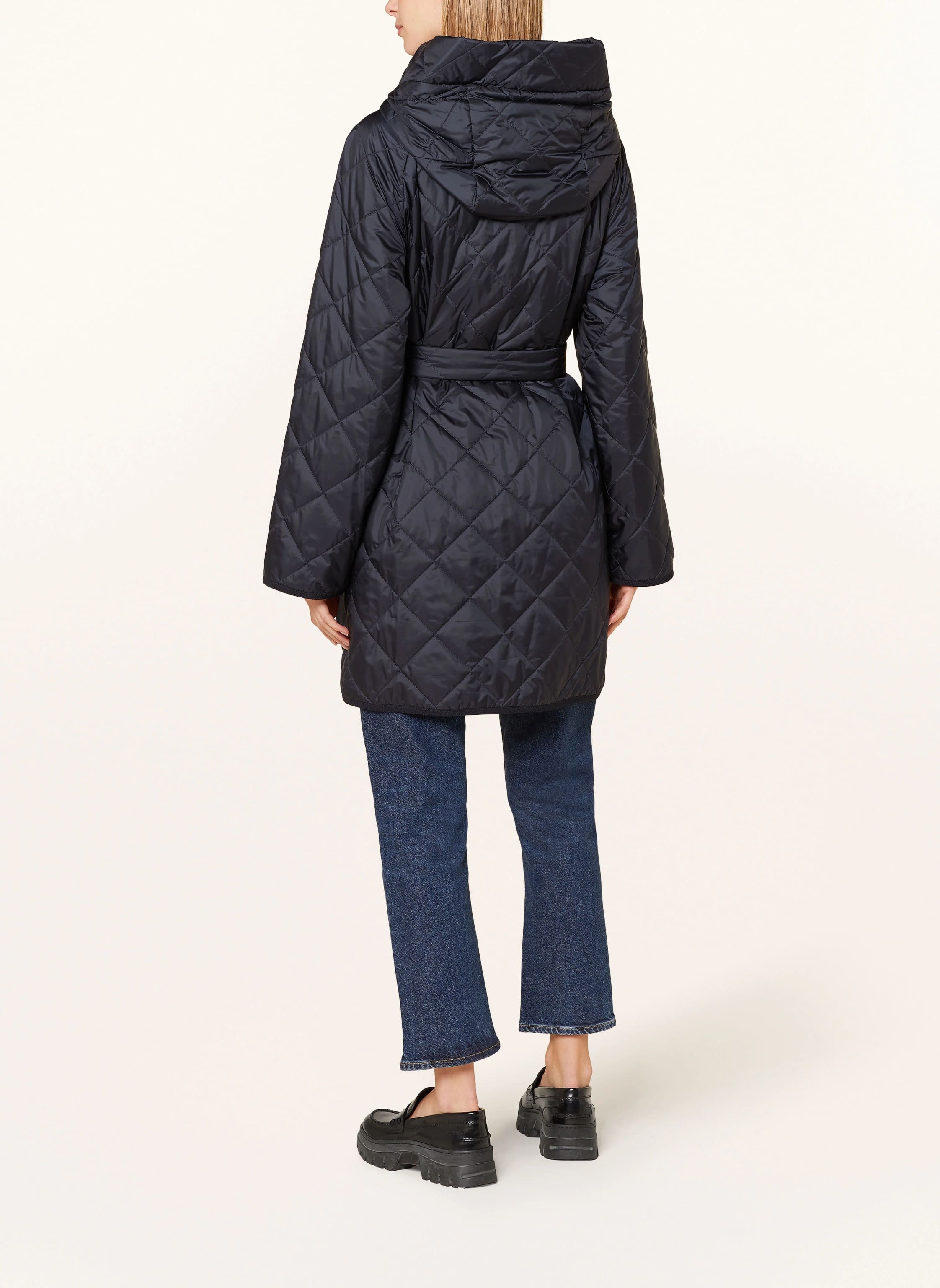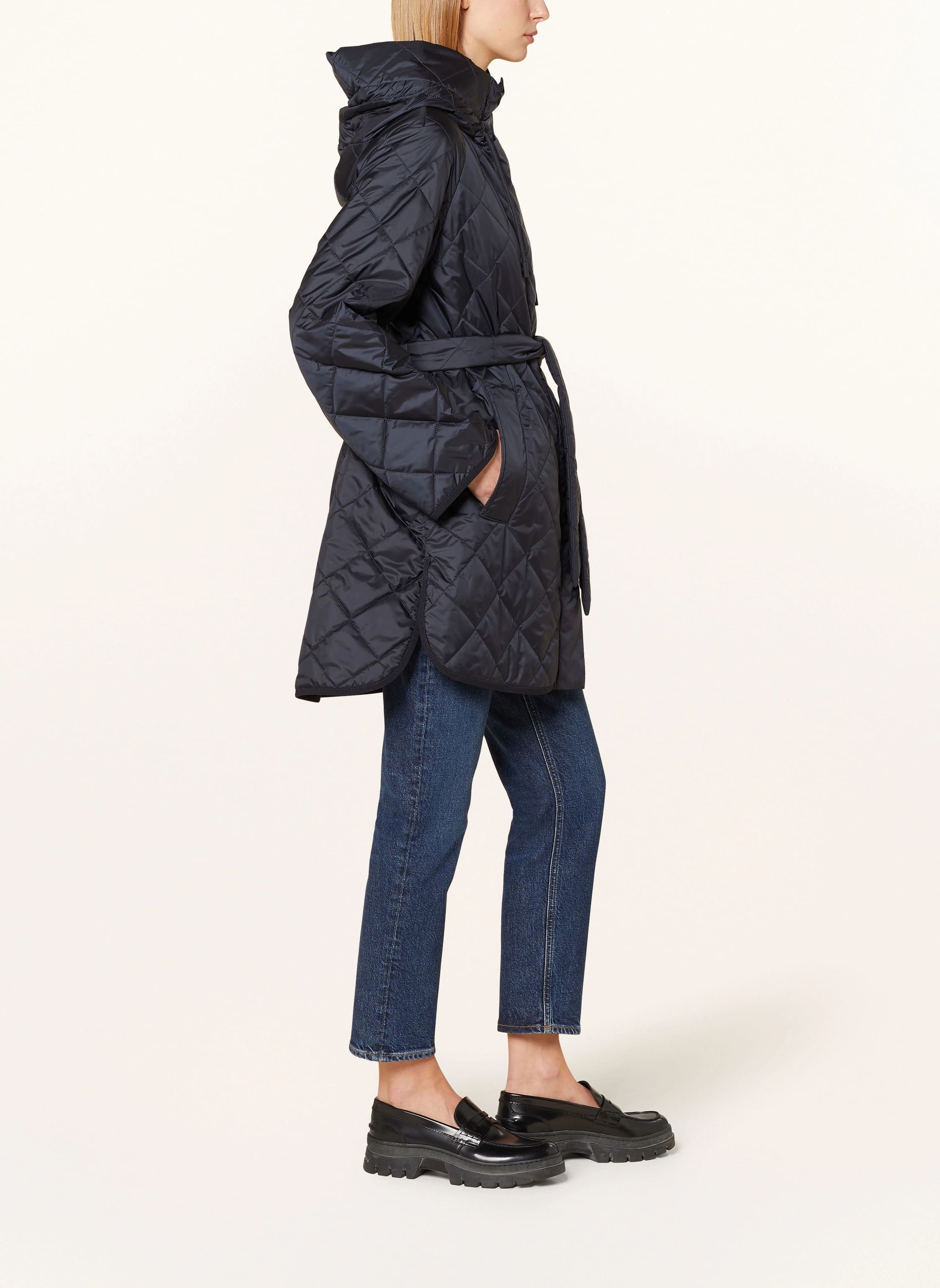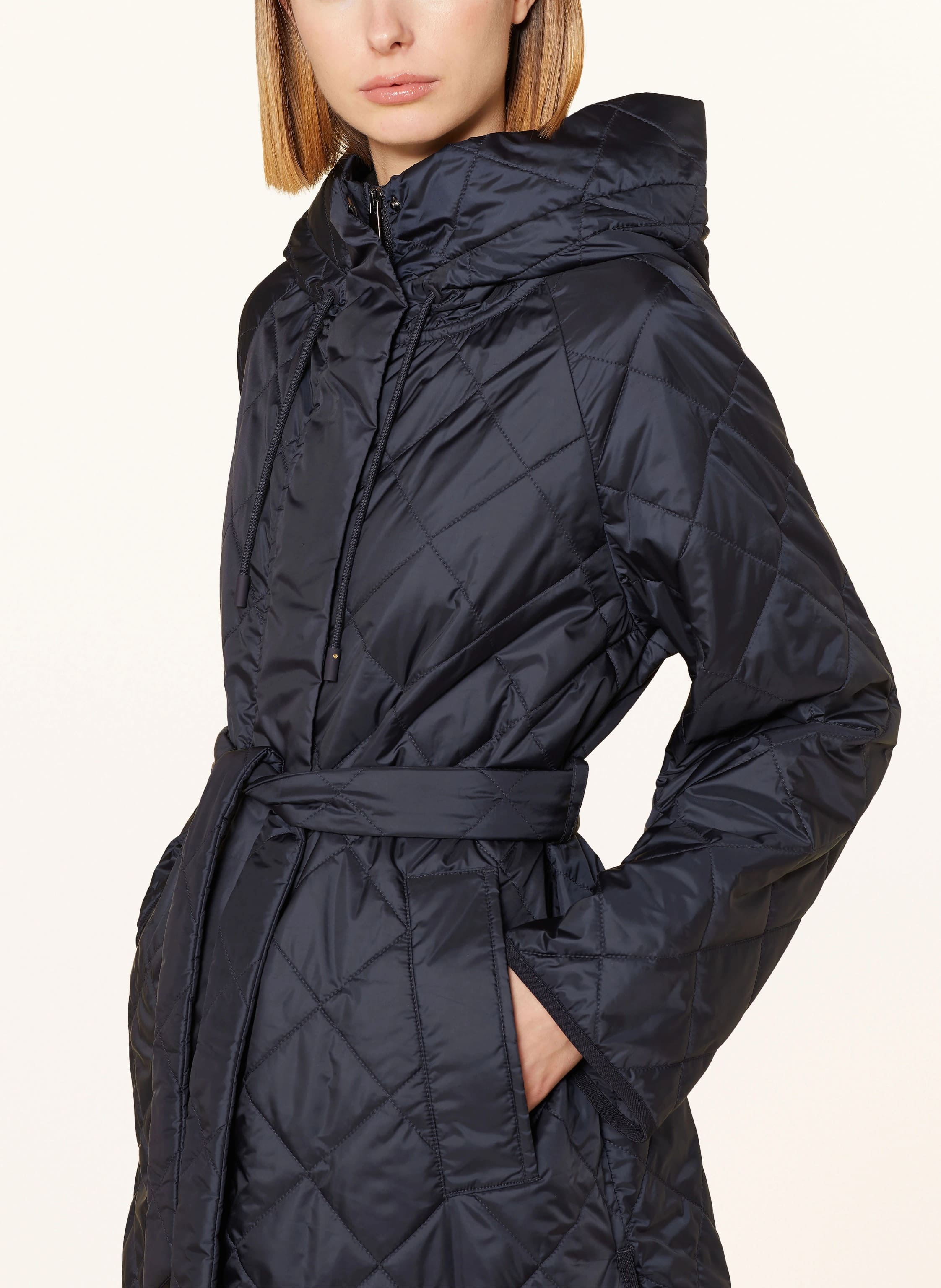 Куртка з капюшоном з водовідштовхувальної технічної тканини, ромбовидною стьобкою та утеплювачем 80 г LUXEPAD. Злегка розширена модель комфортного крою має рукави реглан і водонепроникні бічні кишені. Пояс в тон, що підкреслює лінію талії. Ззаду комір прикрашений деталлю Weekend Max Mara. Потайна застібка-блискавка та кнопки спереду.