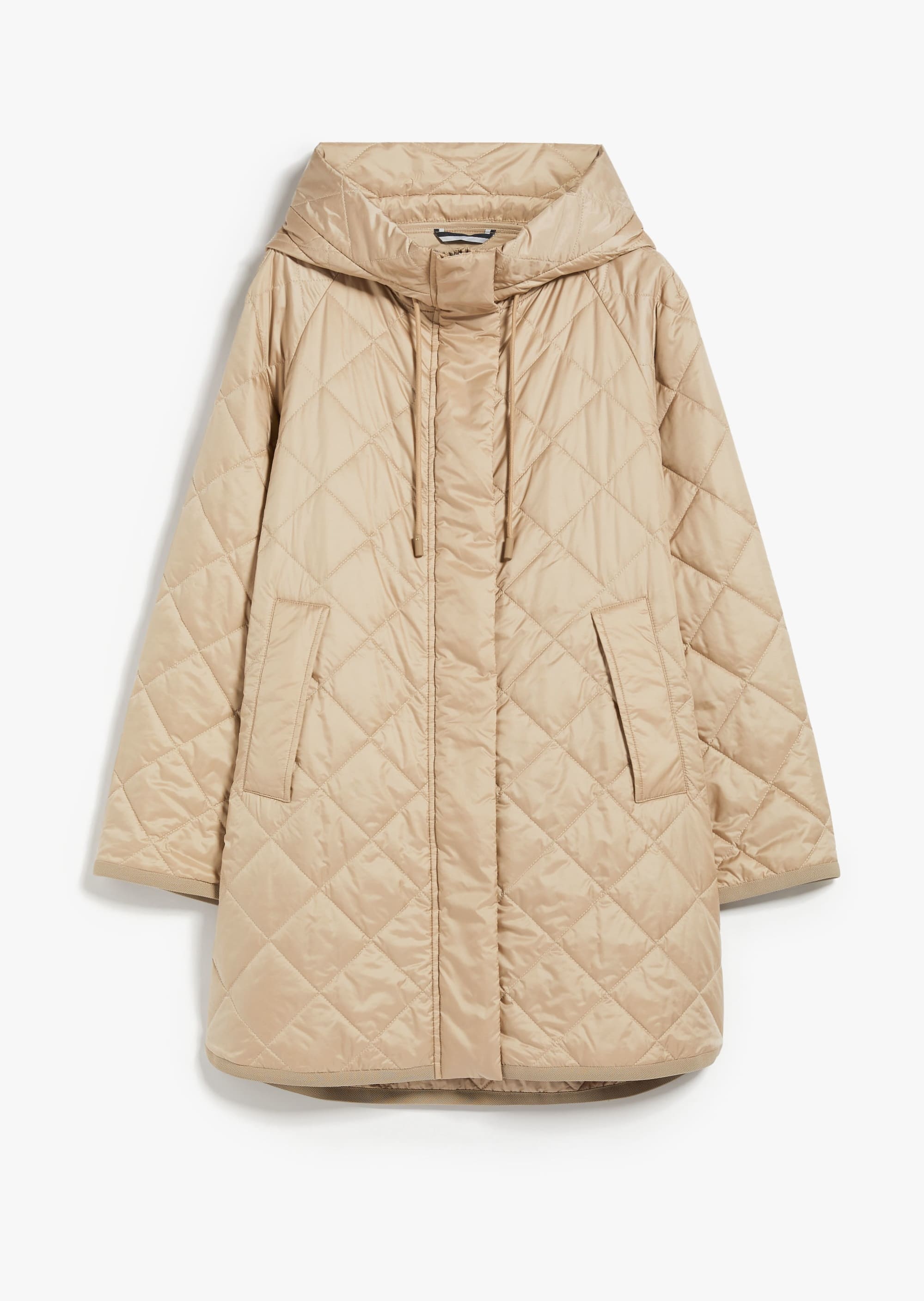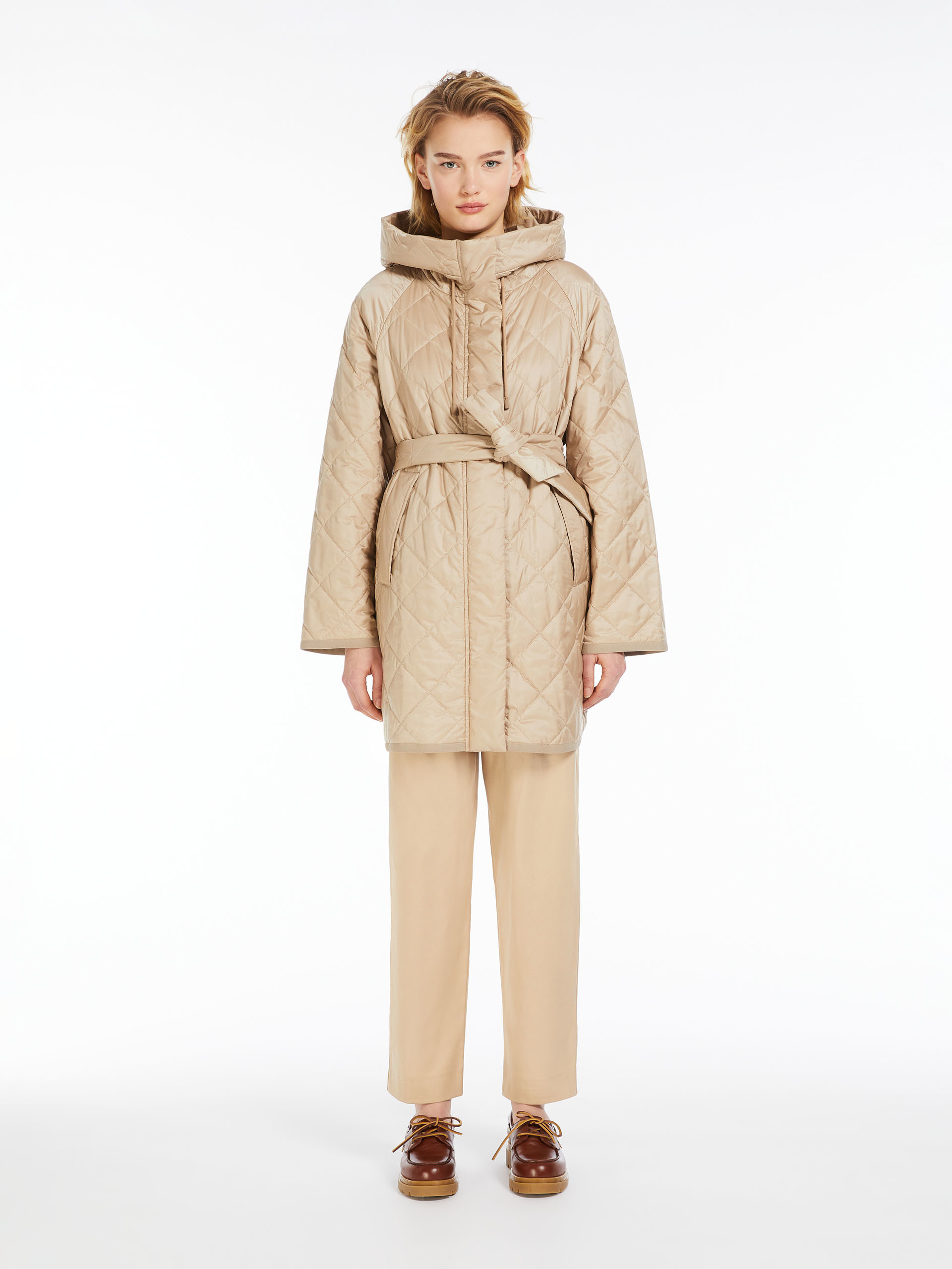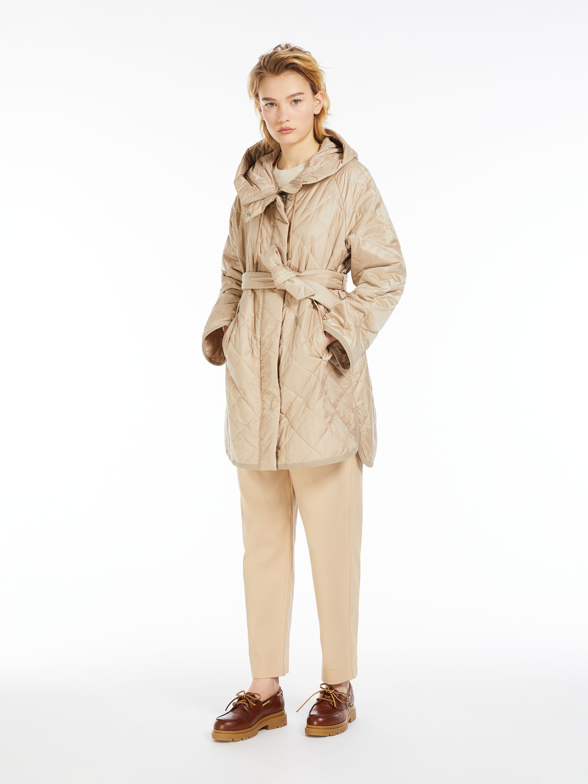 Куртка з капюшоном з водовідштовхувальної технічної тканини, ромбовидною стьобкою та утеплювачем 80 г LUXEPAD. Злегка розширена модель комфортного крою має рукави реглан і водонепроникні бічні кишені. Пояс в тон, що підкреслює лінію талії. Ззаду комір прикрашений деталлю Weekend Max Mara. Потайна застібка-блискавка та кнопки спереду.