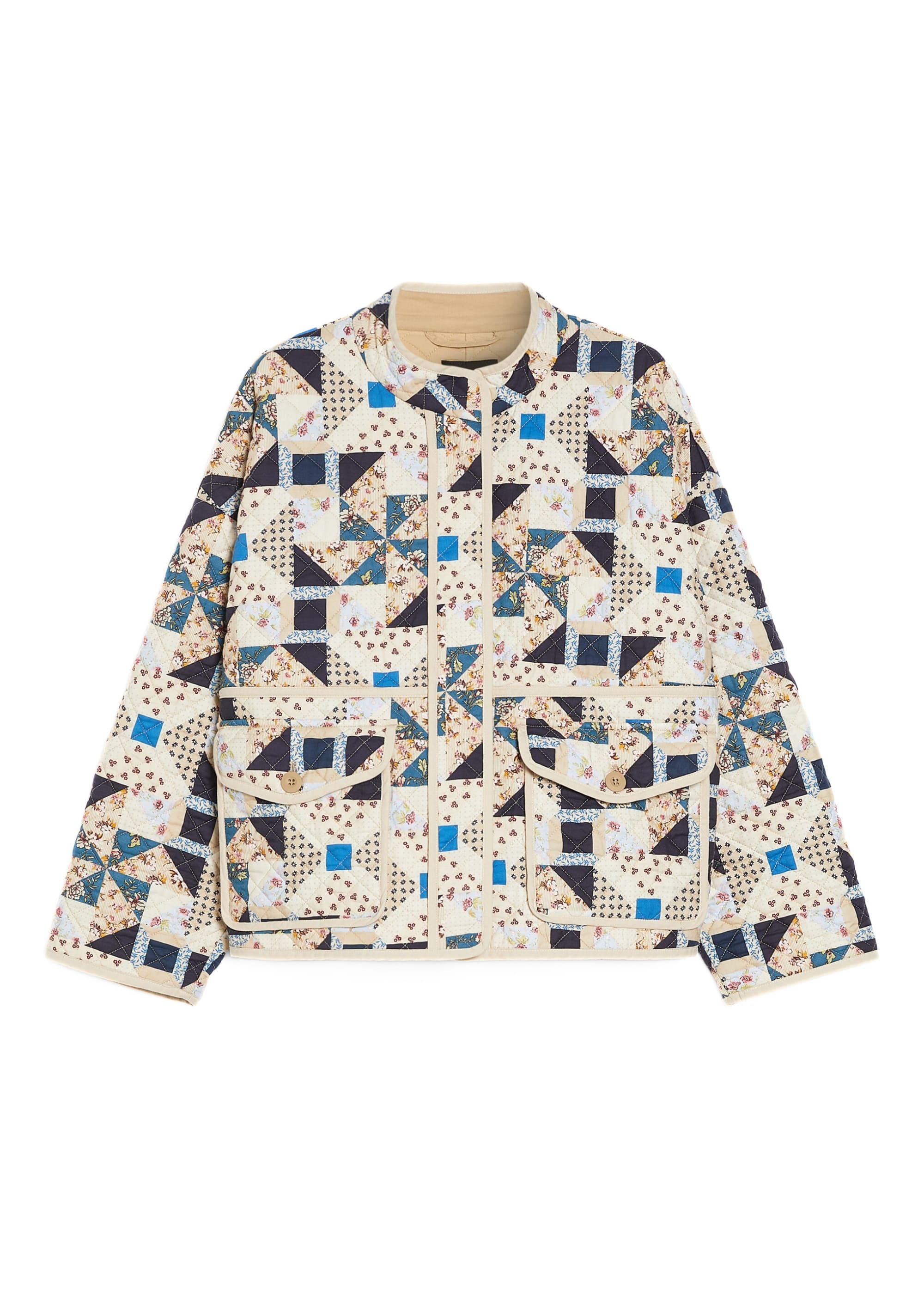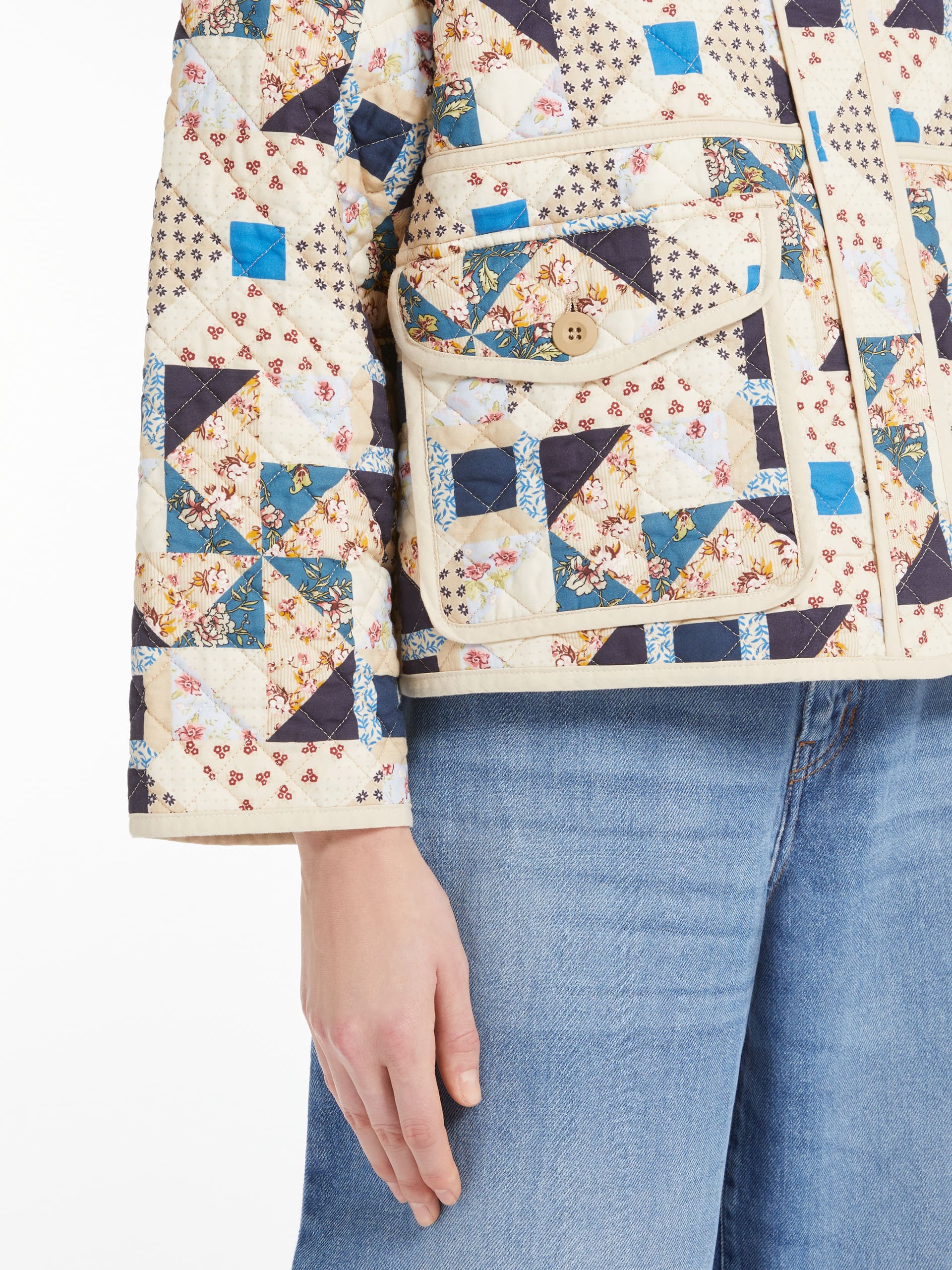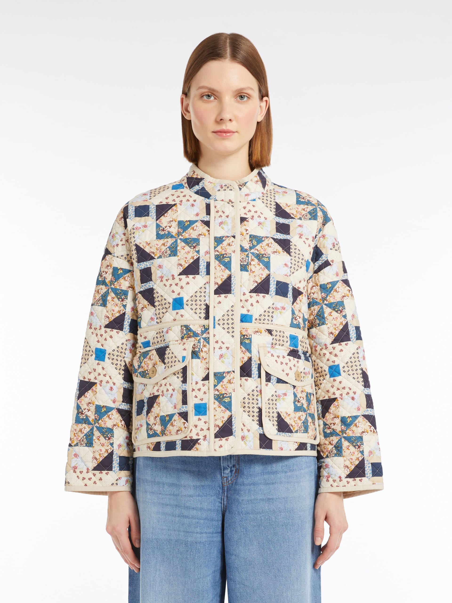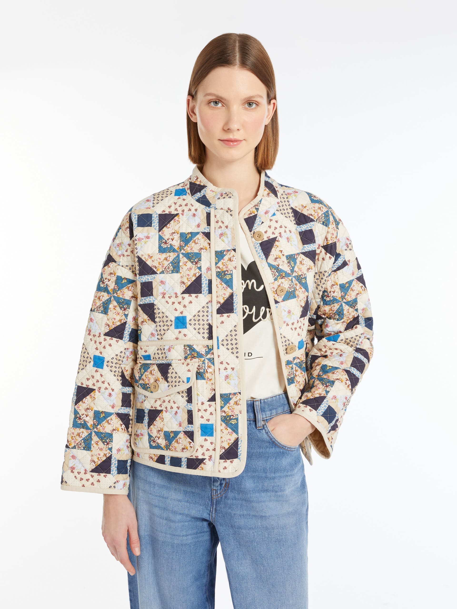 Куртка Weekend Max Mara виготовлена з бавовняної тканини з візерунчастим принтом. Стьобана структура з синтетичним утеплювачем забезпечує комфорт у прохолодну погоду. Модель має застібку на ґудзики, бічні кишені та прямий крій, що поєднує практичність і стиль. Яскраве багатоколірне забарвлення додає виробу виразності. Куртка ідеально підходить для створення повсякденних образів міжсезоння — легко поєднується з джинсами, брюками або спідницями.