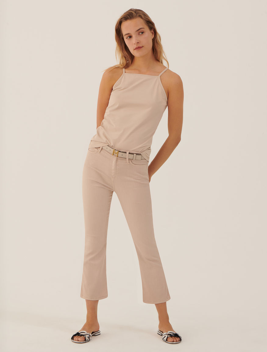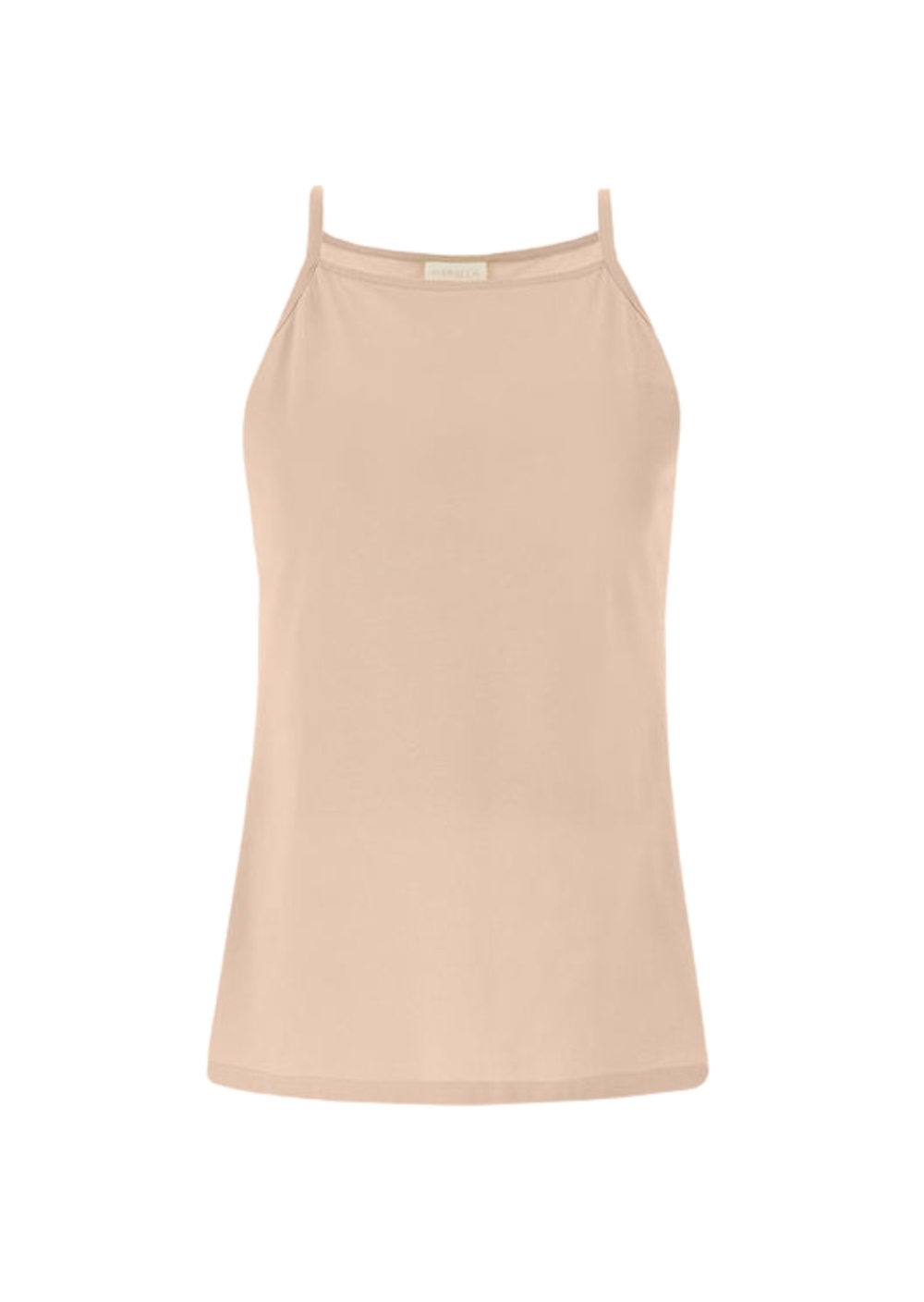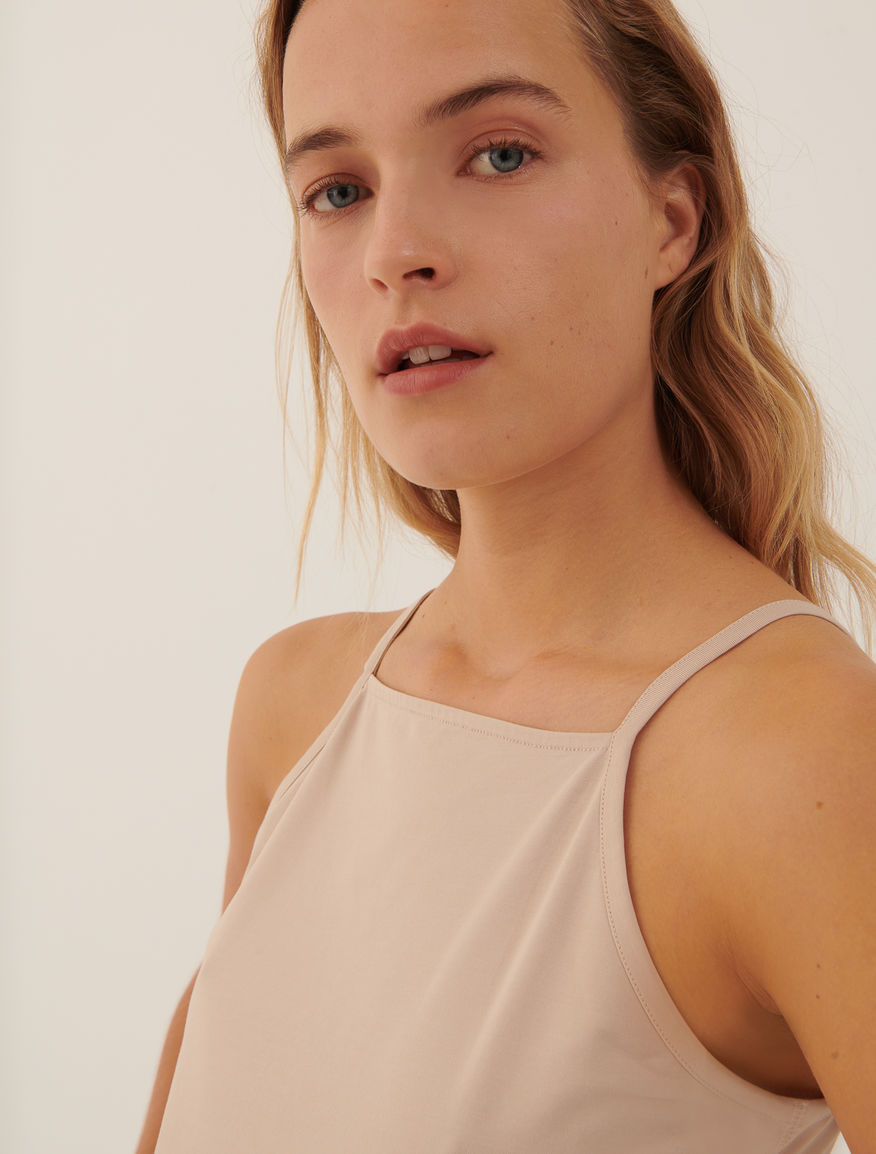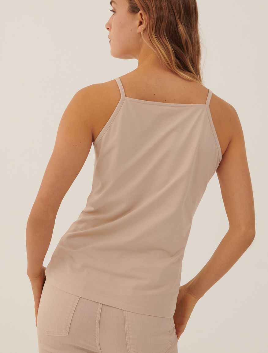 Жіноча майка бежевого кольору. Базова модель гардеробу виготовлена з еластичної бавовни. Приємна на дотик.