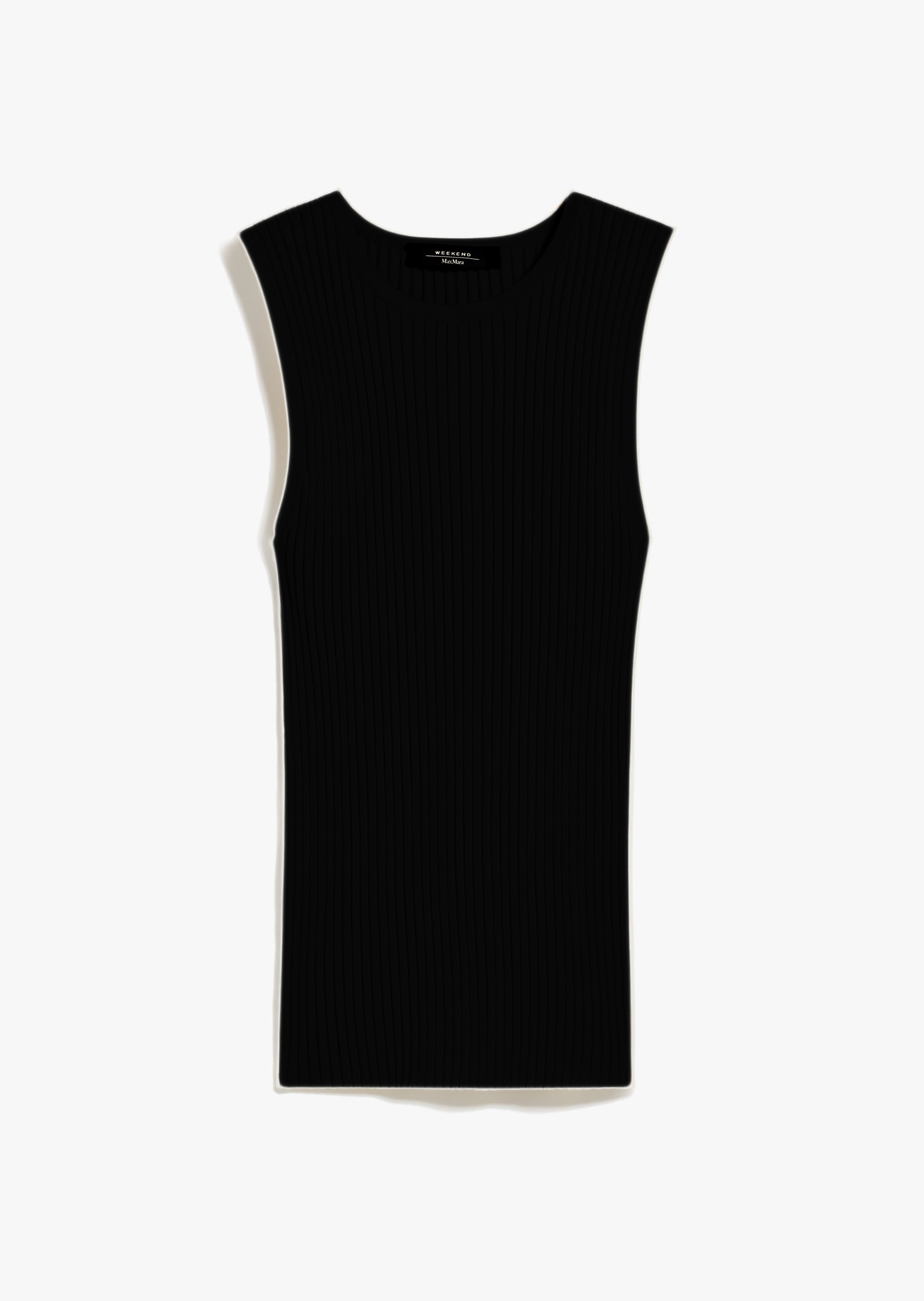 Топ без рукавів із круглим вирізом із м’якої віскозної пряжі з трикотажними деталями в рубчик. Облягаюча модель довжини міді.