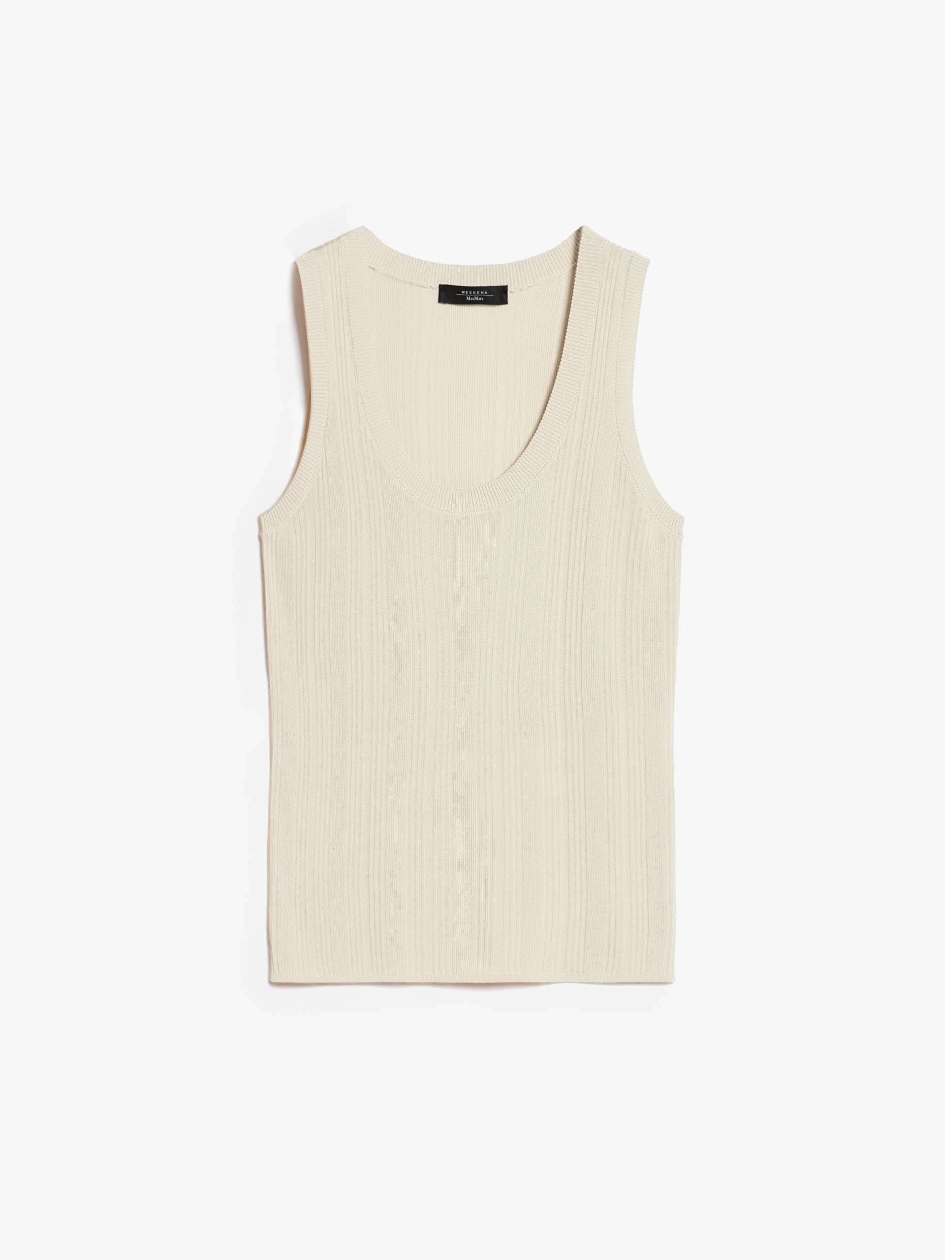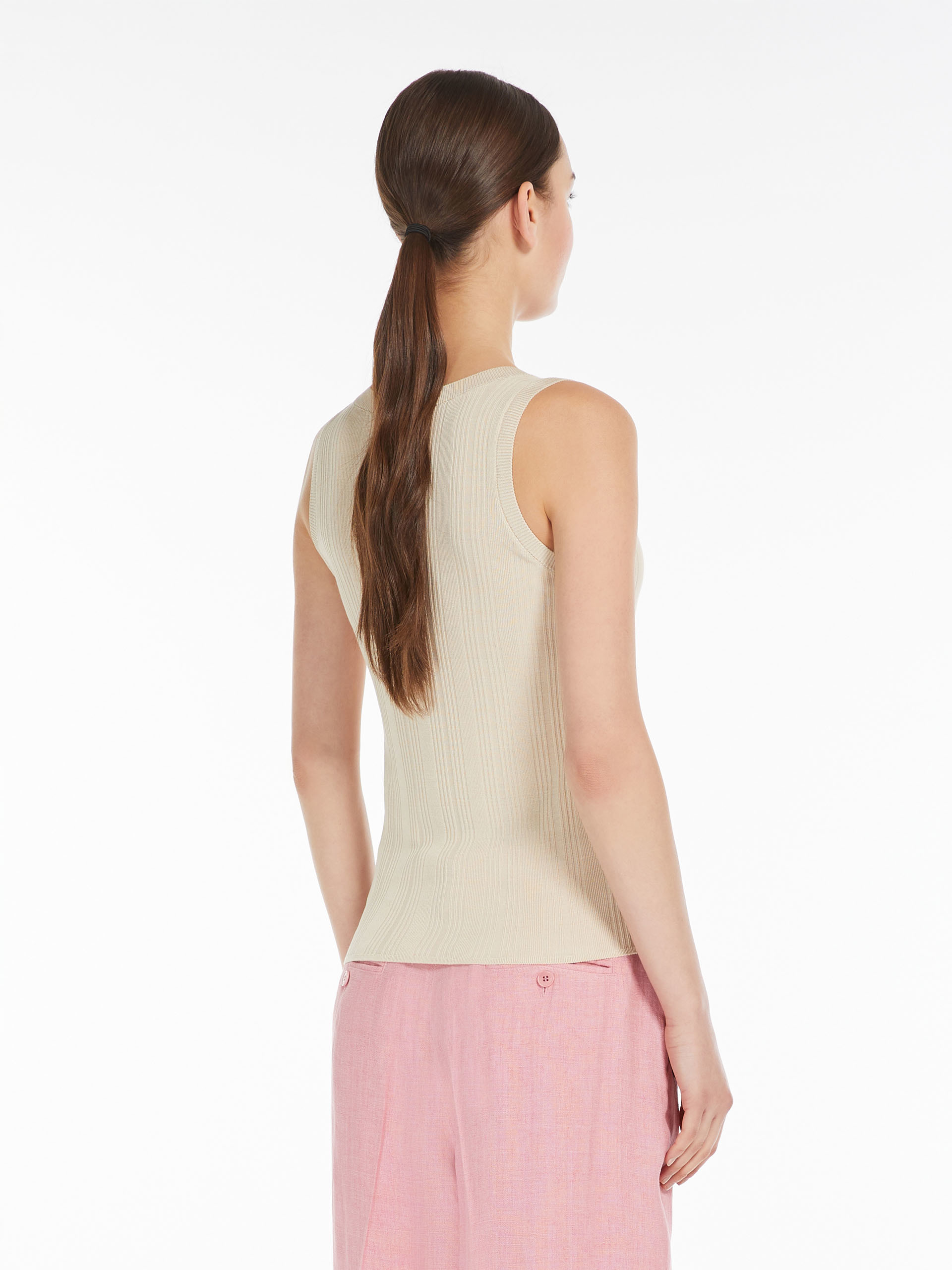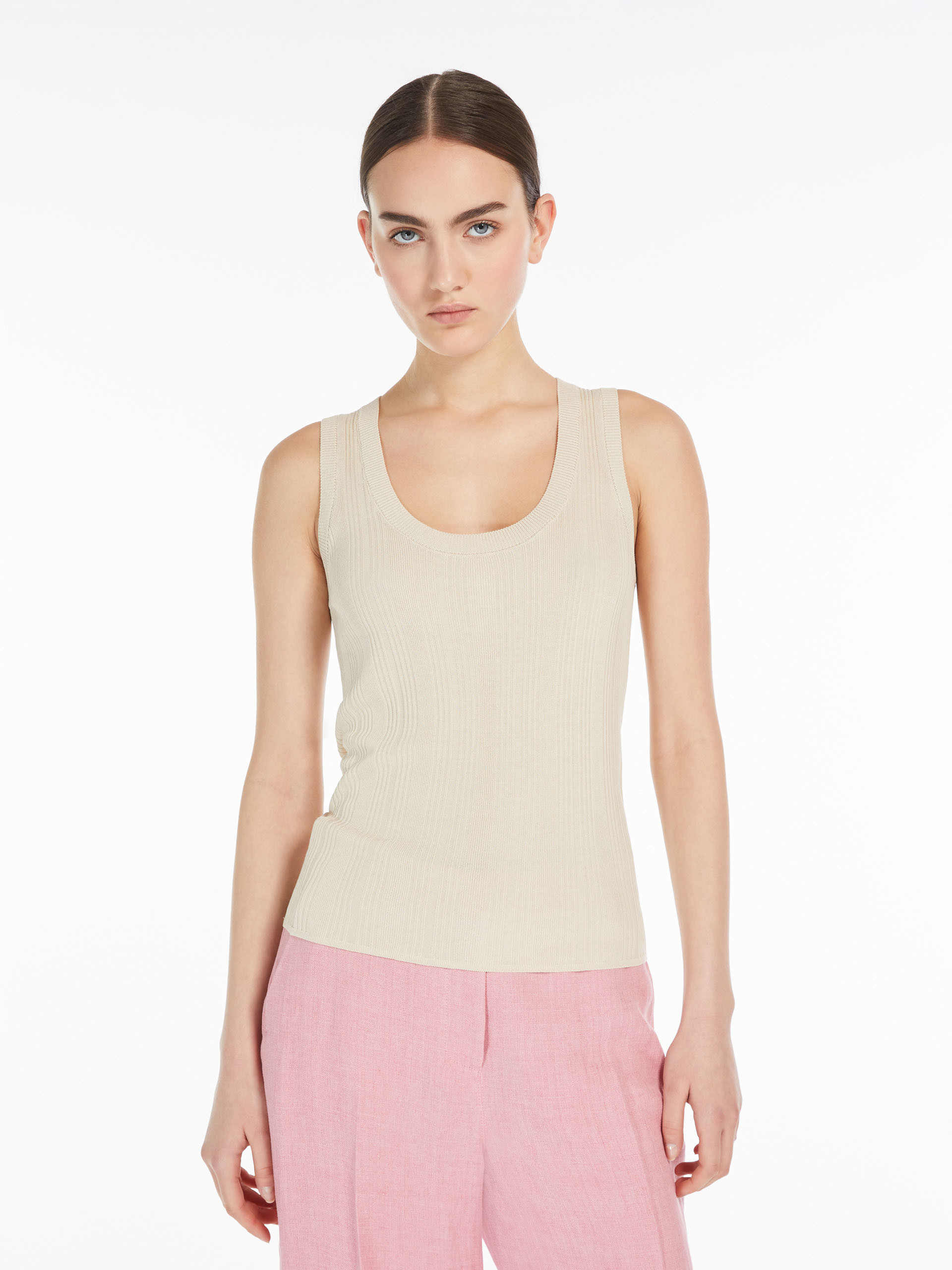 Приталений топ без рукавів із м’якої віскози. Силуетно-підкреслюючий візерунок в рубчик. Виріз горловини та пройми трикотажні.