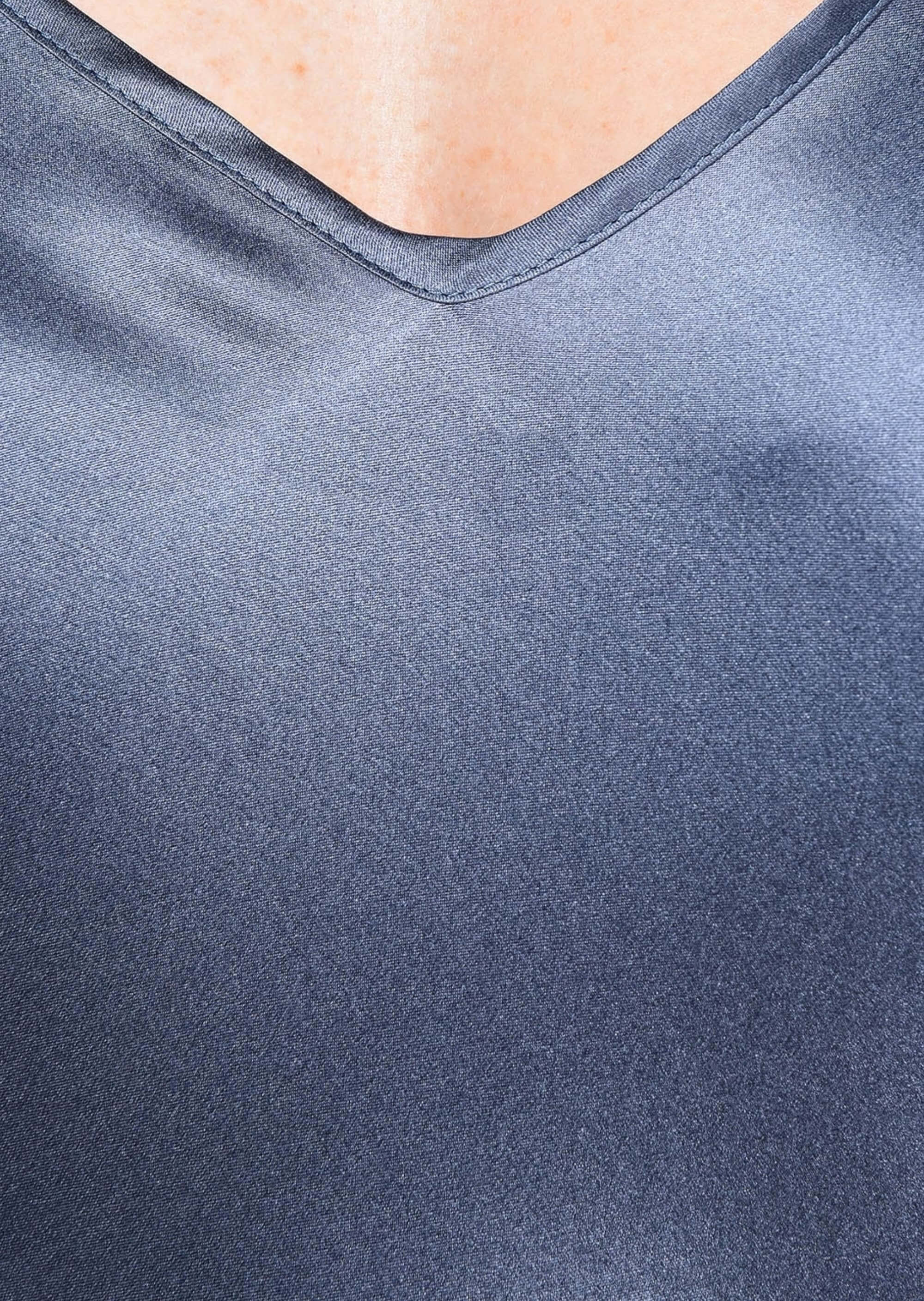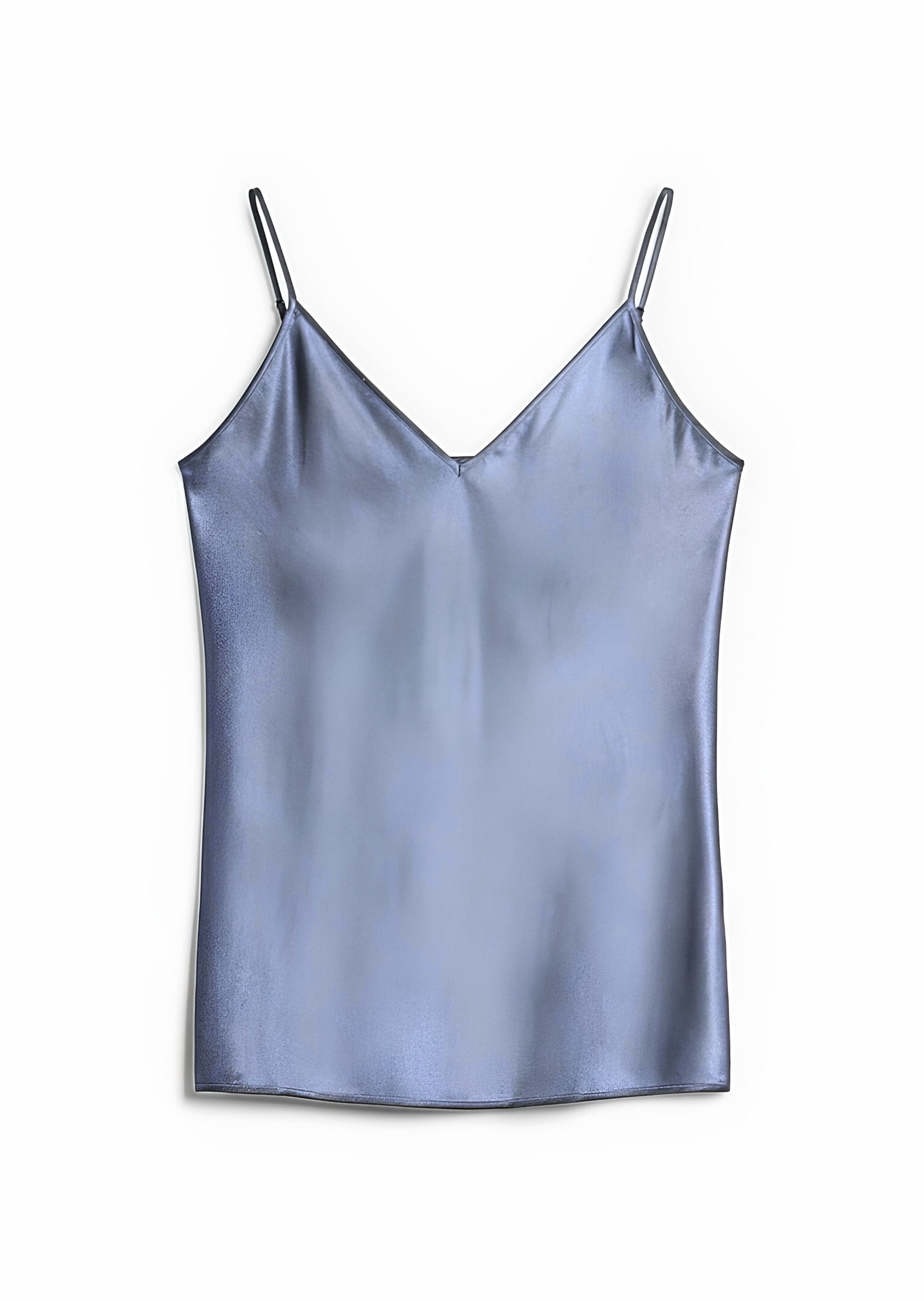 Майка із V-подібним вирізом із тонкої еластичної шовкової атласної тканини з регульованими лямками-спагетті. Модель має плавний і жіночний силует.