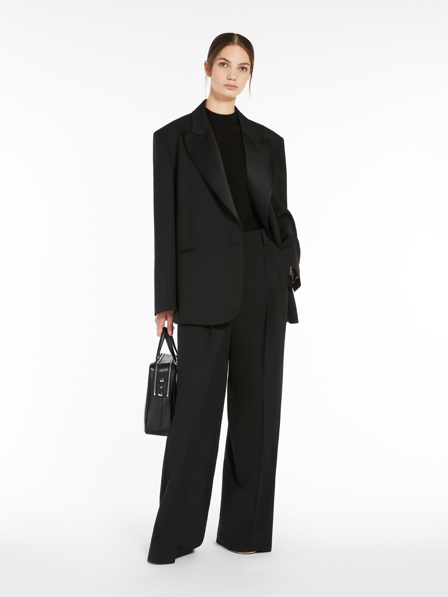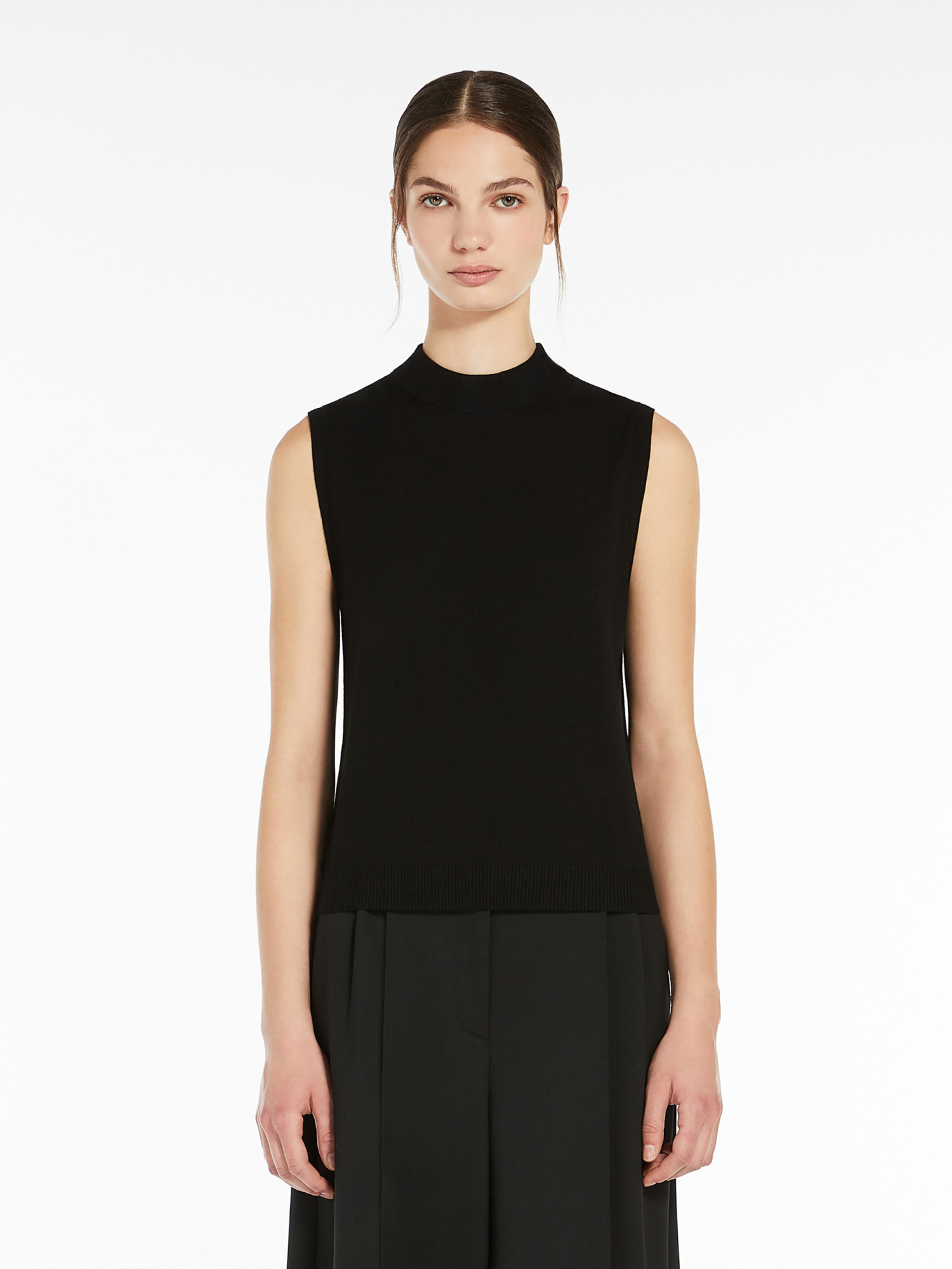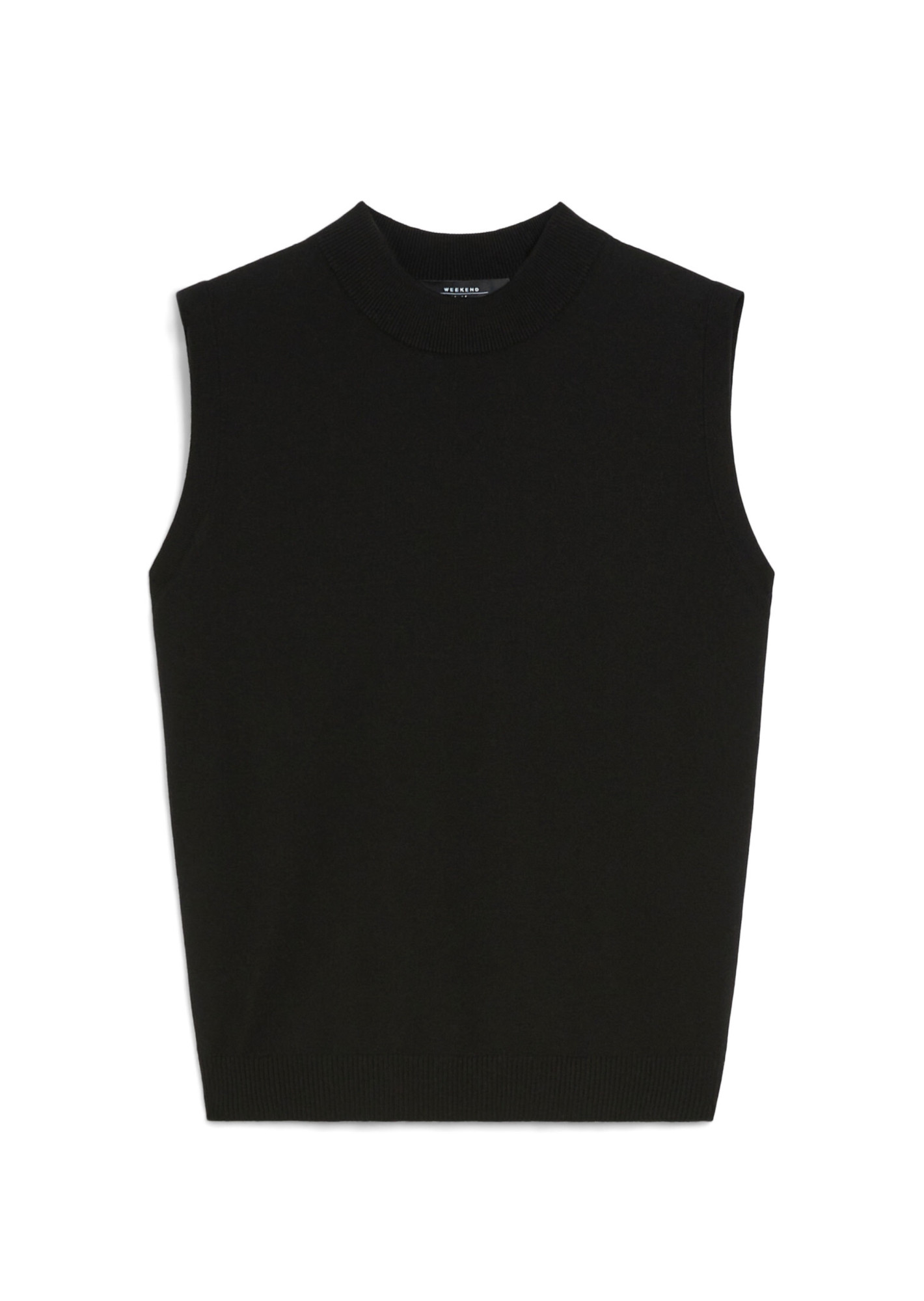 Майка чорного кольору виготовлена з віскозної пряжі. Модель прямого силуету має ребристий комір-стійку і низ.