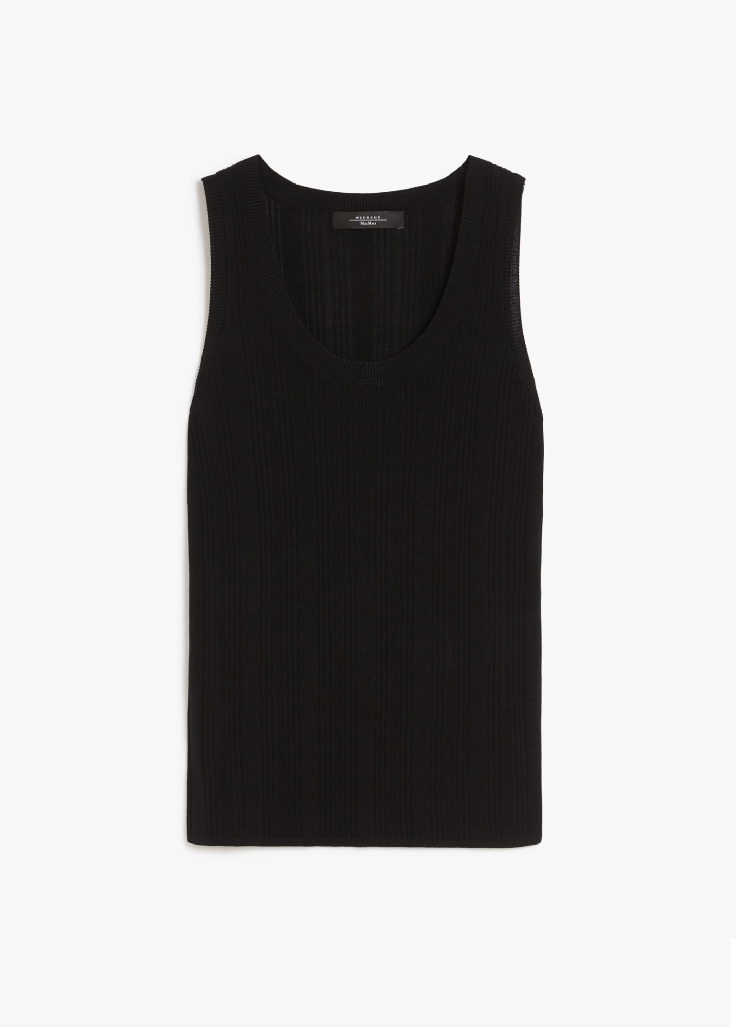 Чорна майка Weekend Max Mara виготовлена з м’якого трикотажу, що складається на 90% з віскози та на 10% з поліаміду. Приталений крій, кругла горловина та широкі бретелі формують витончений силует і забезпечують комфорт протягом дня. Стриманий чорний колір легко поєднується як з базовими речами, так і з більш виразними акцентами. Підходить для повсякденних і ділових образів.