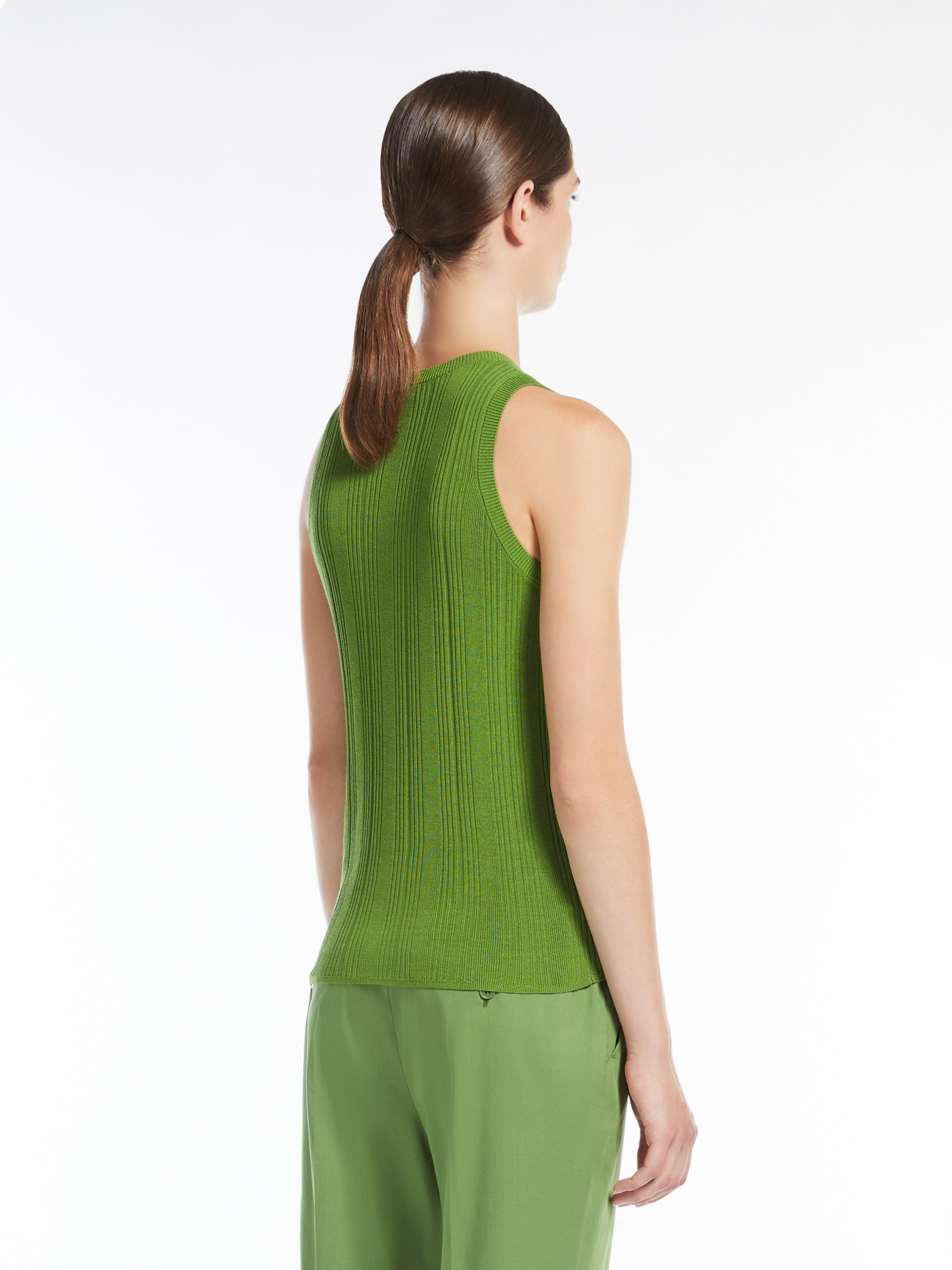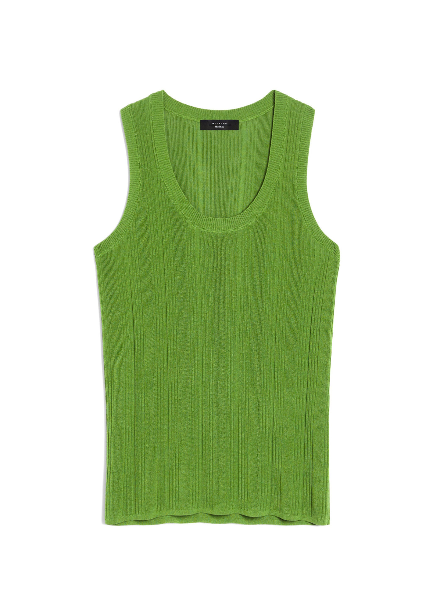 Топ без рукавів із пряжі з додаванням віскози. Модель має ребристу фактуру. Виріб з круглим вирізом, широкими бретелями та облягаючим кроєм дозволить підкреслити жіночний силует.