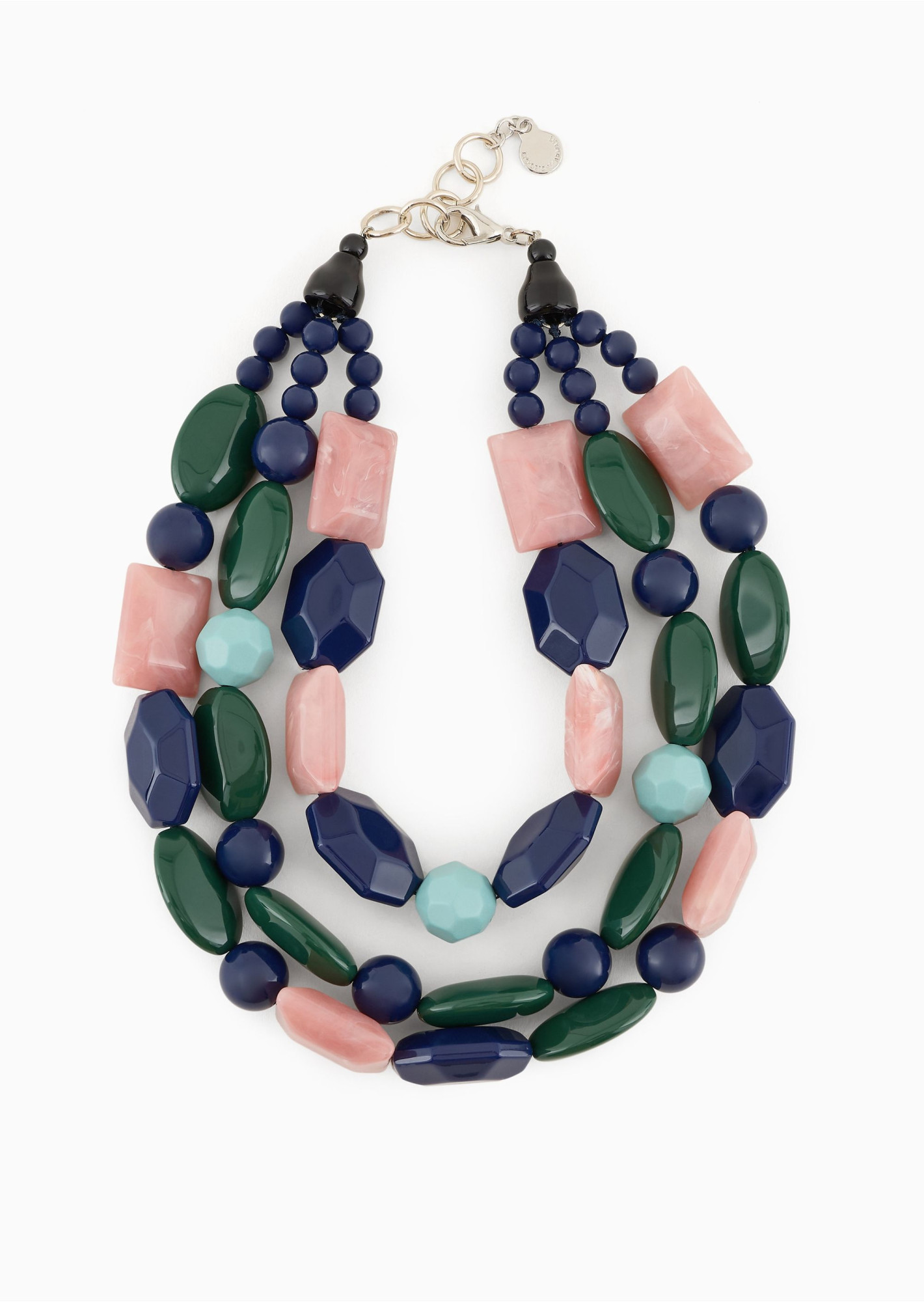 Кольє багатониткової структури з огранованим камінням, що чергуються з контрастними геометричними елементами.