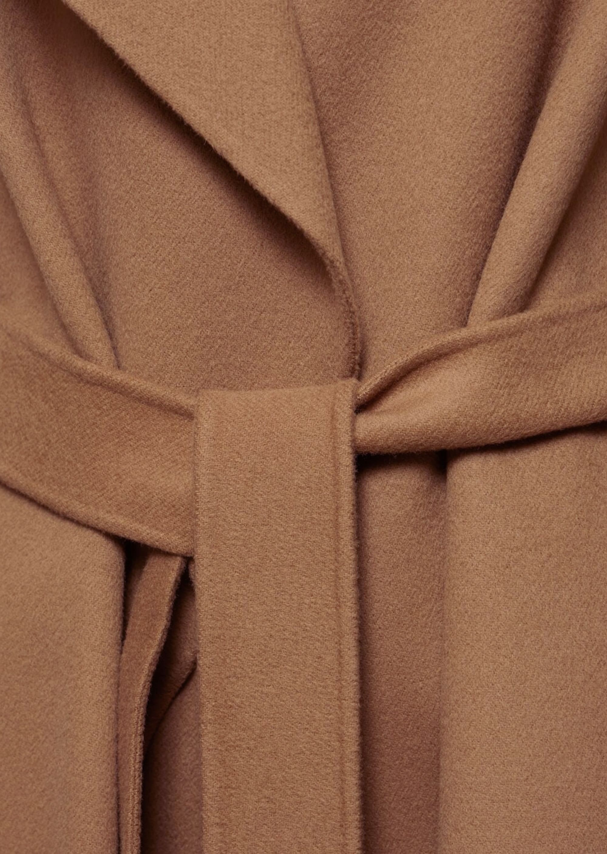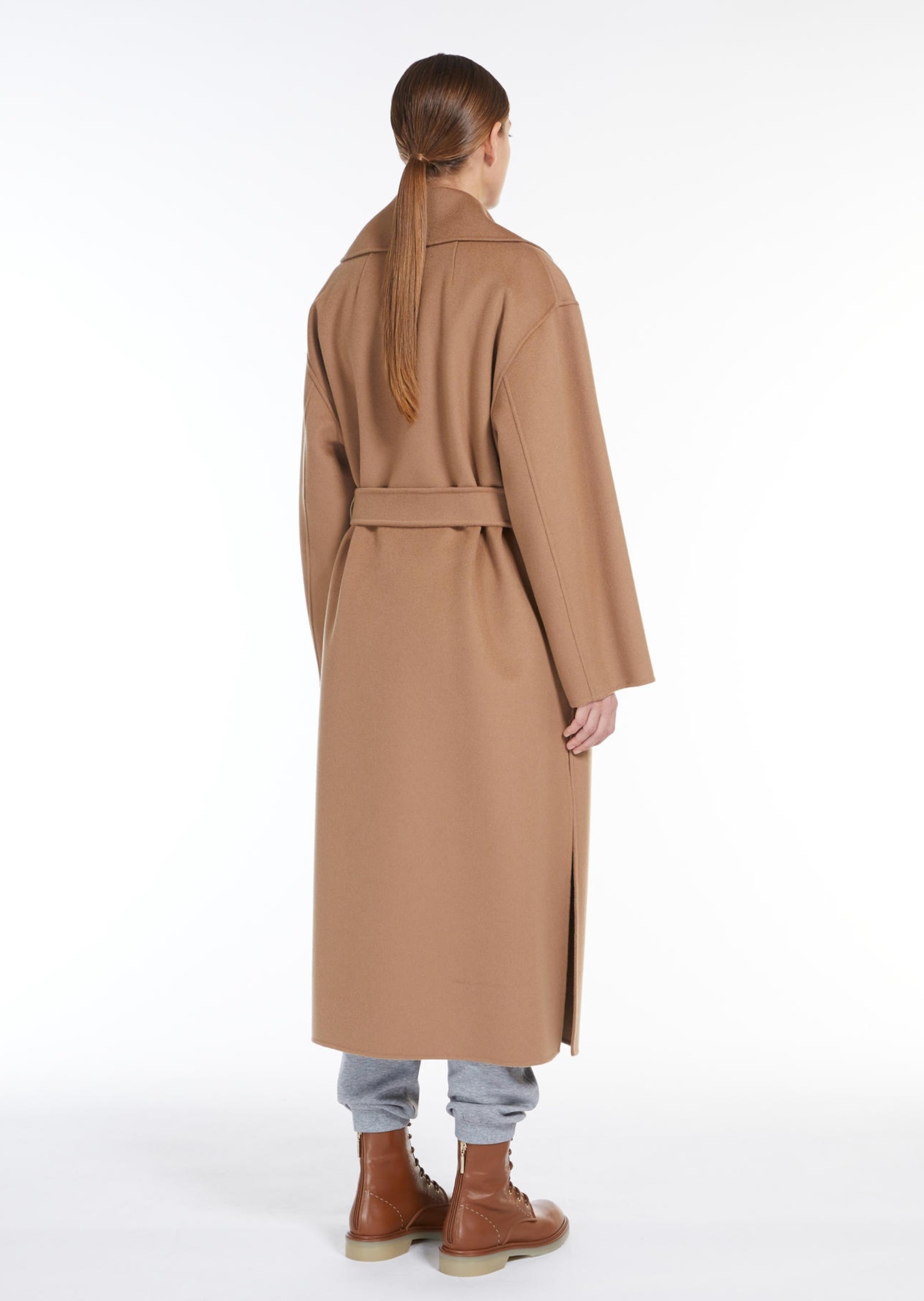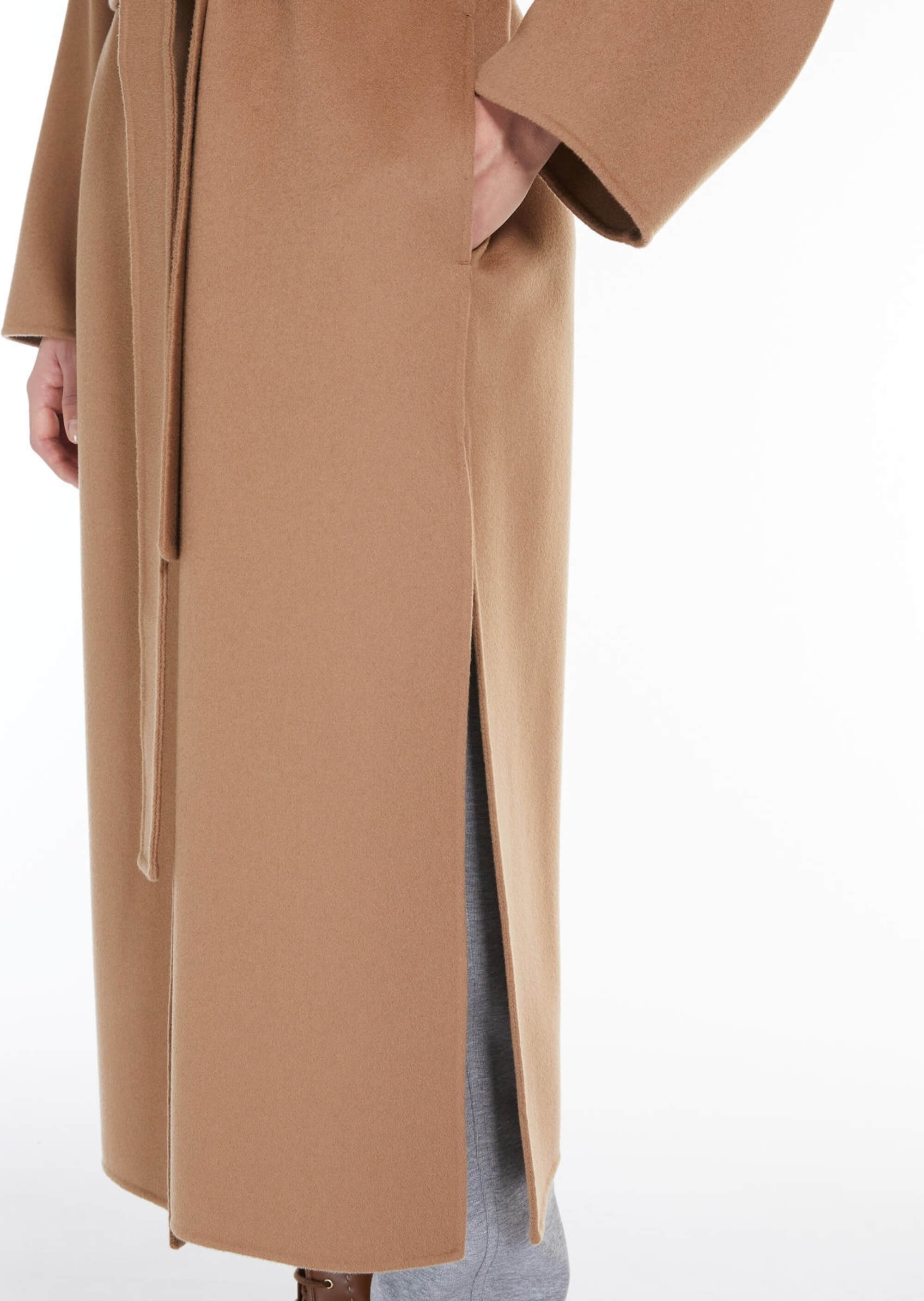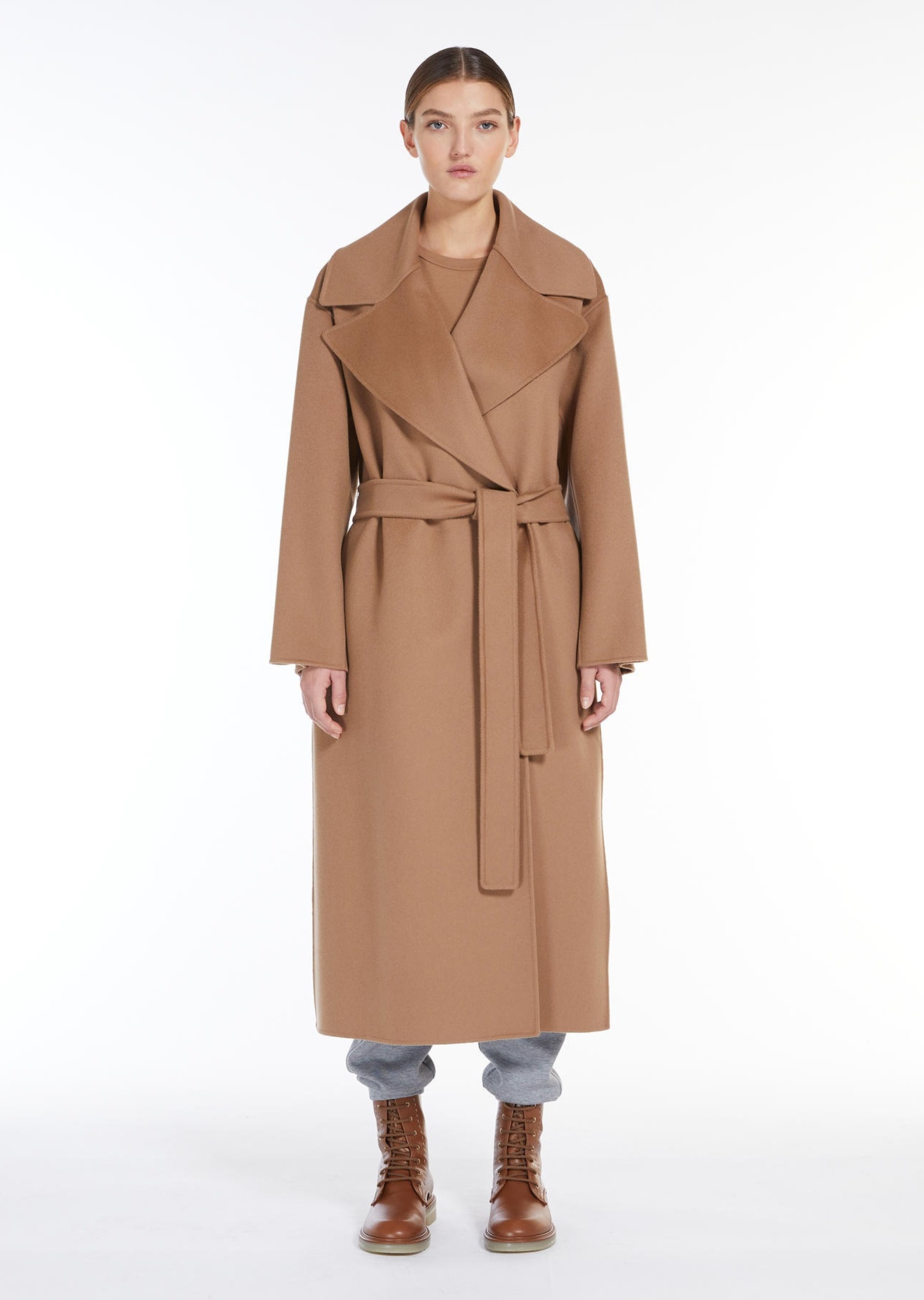 Довге пальто, виготовлене з тонкої двосторонньої тканини з чистої вовни. Цей фасон відрізняється трохи розкльошеним донизу силуетом, широким коміром з лацканами та кишенями в бічних швах. Ремінь у тон підкреслює лінію талії.