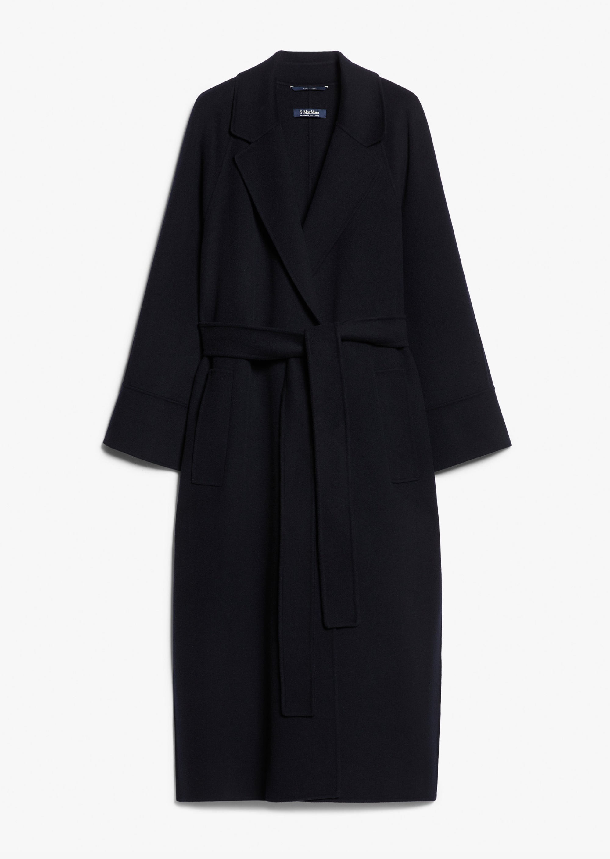 Пальто міді, виготовлене з тонкої двосторонньої тканини з чистої вовни, з глибокими бічними розрізами по подолу. Модель має щільний крій, комір з лацканами, довгі рукави реглан та прорізні кишені. Ремінь у тон підкреслює фігуру.