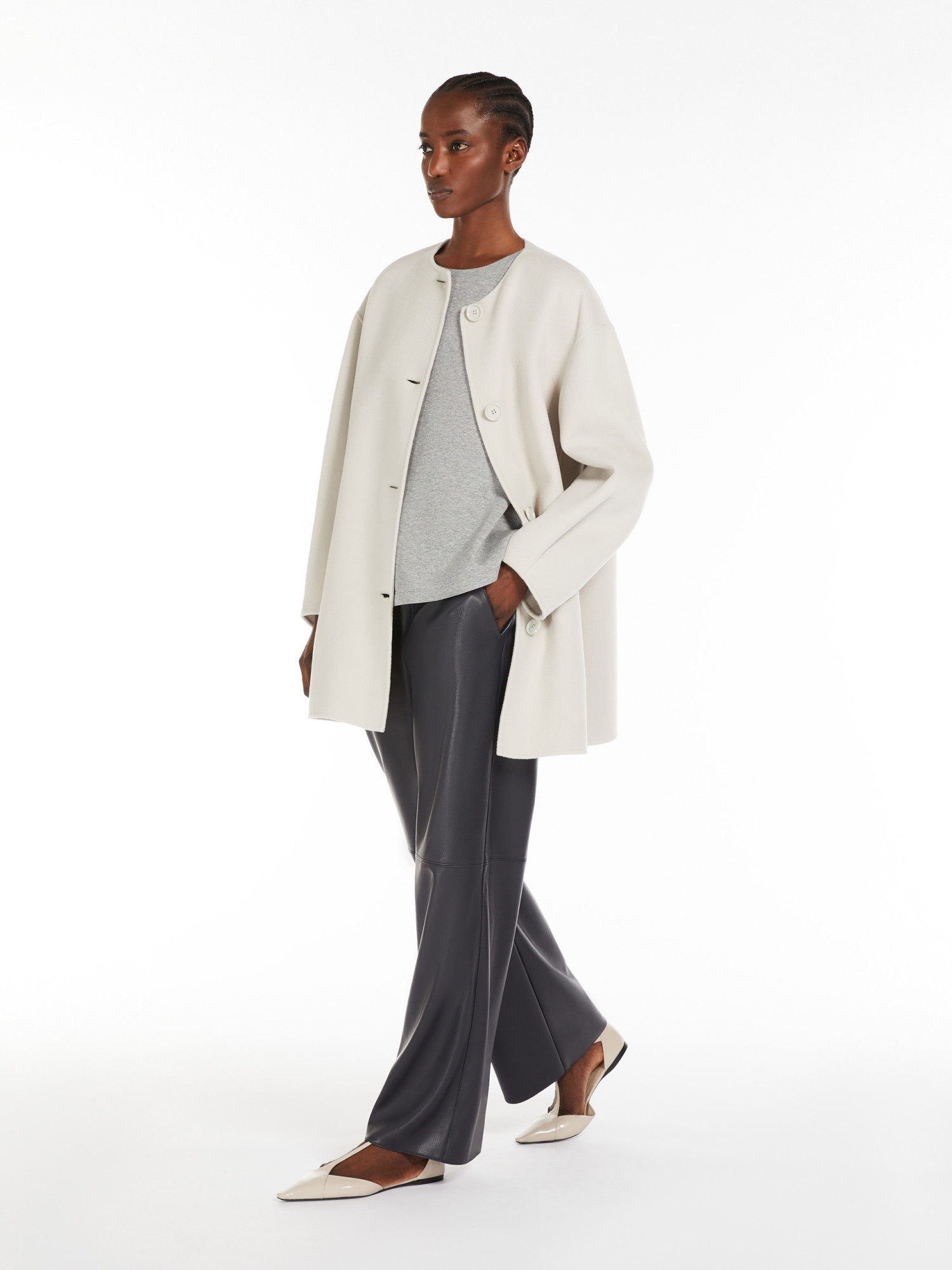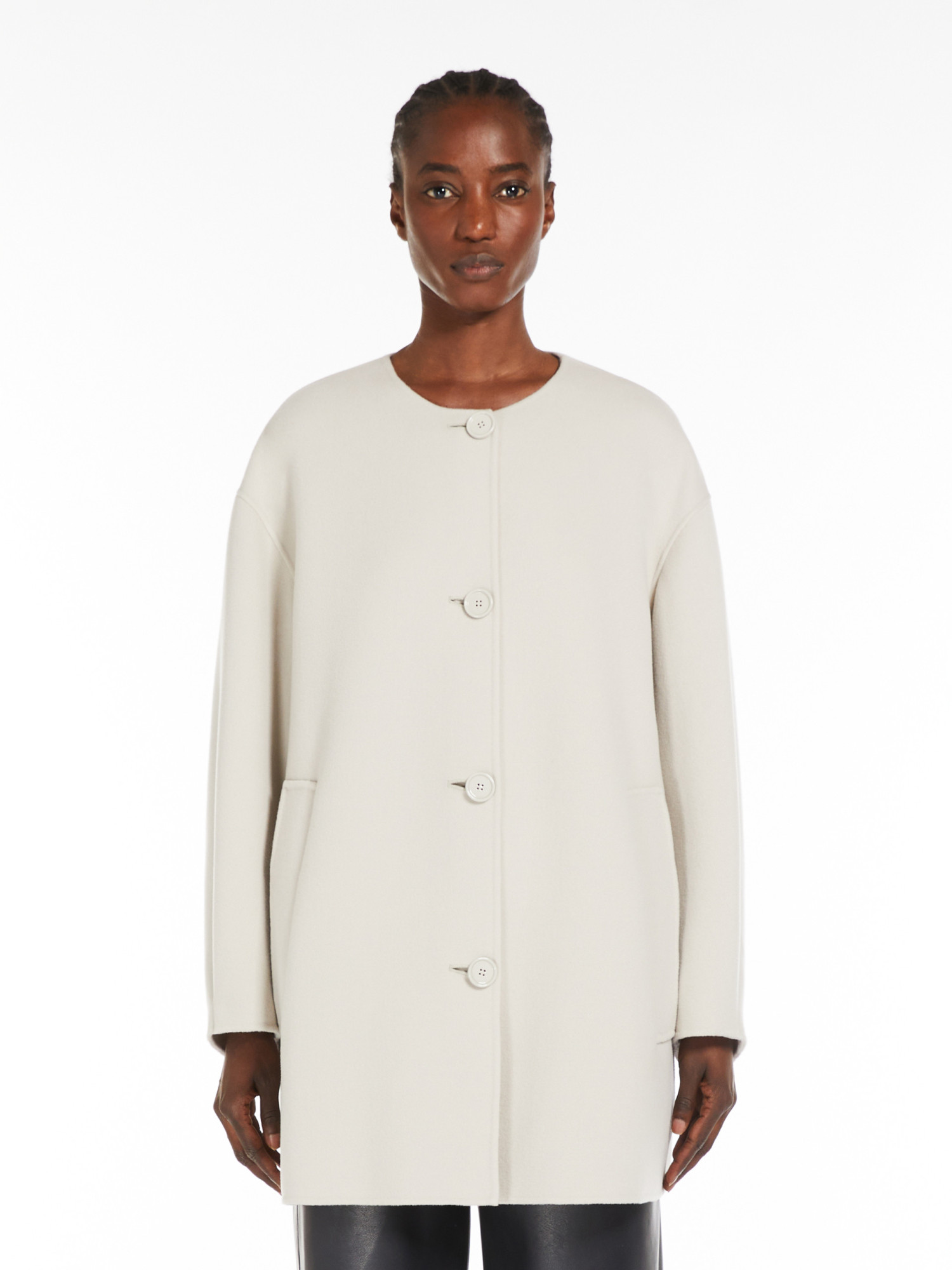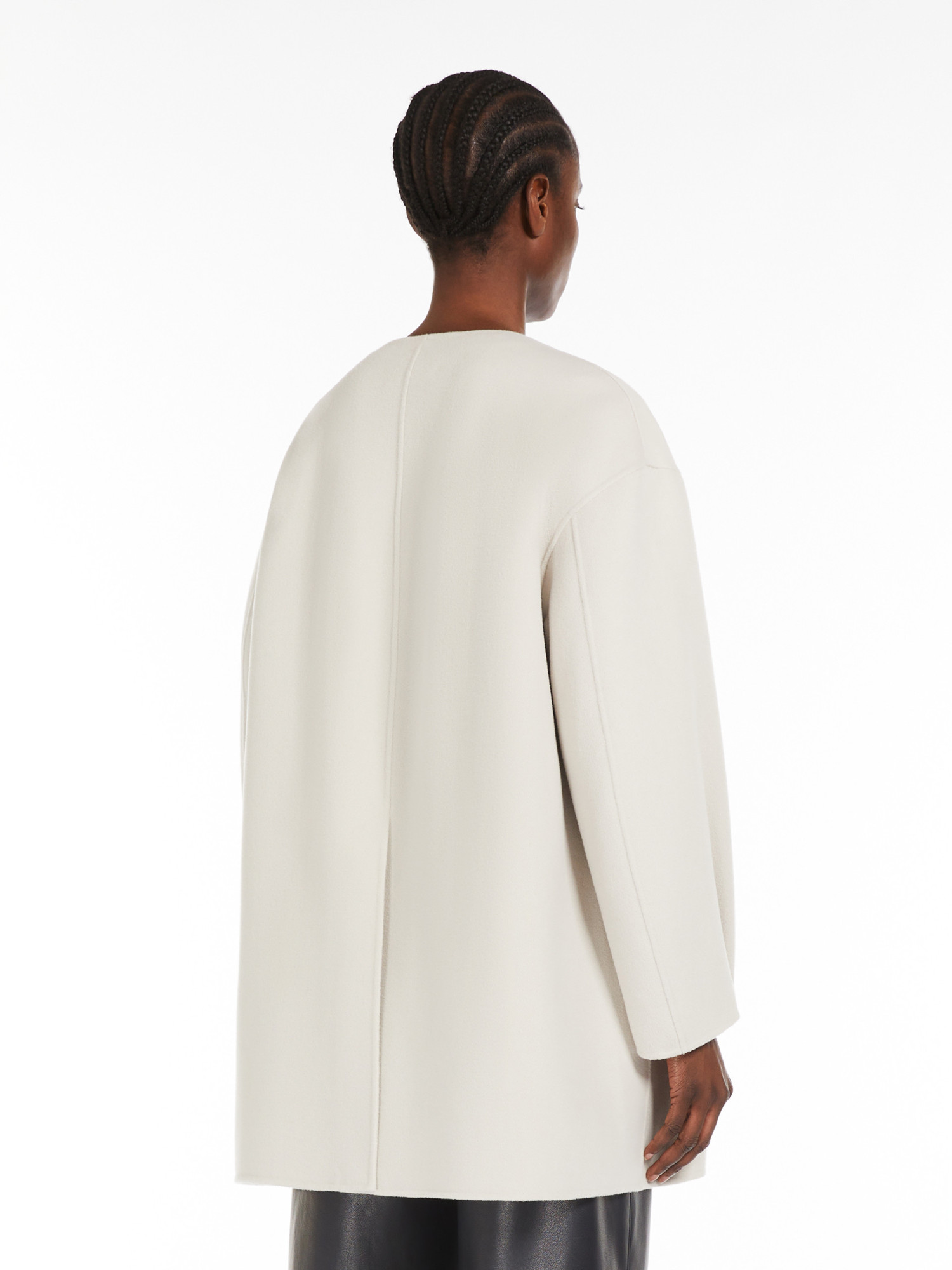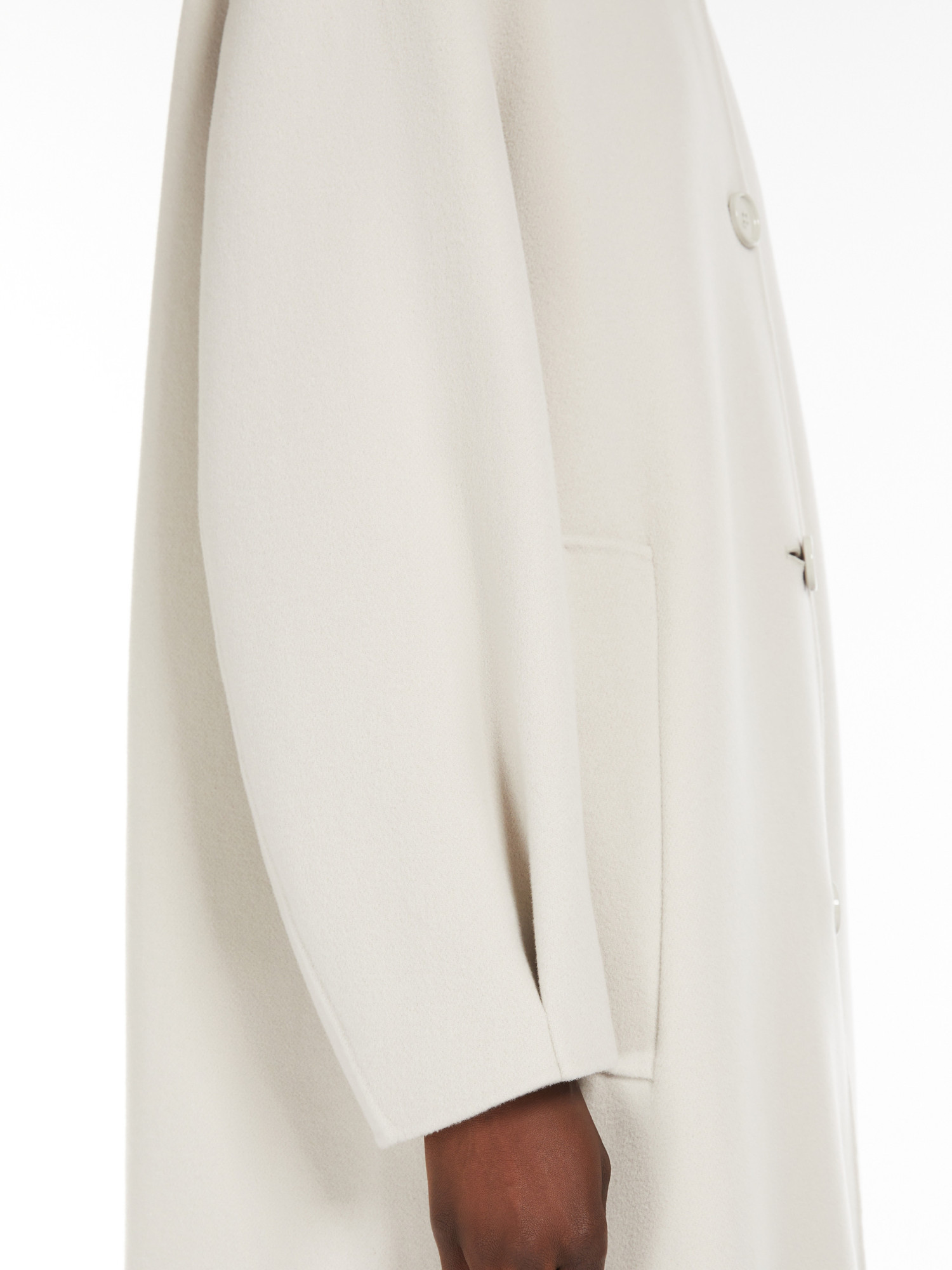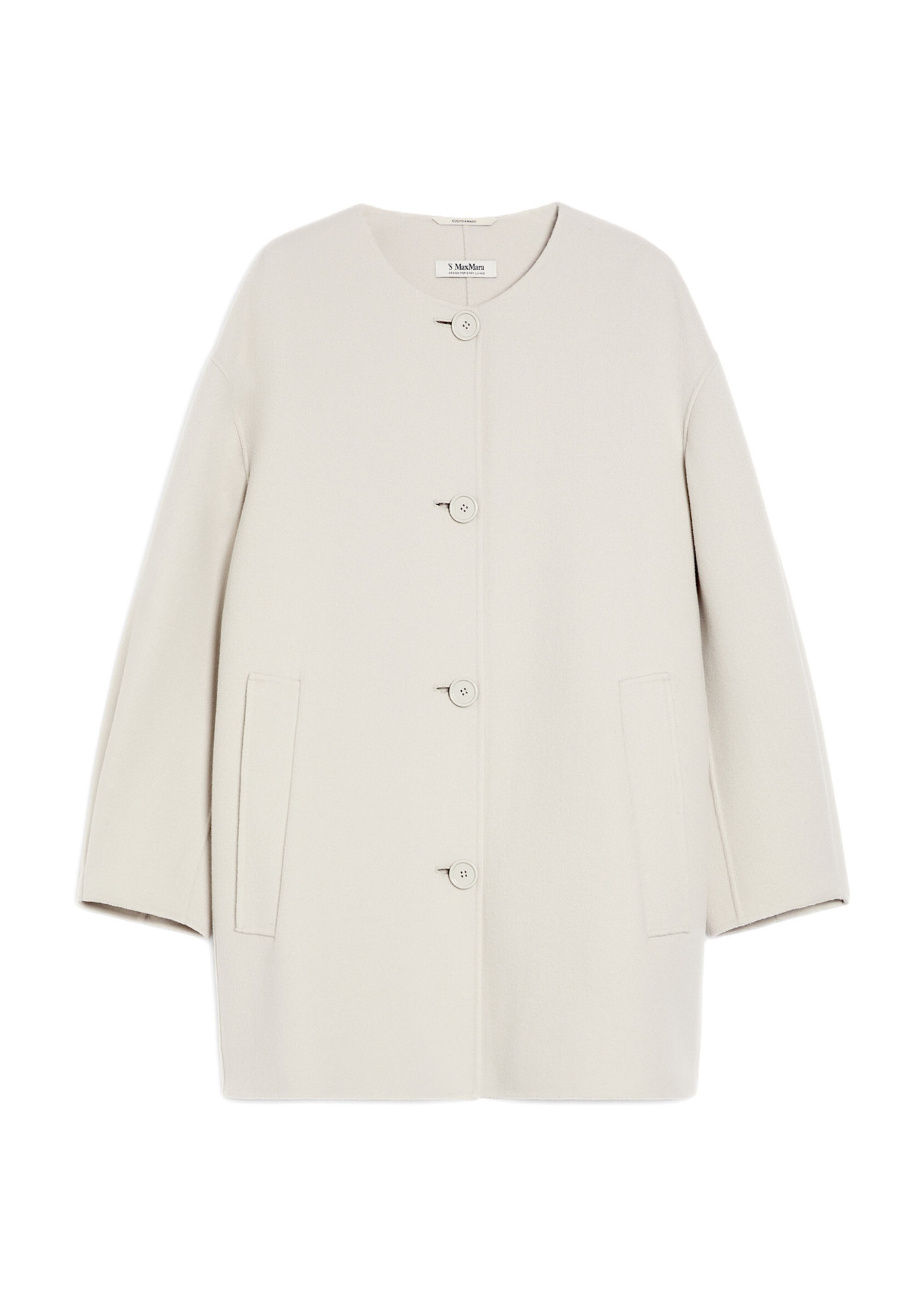 Пальто-міді крою у вигляді кокона, виготовлене з тонкого двостороннього сукна з чистої вовни, зшитого вручну, з круглим вирізом і прорізними кишенями. Модель має рукави вільного крою з невеликою складкою знизу. Видима застібка на ґудзики спереду.