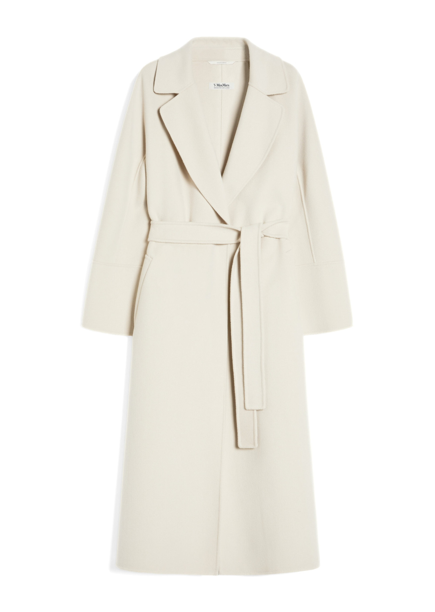 Довге пальто із тонкого, зшитого вручну двостороннього шерстяного сукна. Злегка розкльошена модель має комір з лацканами, довгі рукави з манжетами та прорізні кишені. Виріб на поясі, який допоможе підкреслити силует. Ідеальне пальто, щоб створити жіночний, вишуканий образ.