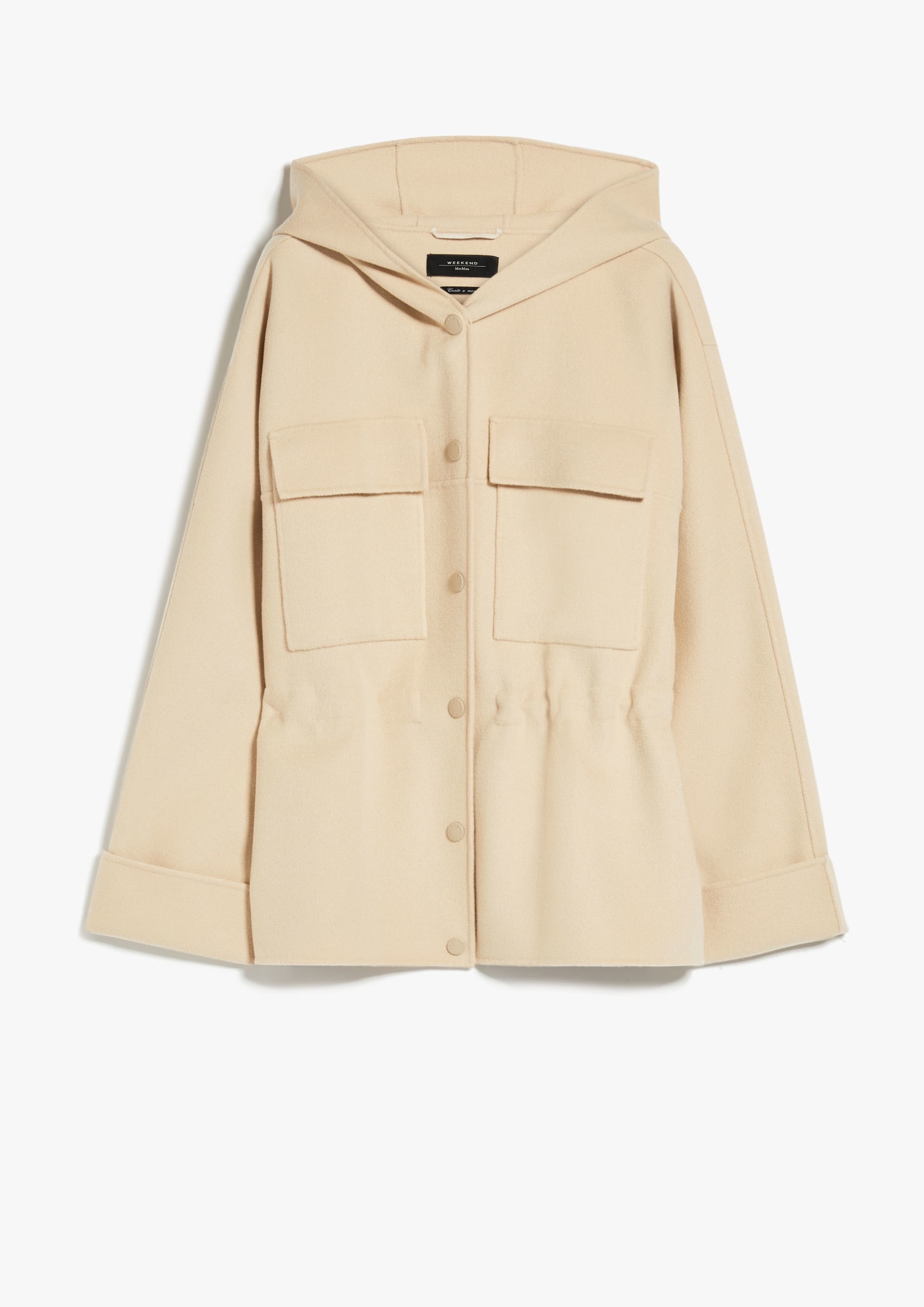 Коротке пальто невимушеного крою з капюшоном і регульованим шнурком на талії з тонкої двобортної чистої вовни. Модель може похвалитися довгими рукавами зі спущеними плечима з відворотами, вирізаною кокеткою спереду та ззаду та великими накладними кишенями в стилі мілітарі спереду. Видима застібка на гудзики спереду.
